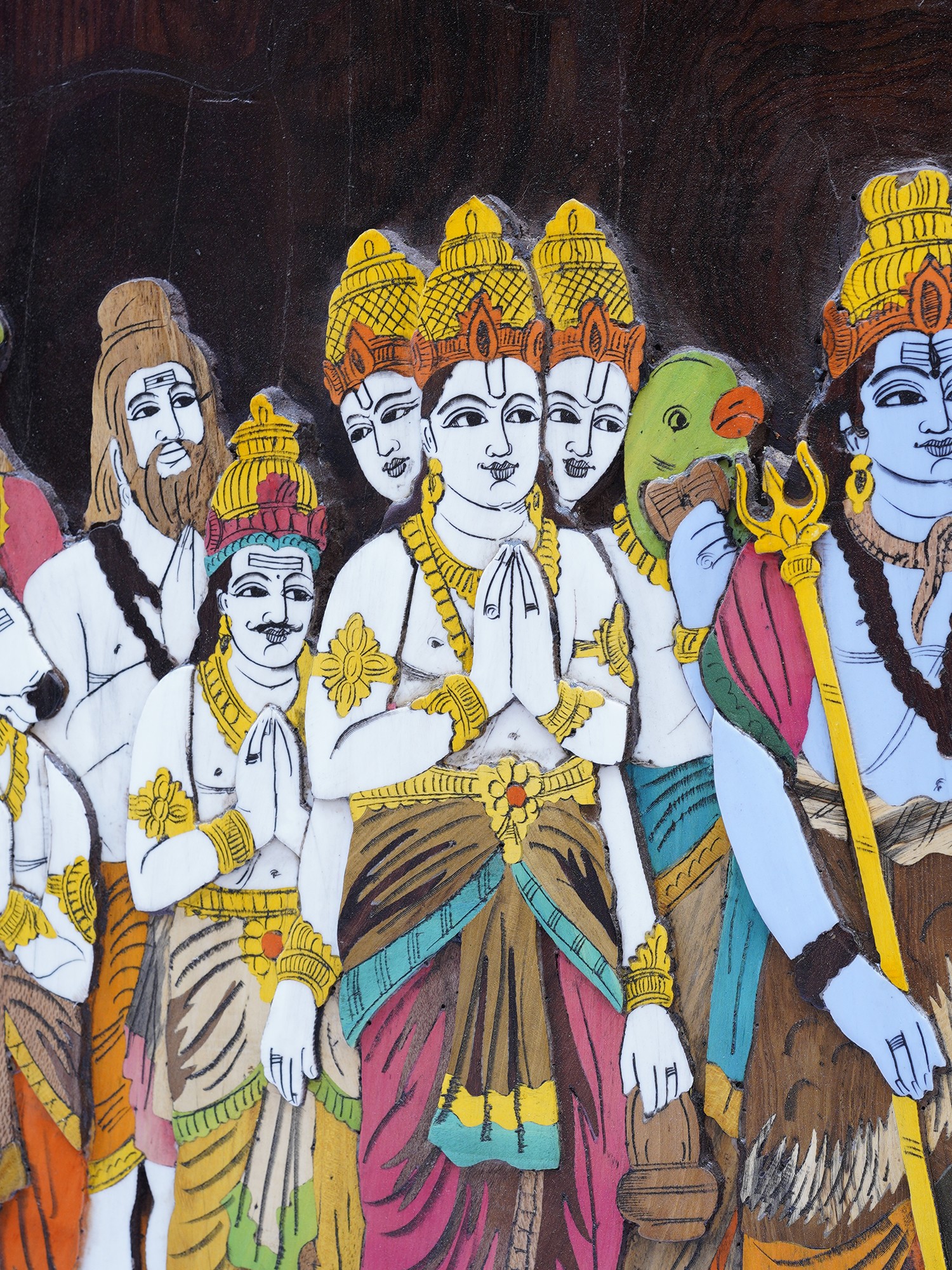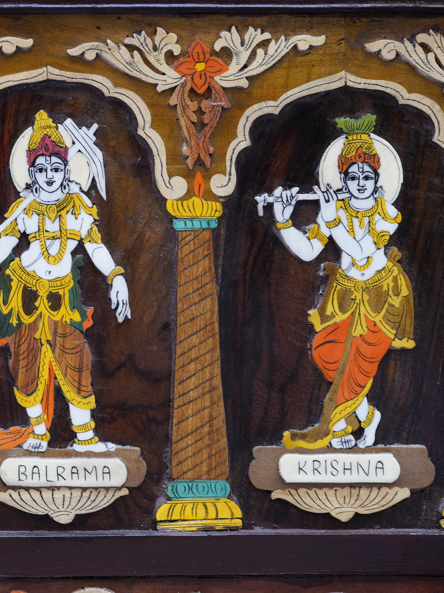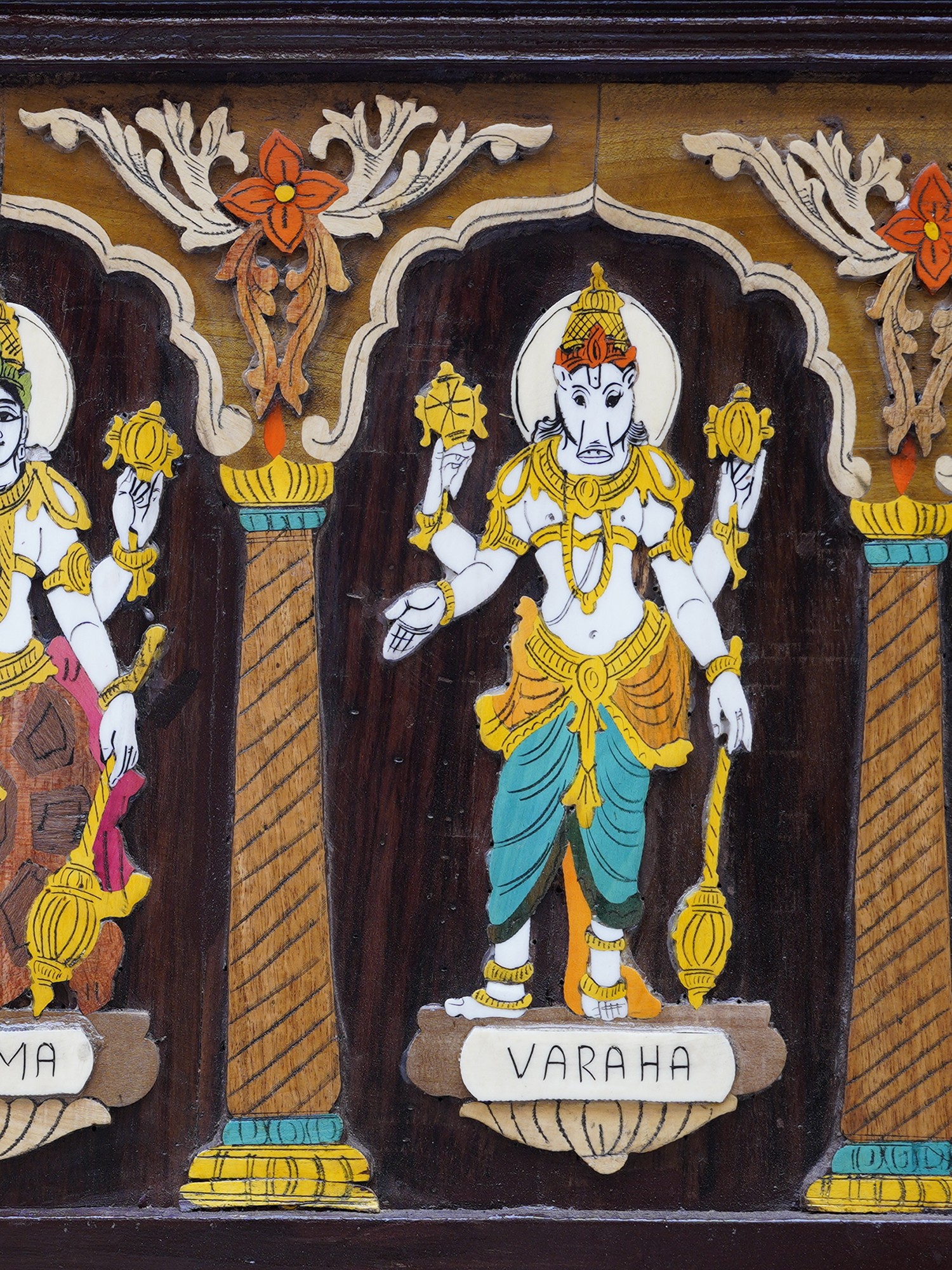 This panel draws inspiration from the profound tales of Vaishnavism, celebrating the divine descent of Lord Vishnu in various forms to restore dharma and protect creation. The depiction of the Srinivasa Kalyanam is particularly significant, representing the auspicious union that symbolizes prosperity and divine blessing. This piece resonates with the devotional spirit and the artistic heritage of South India, particularly the Mysore school of art known for its intricate inlay work.