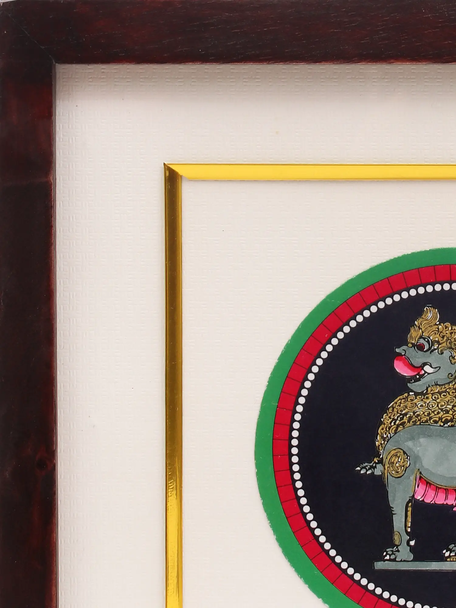This Framed Ganjifa Painting, is a watercolor on paper masterpiece, showcasing a Yali in vivid detail. Here the Yali stands magnificently enclosed inside a colorful circular frame and the painting is secured inside a regal wooden frame. This mythical creature, symbolic in Indian art, embodies a blend of various animals and divine attributes. The Yali represents strength, courage, and protective energy in Hindu culture.