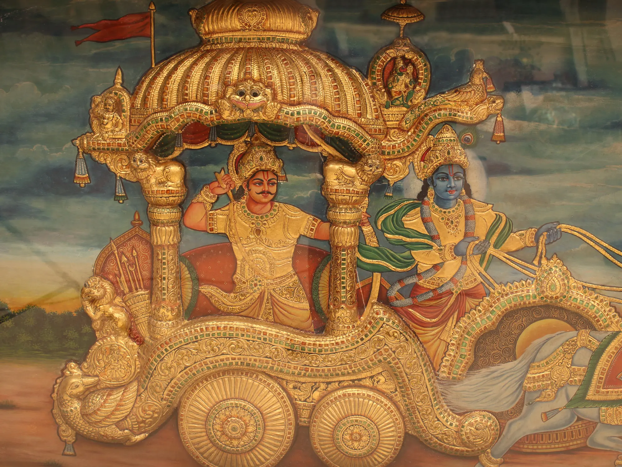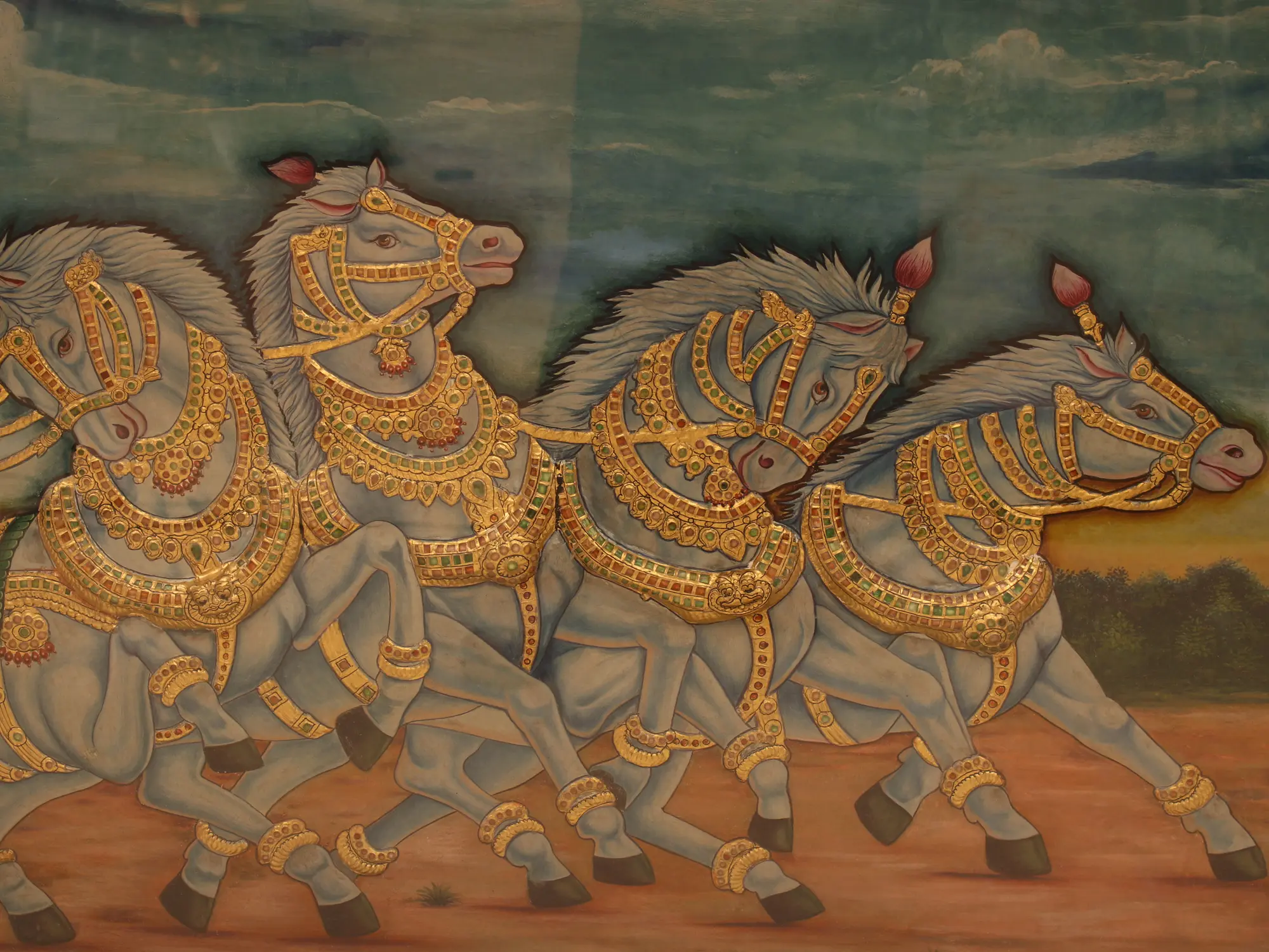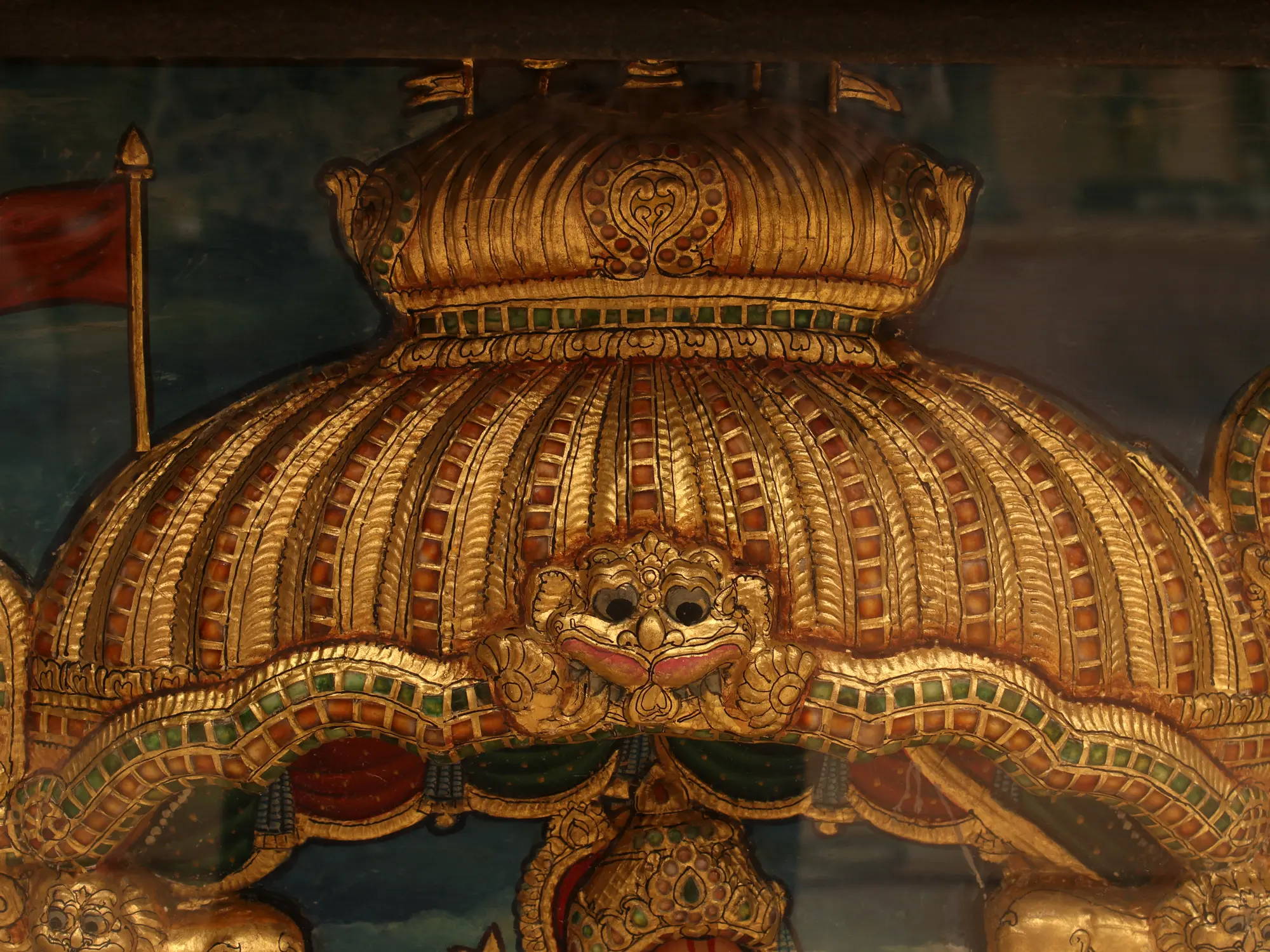 This Tanjore painting is about profound spiritual insight. It holds within it the timeless essence of the Gita's teachings, the grandeur of tradition, and the blessings of divine wisdom. In his wise avatar stands Lord Krishna, the divine charioteer and narrator of the Bhagavad Gita. His serene countenance radiates wisdom, love, and the timeless truths that he imparts to Arjuna. His inner turmoil and quest for understanding are palpable as he listens to the sacred discourse. This gorgeous piece guides seekers on their spiritual journey with its inspirational beauty.
