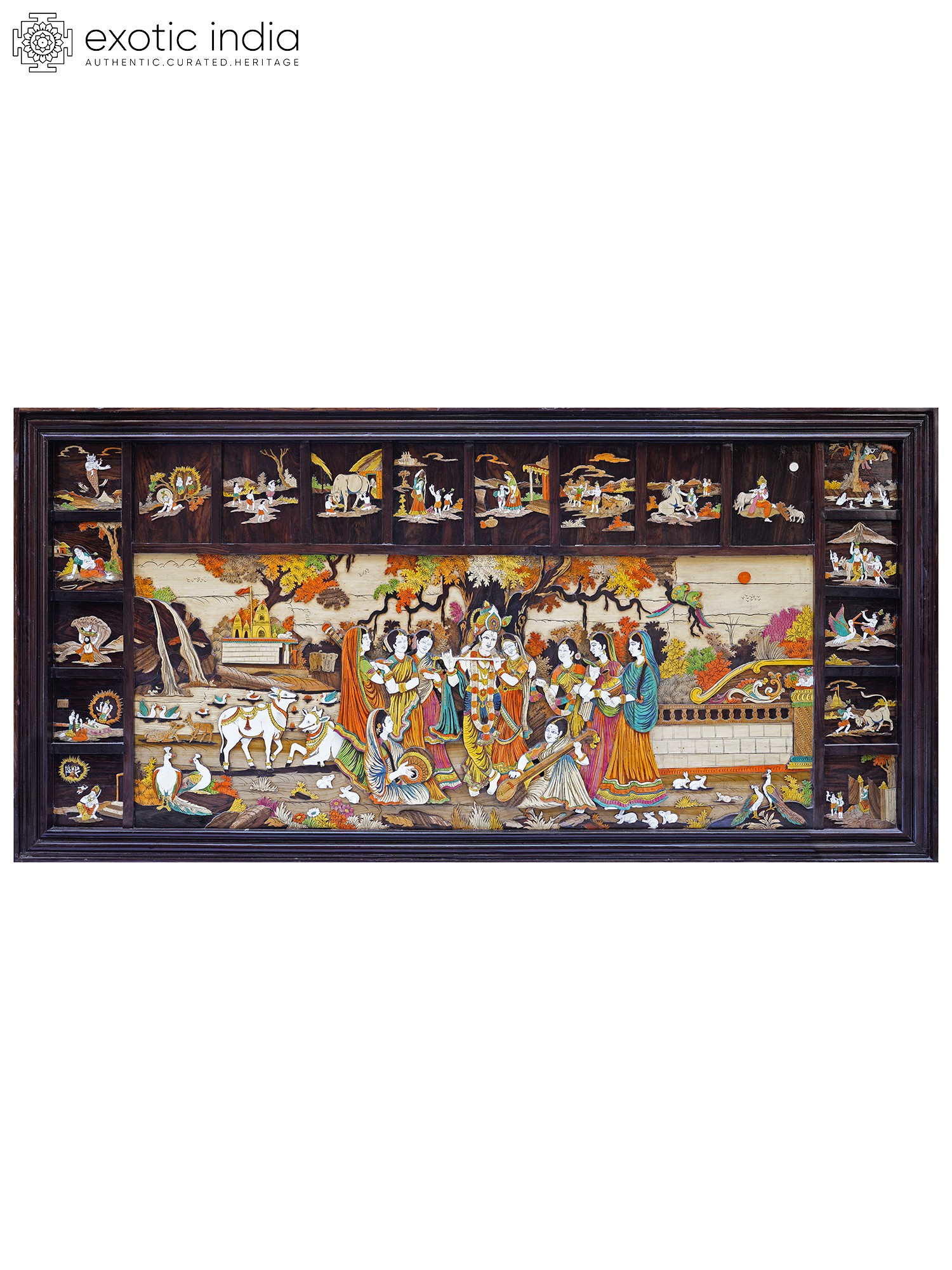 96" The Great Life Story of Radha Krishna | Rosewood 3D Panel with Inlay Work