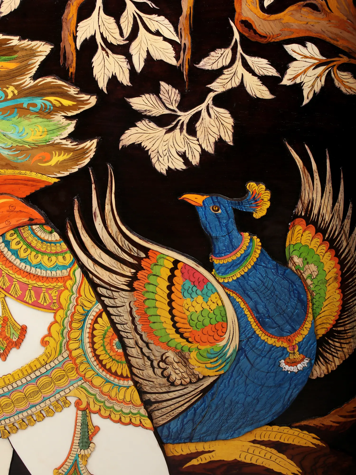 This breathtaking 96-inch masterpiece showcases the profound love between Radha and Krishna, a central theme in Hindu mythology. The intricate details and vibrant colors bring to life the timeless tale of their devotion, a story that resonates through centuries of Indian culture and art. Radha, the epitome of devotion and beauty, and Krishna, the mischievous and enchanting god, are captured in a moment of tender intimacy, their connection palpable in every brushstroke. The artist masterfully uses natural colors to highlight their radiant beauty and the lush surroundings of their divine rendezvous. The inclusion of peacocks, symbolic of beauty and spirituality, further enhances the artwork's captivating essence. The scene is set against a backdrop hinting at the mystical Vrindavan, a place deeply associated with Krishna's childhood and his divine leelas (plays).