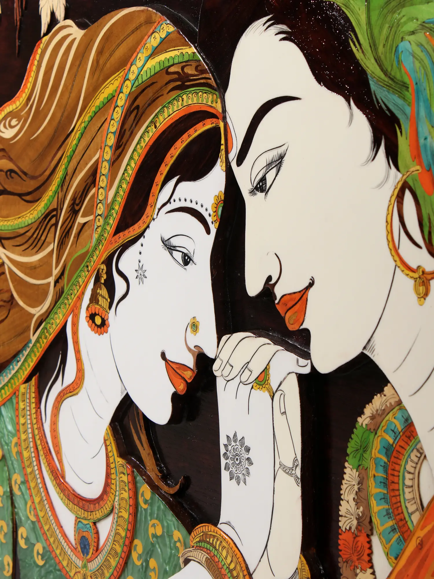 This Superfine 3D Panel in Rosewood with Inlay Work captures the enchanting exchange between Sri Radha and Sri Krishna as they delicately hold hands. The intricate craftsmanship brings this divine moment to life, with the 3D details enhancing the tactile and visual experience. Inlay work enriches the scene with vibrant hues, portraying the cosmic energy exchanged between the divine couple.