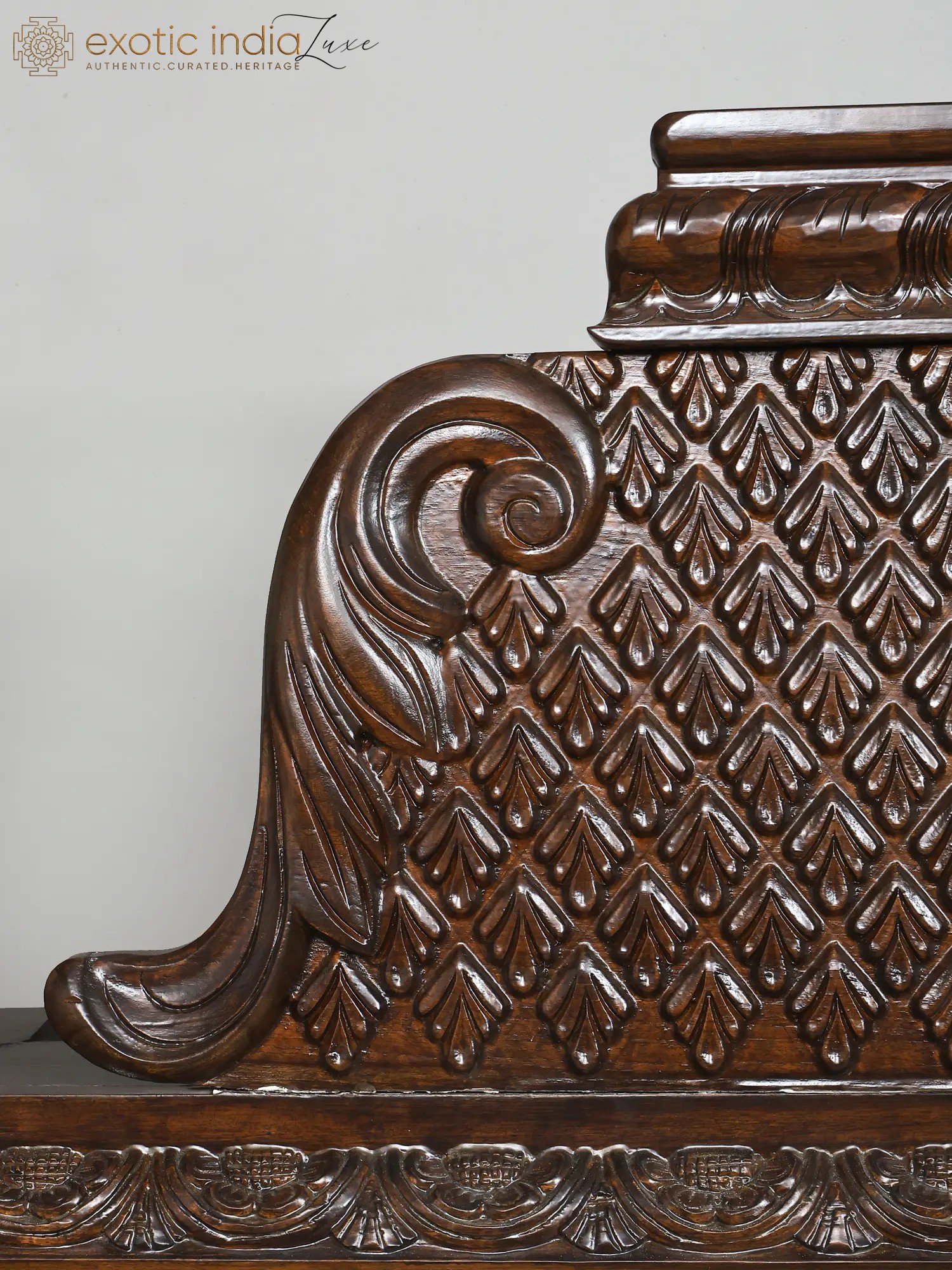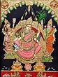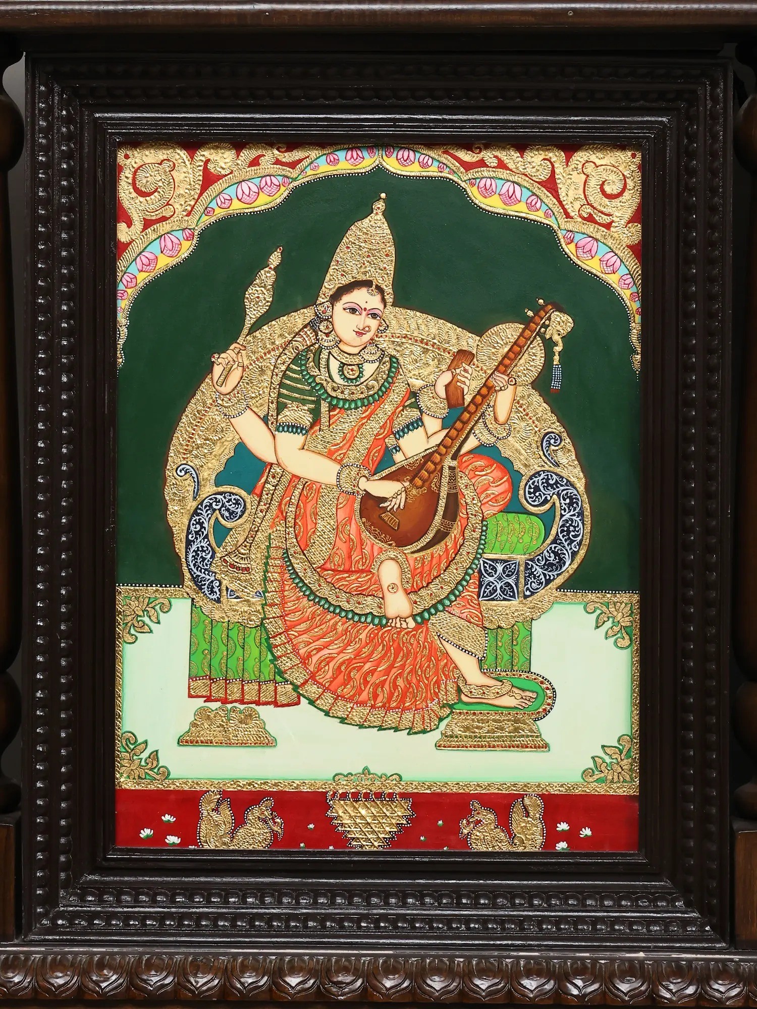 This magnificent, large-scale Tanjore temple frame houses a captivating tableau of three revered Hindu goddesses: Saraswati, Rajarajeshwari, and Lakshmi. Each deity is rendered in the traditional Tanjore style, characterized by its vibrant colors, intricate details, and the opulent use of 24-karat gold leaf. The entire ensemble is ensconced within a grand, intricately carved wooden frame, designed to evoke the grandeur of a temple shrine. This piece is not merely a decorative item but a profound statement of devotion and an embodiment of spiritual aspirations. ––––––––––