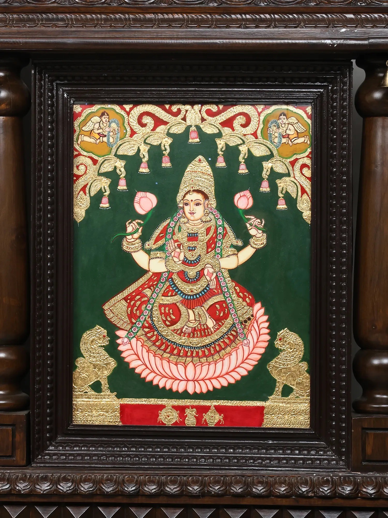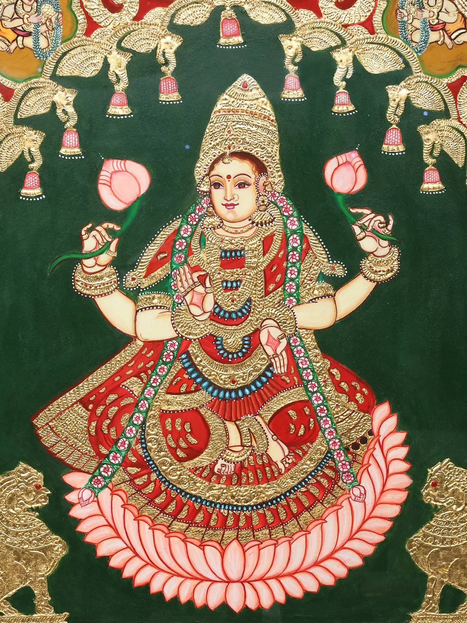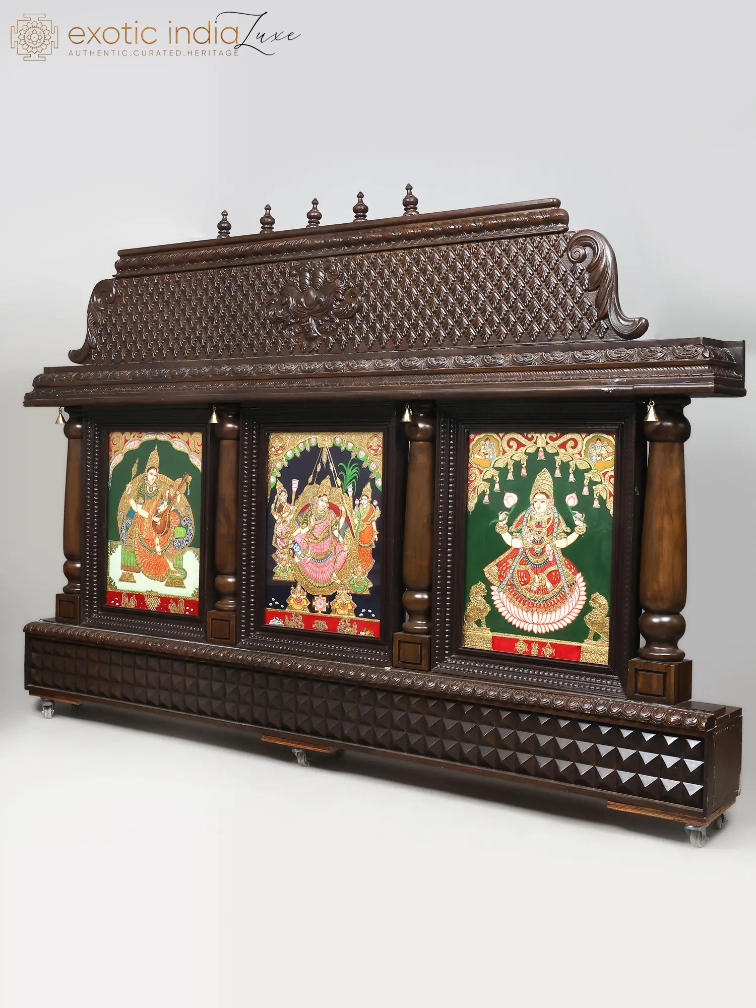 This exceptional Tanjore piece is more than just art; it's a devotion rendered in exquisite detail. The traditional Tanjore paintings are renowned for their rich colors, derived from natural pigments, and the liberal application of 24-karat gold leaf, which imparts a divine luminescence. The intricate wood carving of the temple frame further elevates the sanctity and visual appeal of the artwork, creating a sense of awe and reverence. The sheer scale of this piece makes it a commanding presence, suitable for grand homes, temples, or institutions seeking to imbue their space with divine energy and aesthetic grandeur. It serves as a powerful reminder of the interconnectedness of knowledge, power, and prosperity, as embodied by these three magnificent goddesses.
