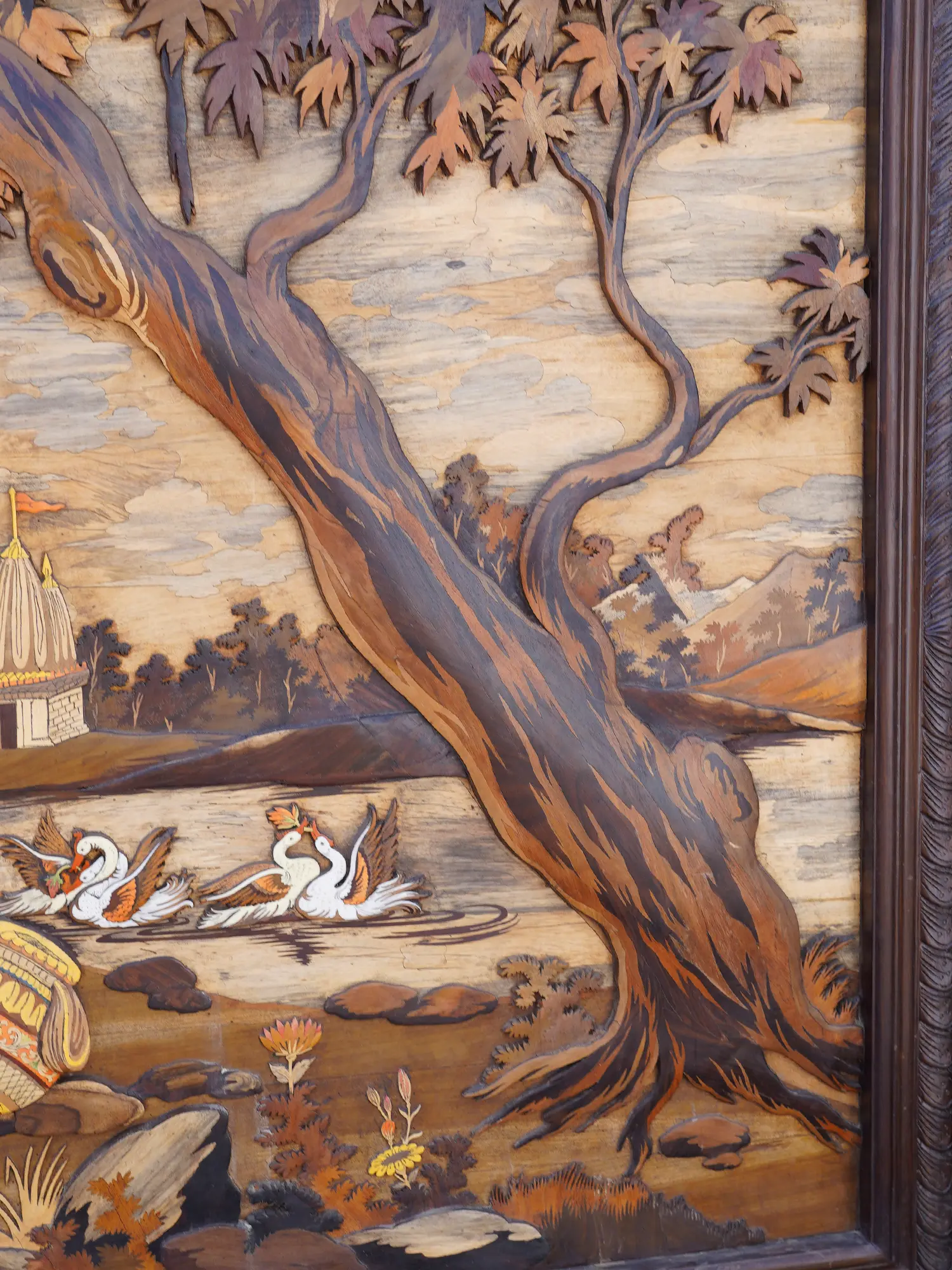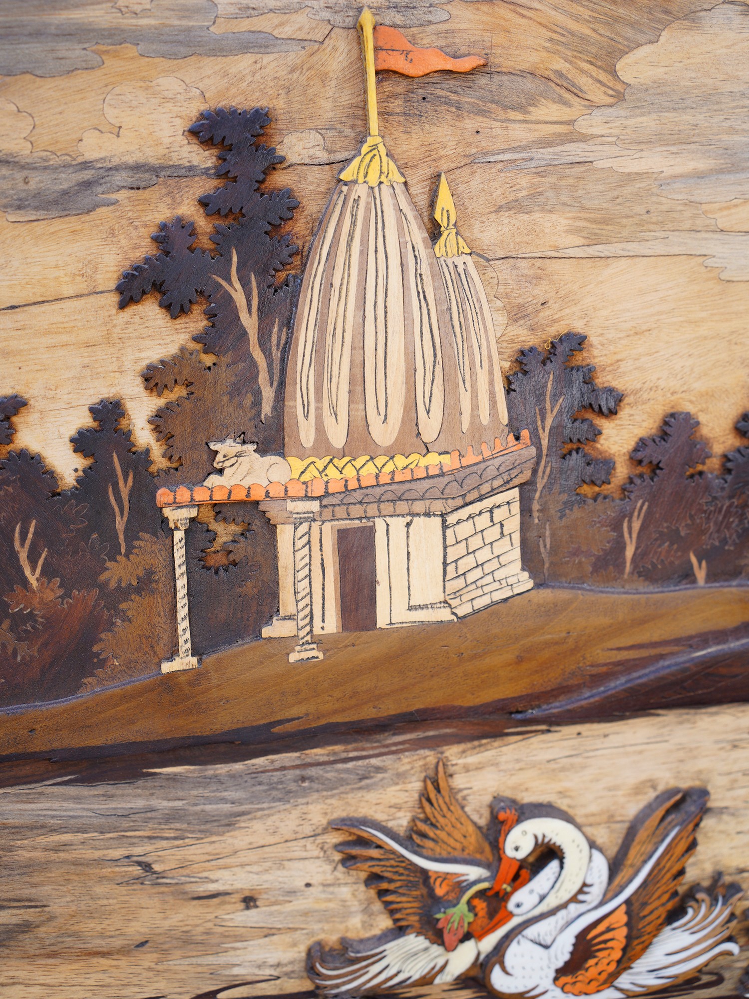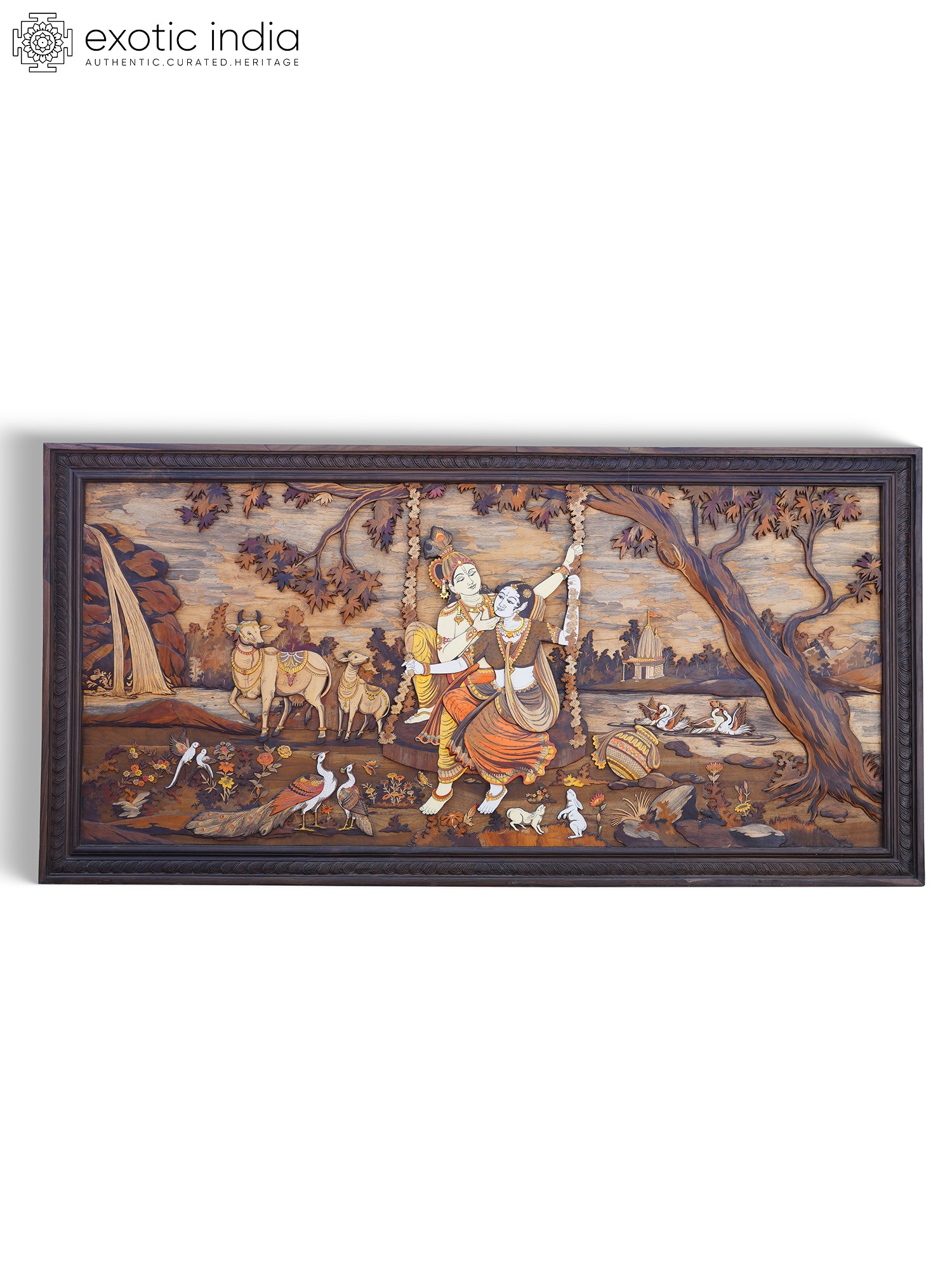 72" Large River Side Seated Radha Krishna | 3D Art Wood Panel with Inlay Work