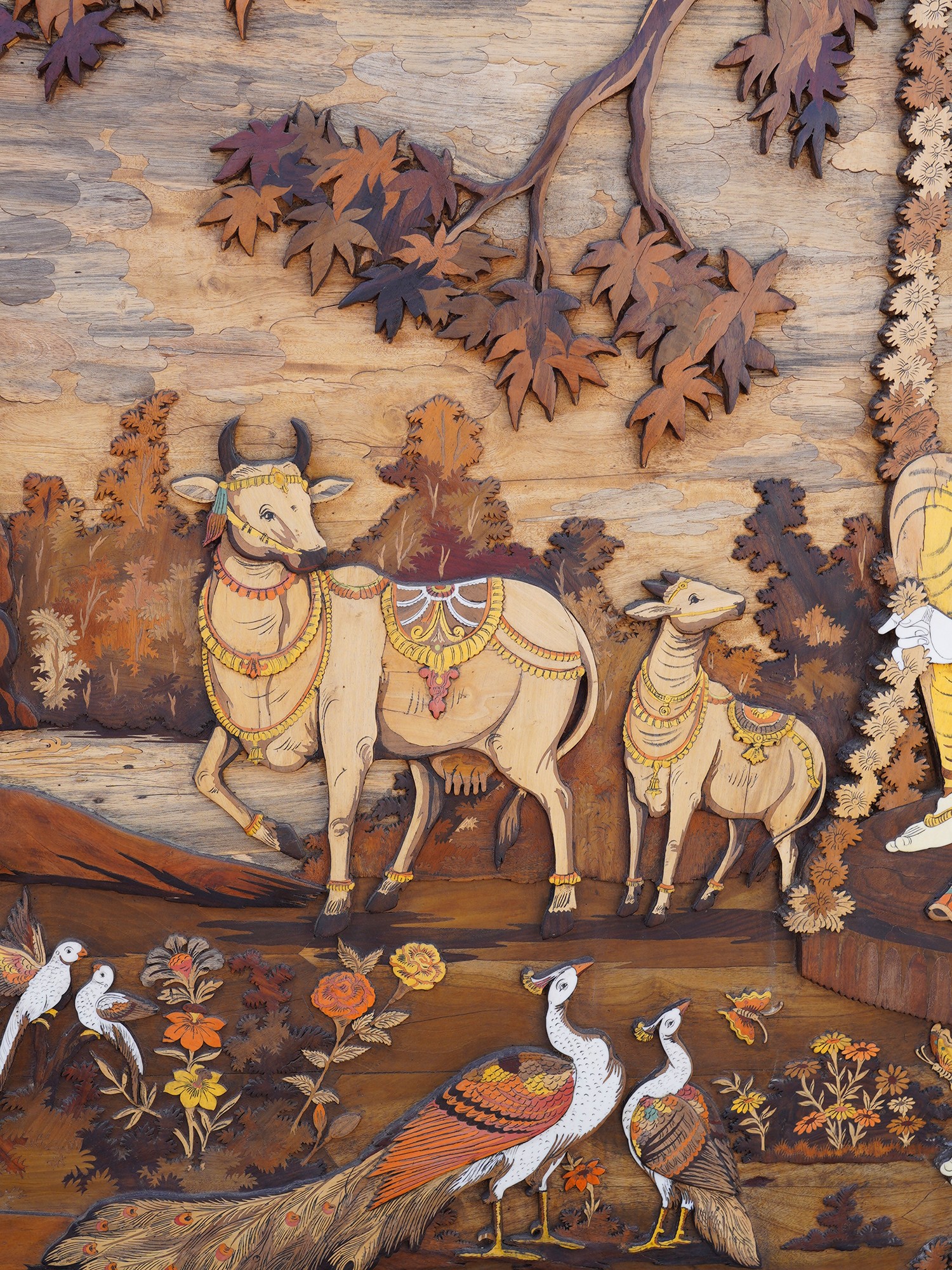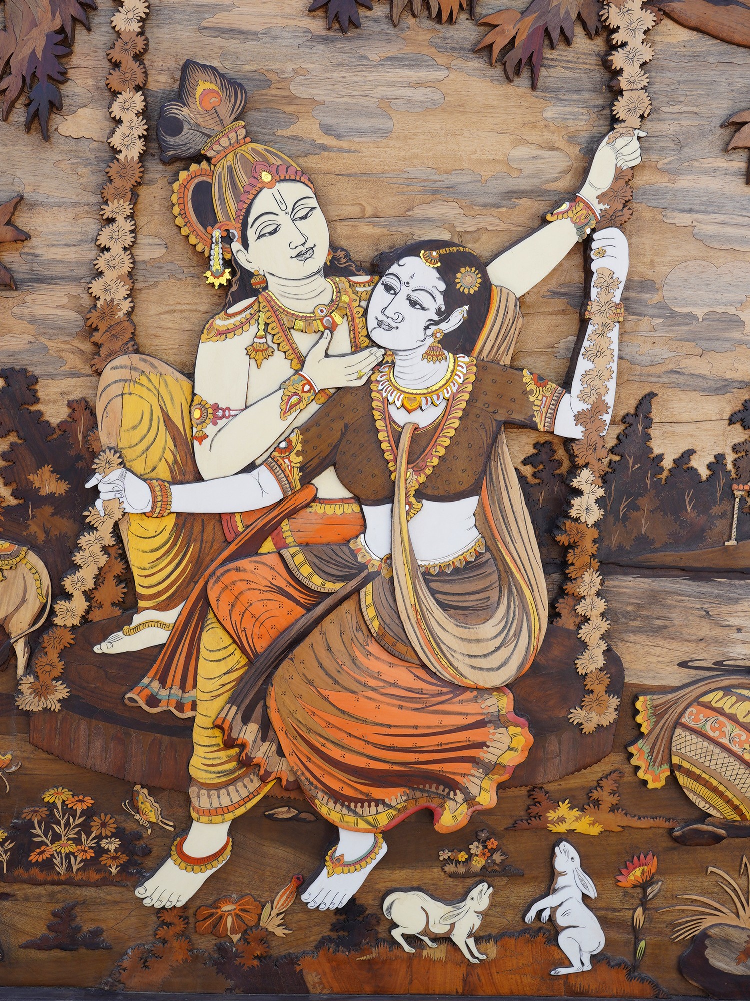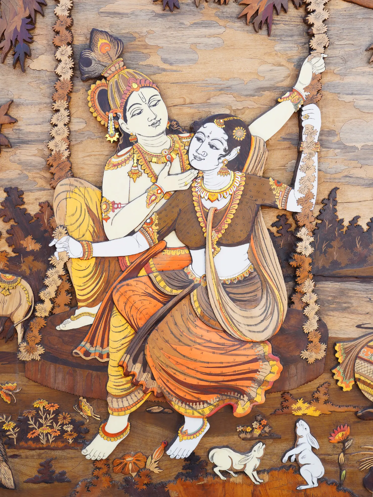 72" Large Fluting Radha Krishna with Gopis | 3D Wood Panel with Inlay Work