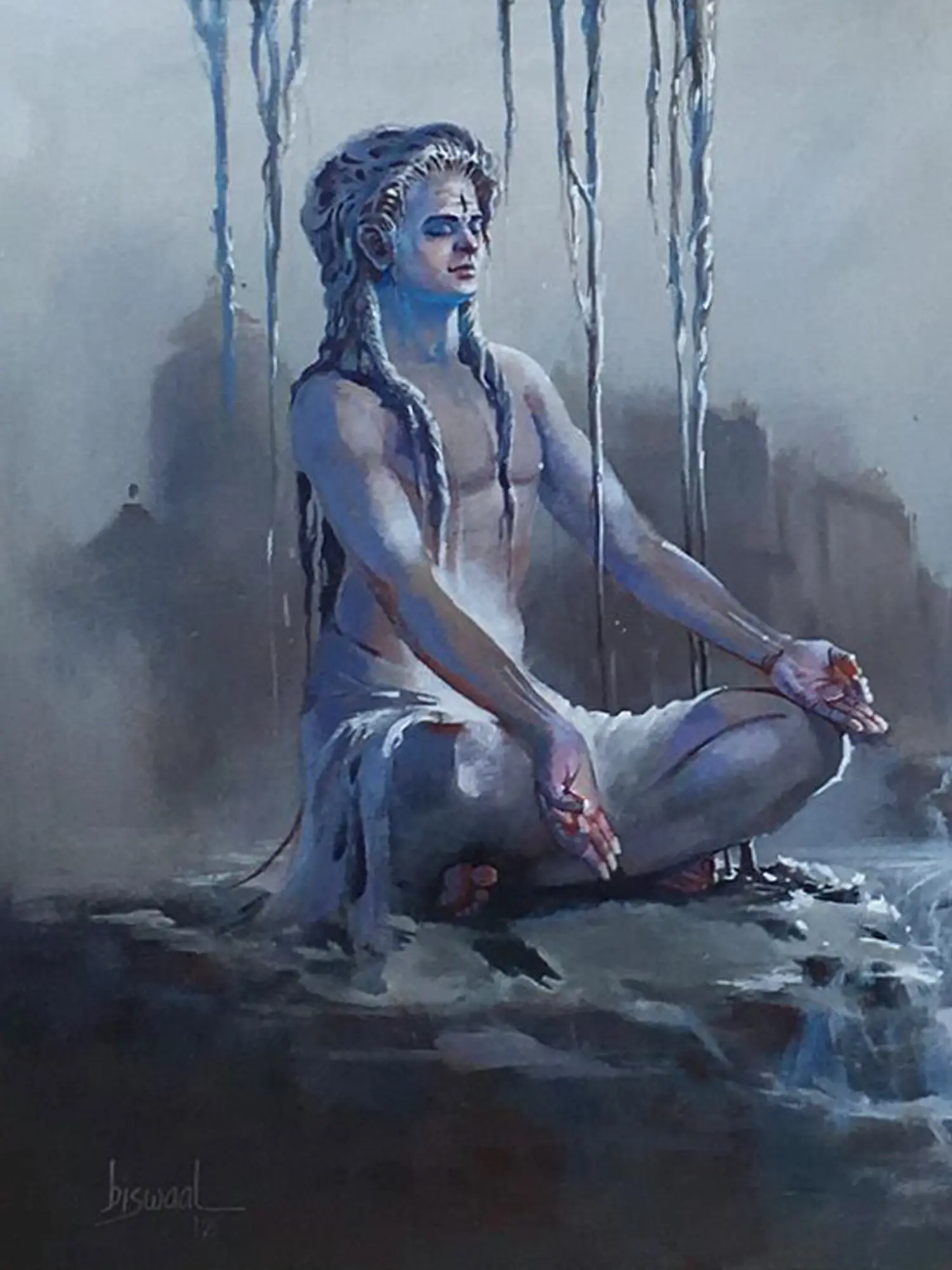 This artwork draws inspiration from the rich tapestry of Hindu mythology, specifically the veneration of Lord Shiva as the AdiYogi, the first yogi and embodiment of consciousness. It resonates with the ancient traditions of yoga and meditation, offering a visual narrative of spiritual awakening and inner stillness. You can feel the timeless essence of this sacred imagery.