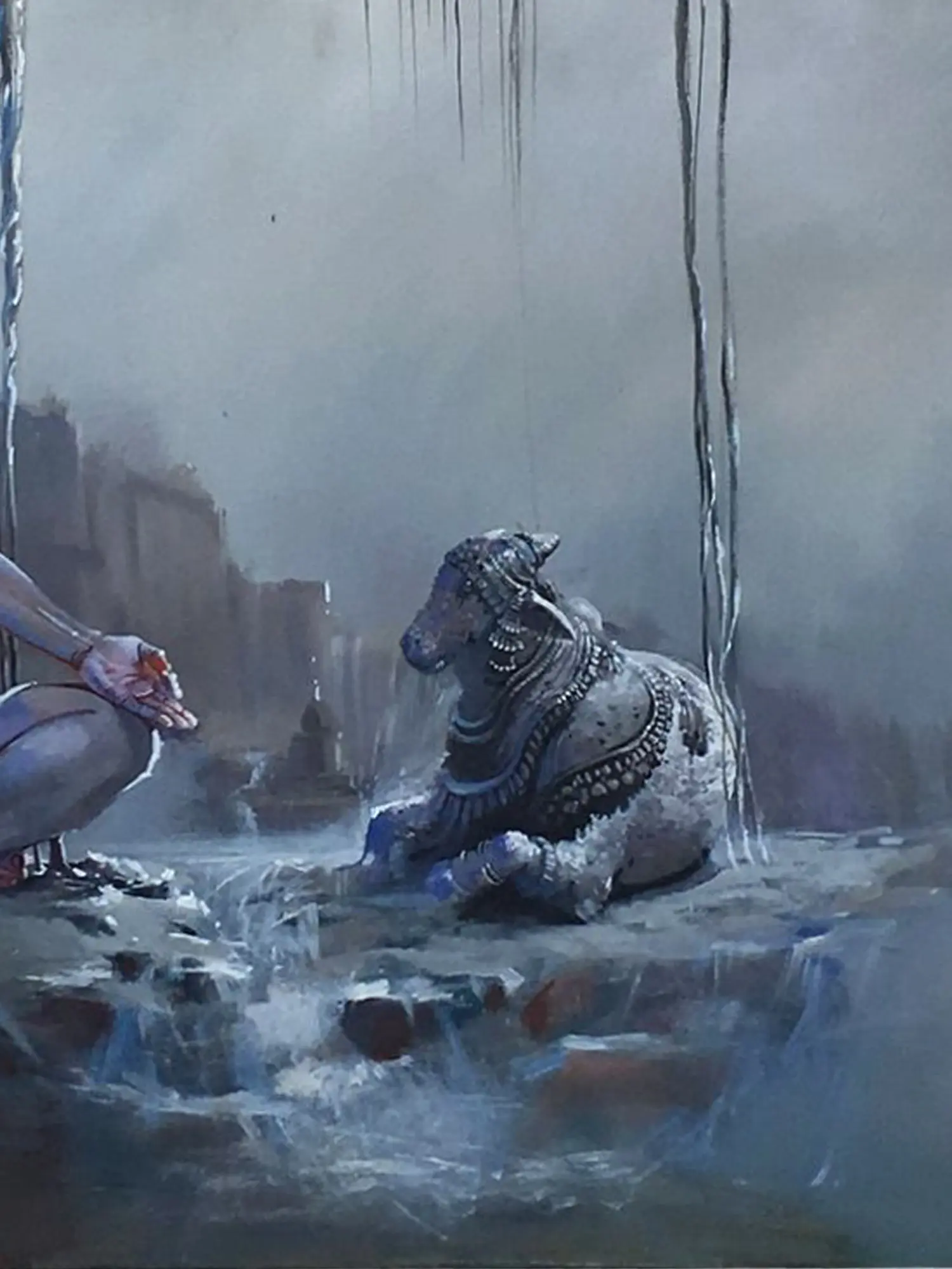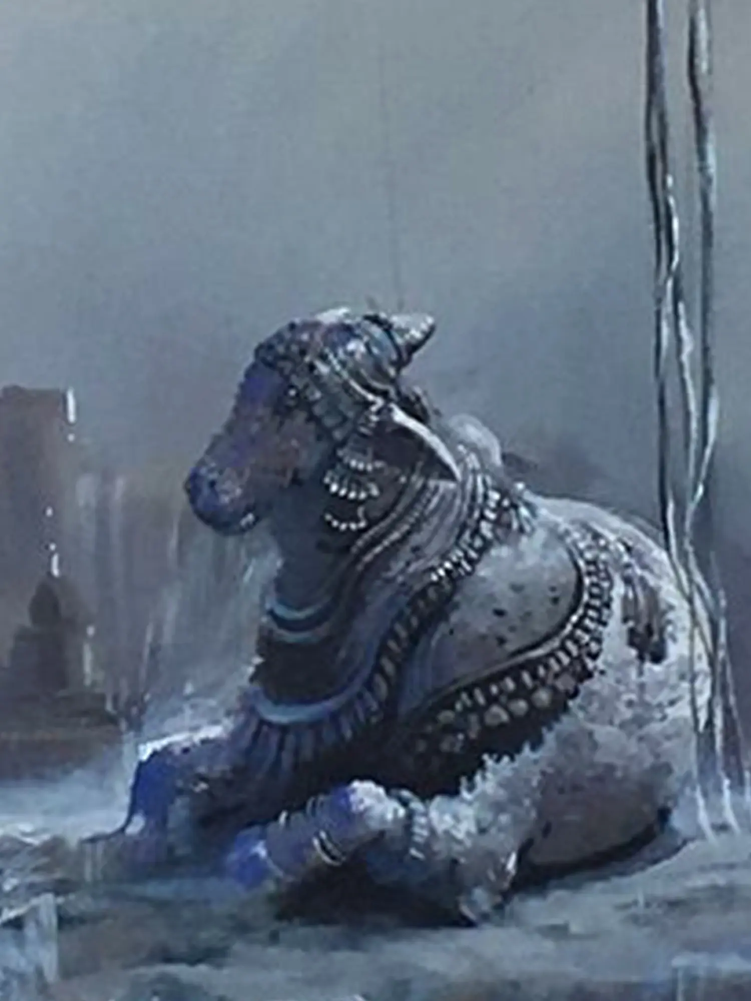 This compelling piece, measuring 30 inches in height and 36 inches in width, presents a serene figure in deep contemplation, accompanied by the steadfast presence of Nandi. The ethereal lighting and subtle rendering of water and mist create a dreamlike quality. You'll be drawn to the intricate rendering of the deity's form and the symbolic elements that enrich the composition.