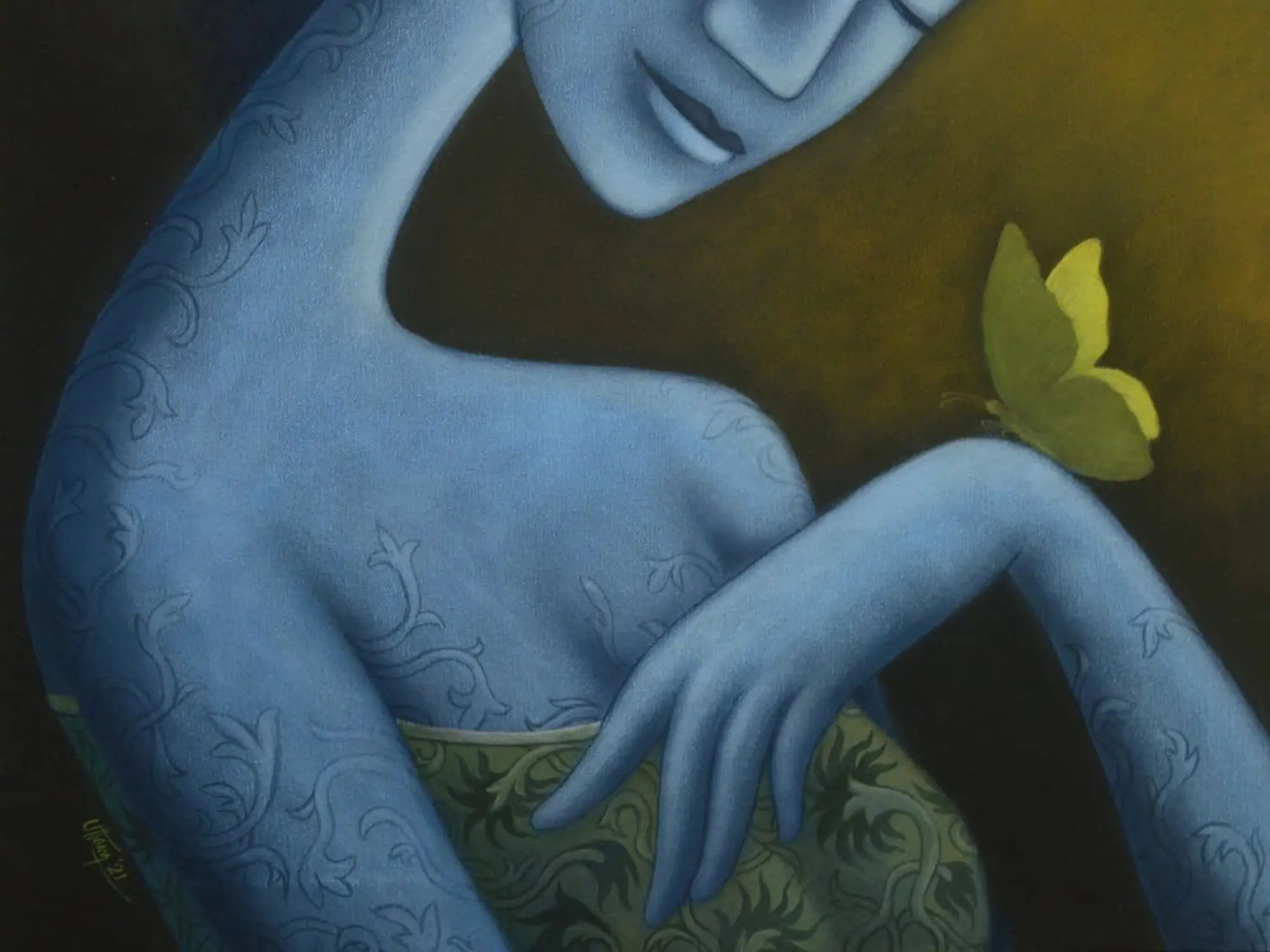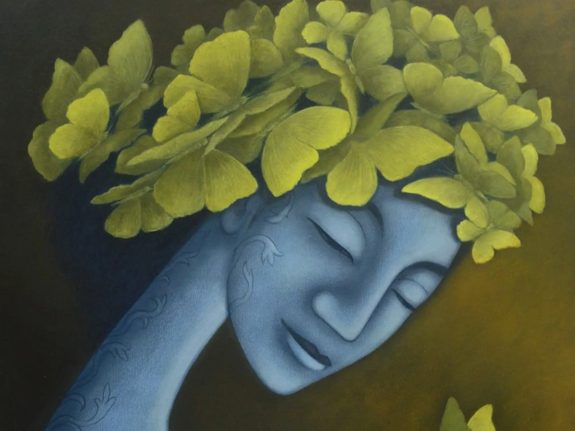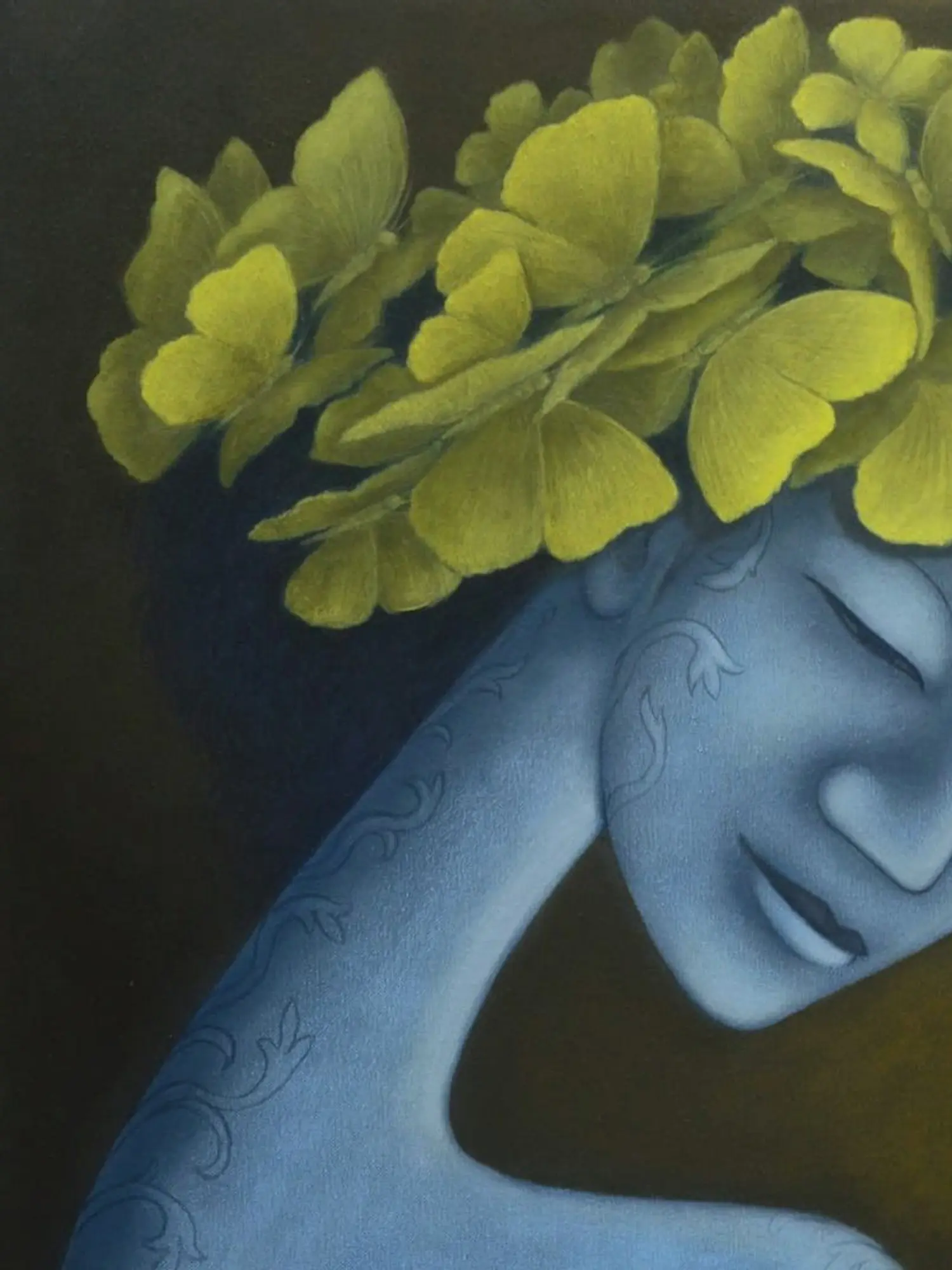 The striking azure hue of the figure's skin is adorned with intricate, vine-like patterns, subtly etched into the surface, hinting at ancient traditions and inner beauty. Cascading yellow-green butterflies crown the figure's head, their vibrant wings a stark yet harmonious contrast against the serene blue. A single butterfly rests gently on the outstretched arm, a testament to the delicate connection between nature and the human spirit. The overall composition, measuring 30 inches in height and 24 inches in width, is balanced and profoundly expressive.
