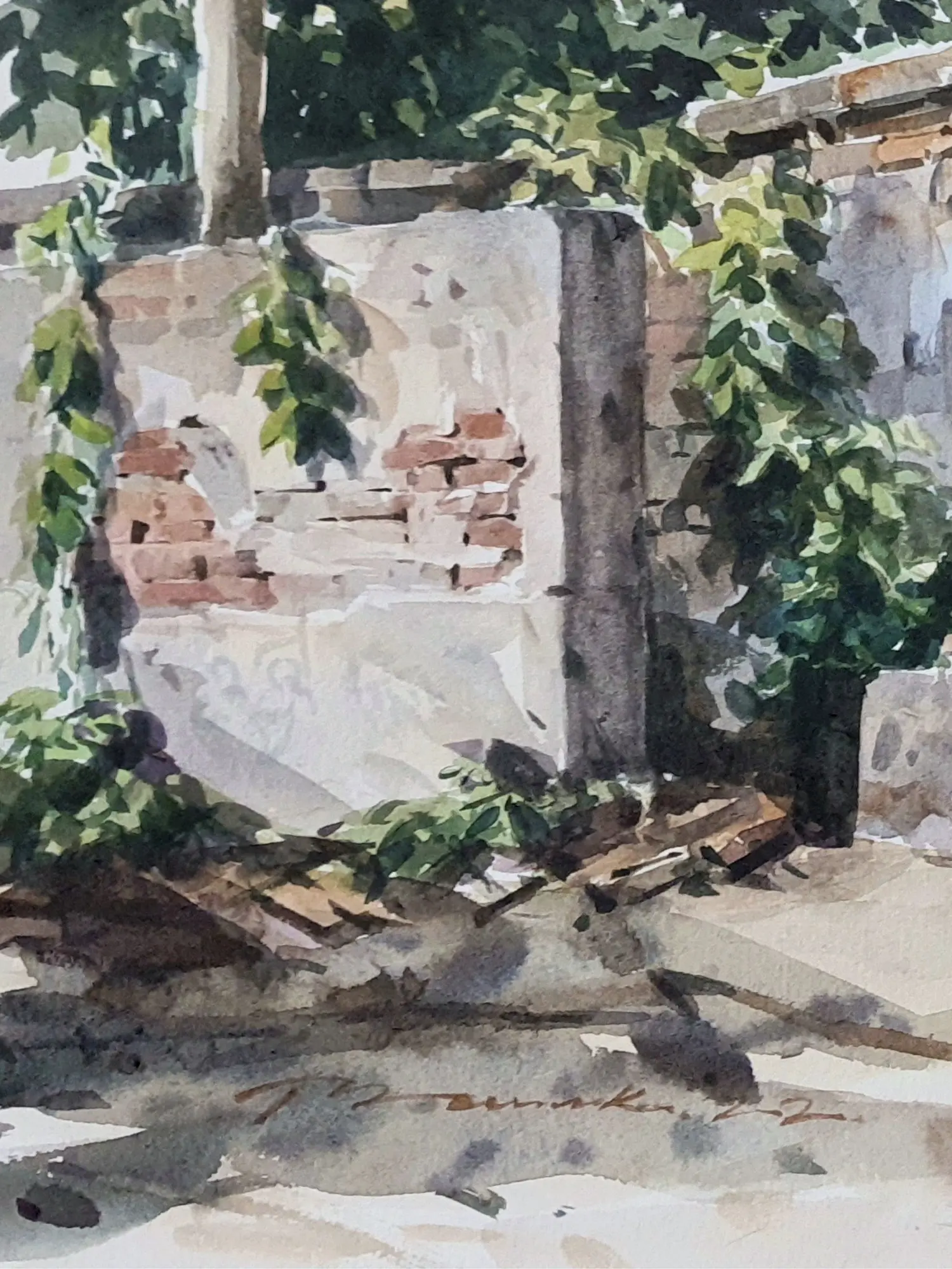 The harmonious composition, with its dimensions of 12 by 16 inches, draws your eye through the crumbling walls and the encroaching greenery. You'll appreciate the nuanced palette, where muted grays and earthy ochres are enlivened by the vibrant greens of tenacious vines. The suggestion of form and depth is achieved through subtle gradients and decisive linework, creating an atmosphere that is both melancholic and serene.