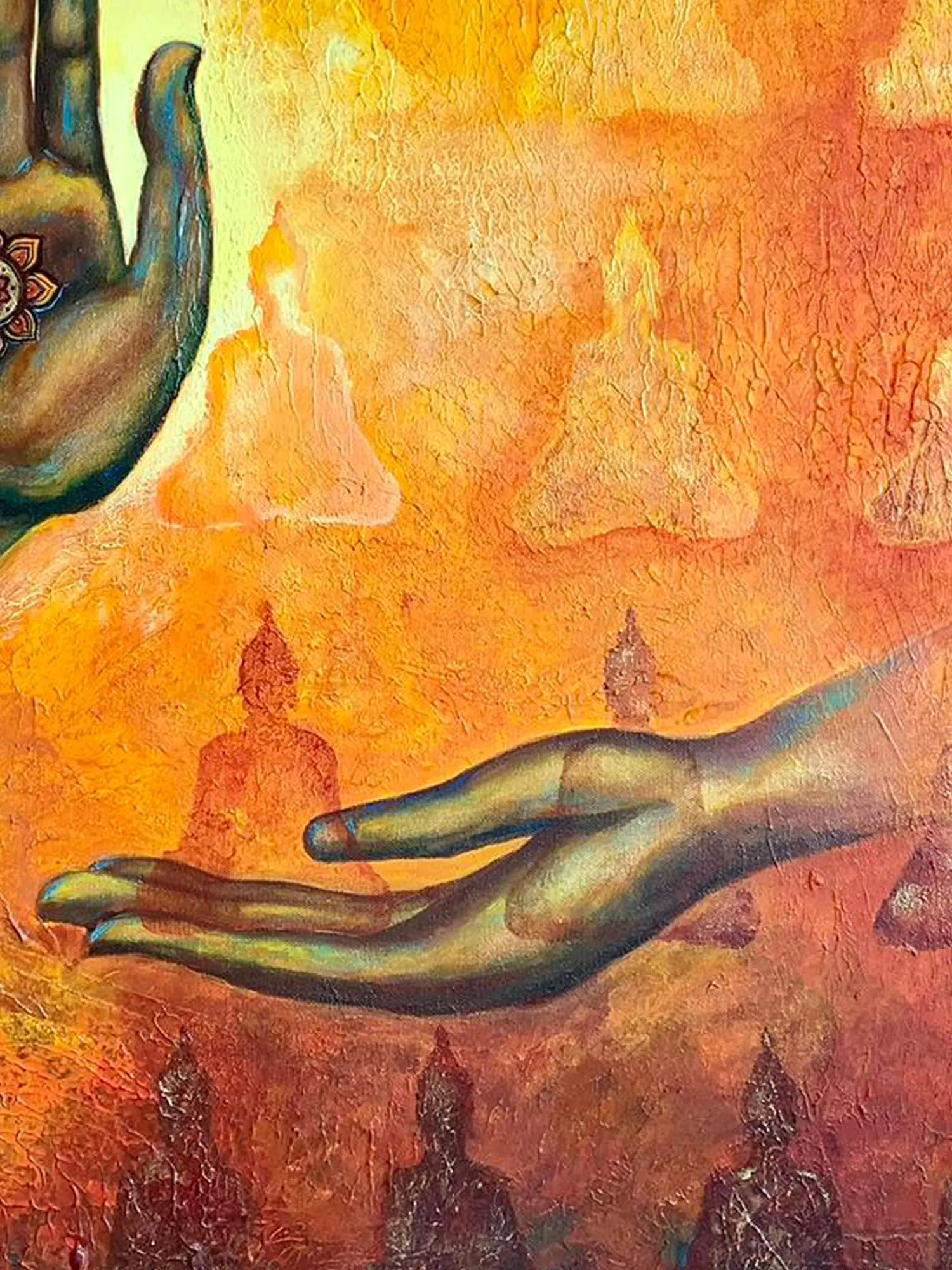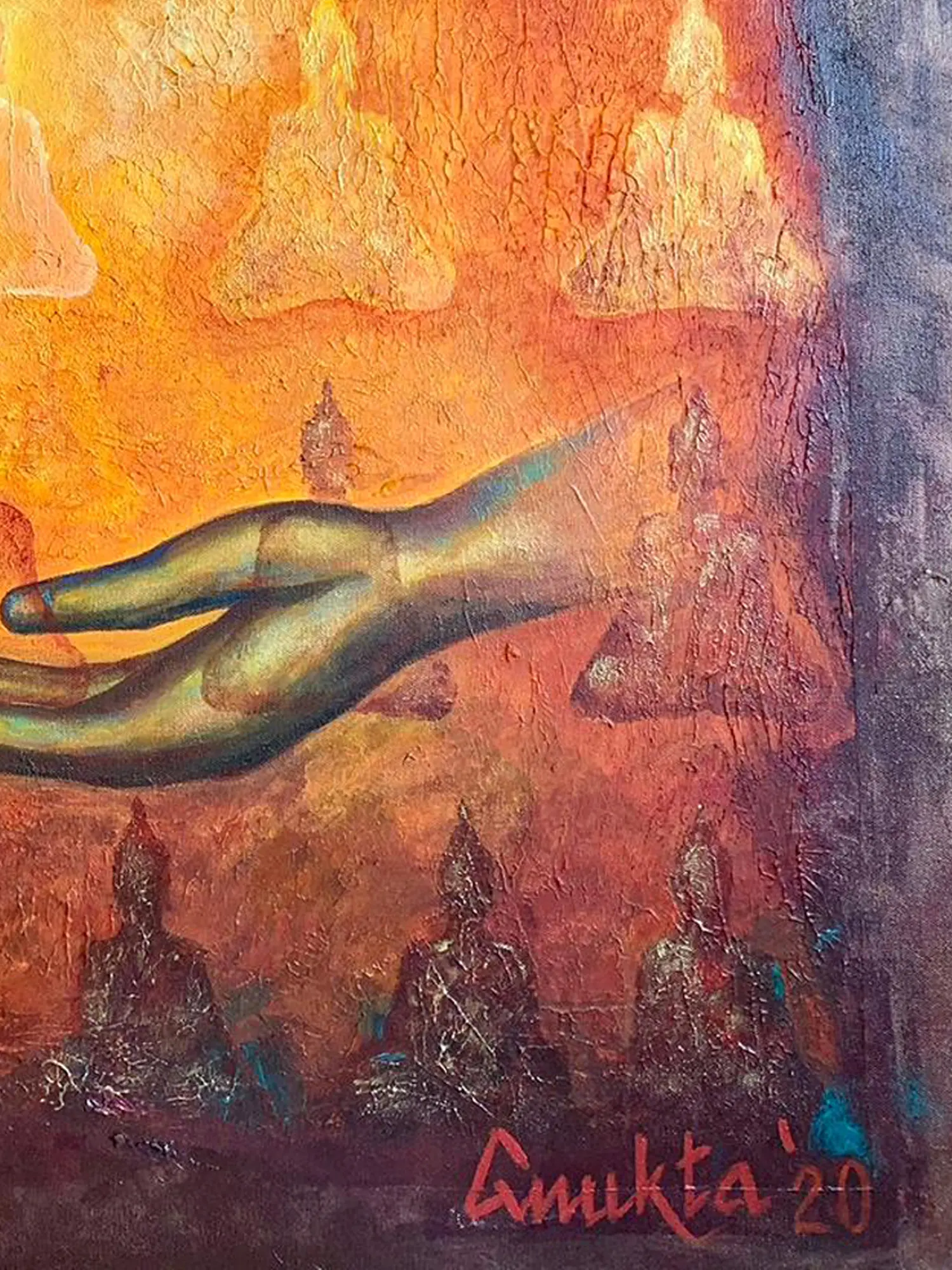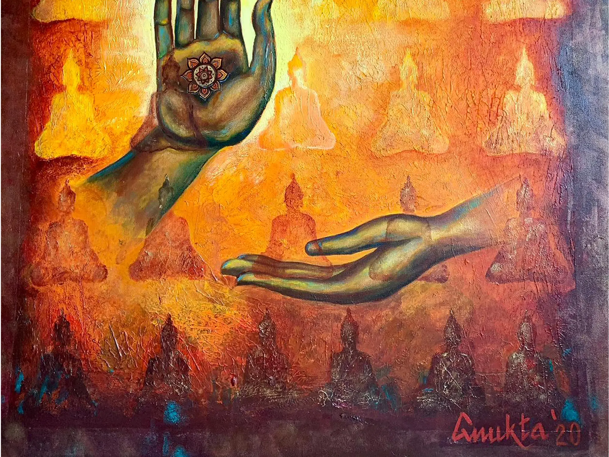 Anukta Mukherjee Ghosh's meticulous craftsmanship and profound understanding of Buddhist symbolism make this acrylic artwork a museum-worthy piece. As a visual exploration of serenity and spiritual wisdom, it invites museum-goers to engage in a contemplative journey, appreciating both the technical finesse and the profound spiritual significance embedded within the "Abhaya Mudra Acrylic Art."