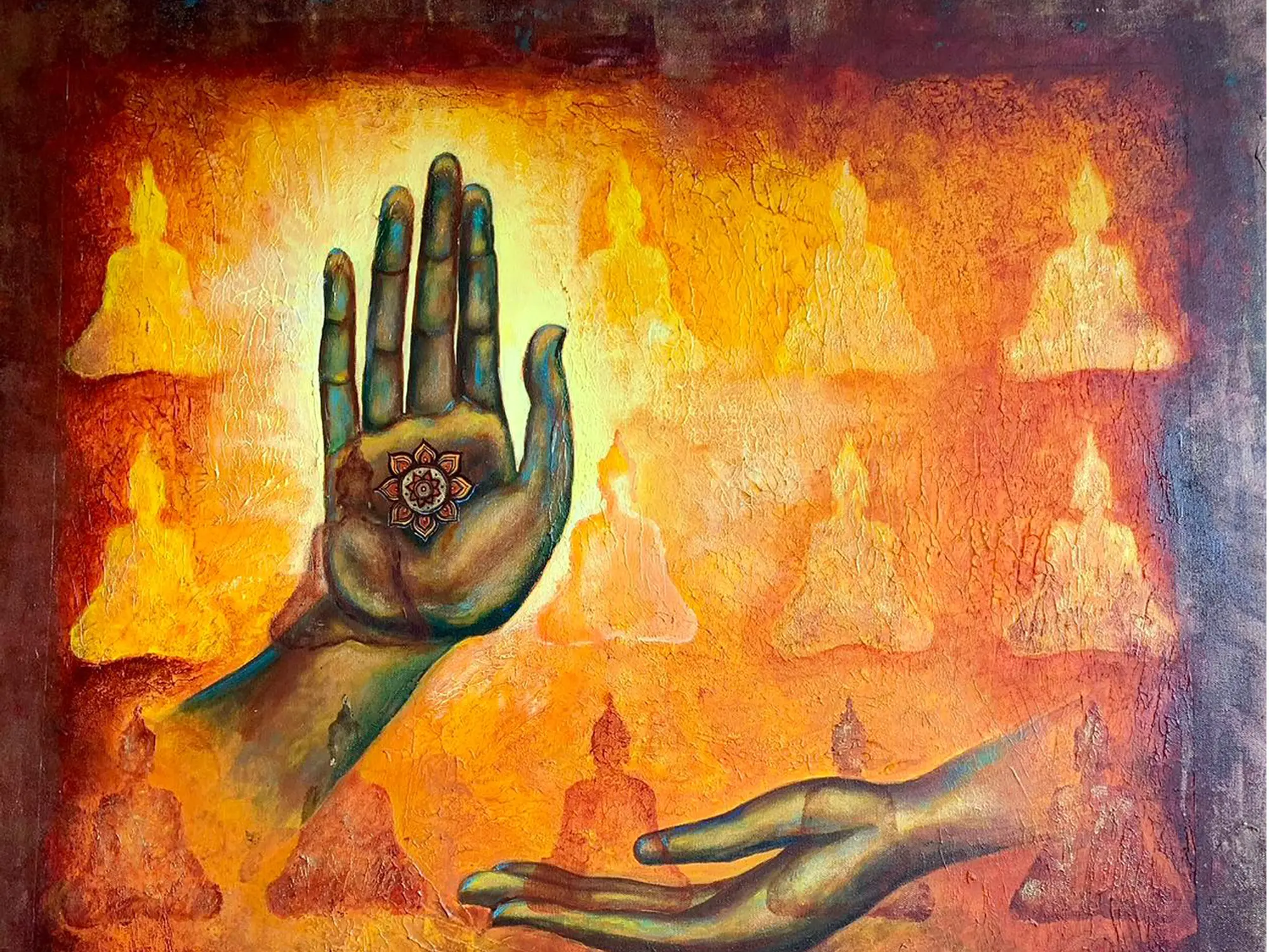 Anukta Mukherjee Ghosh's "Abhaya Mudra Acrylic Art" stands as a museum piece that seamlessly blends artistic mastery and spiritual symbolism. Executed on canvas with acrylic medium, this artwork transcends traditional boundaries, offering a profound exploration of the sacred Abhaya and Dhyani Mudras.