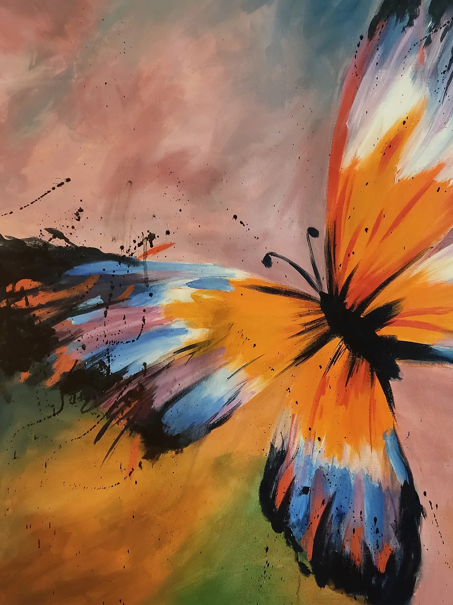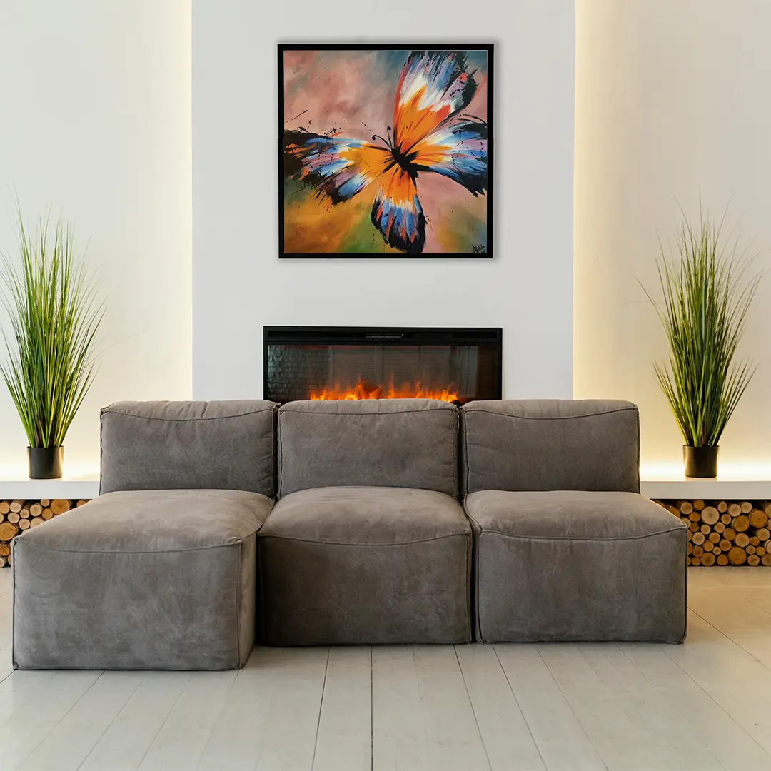 Witness the bold interpretation of a butterfly's wings, rendered with broad, energetic brushstrokes and subtle splatters that evoke a sense of spontaneous movement. The interplay of fiery oranges, deep blues, and soft, muted backgrounds creates a captivating visual dialogue. Measuring 25 inches in height and 25 inches in width, this square composition commands attention, its abstract yet recognizable form adding a contemporary edge to classic inspiration.