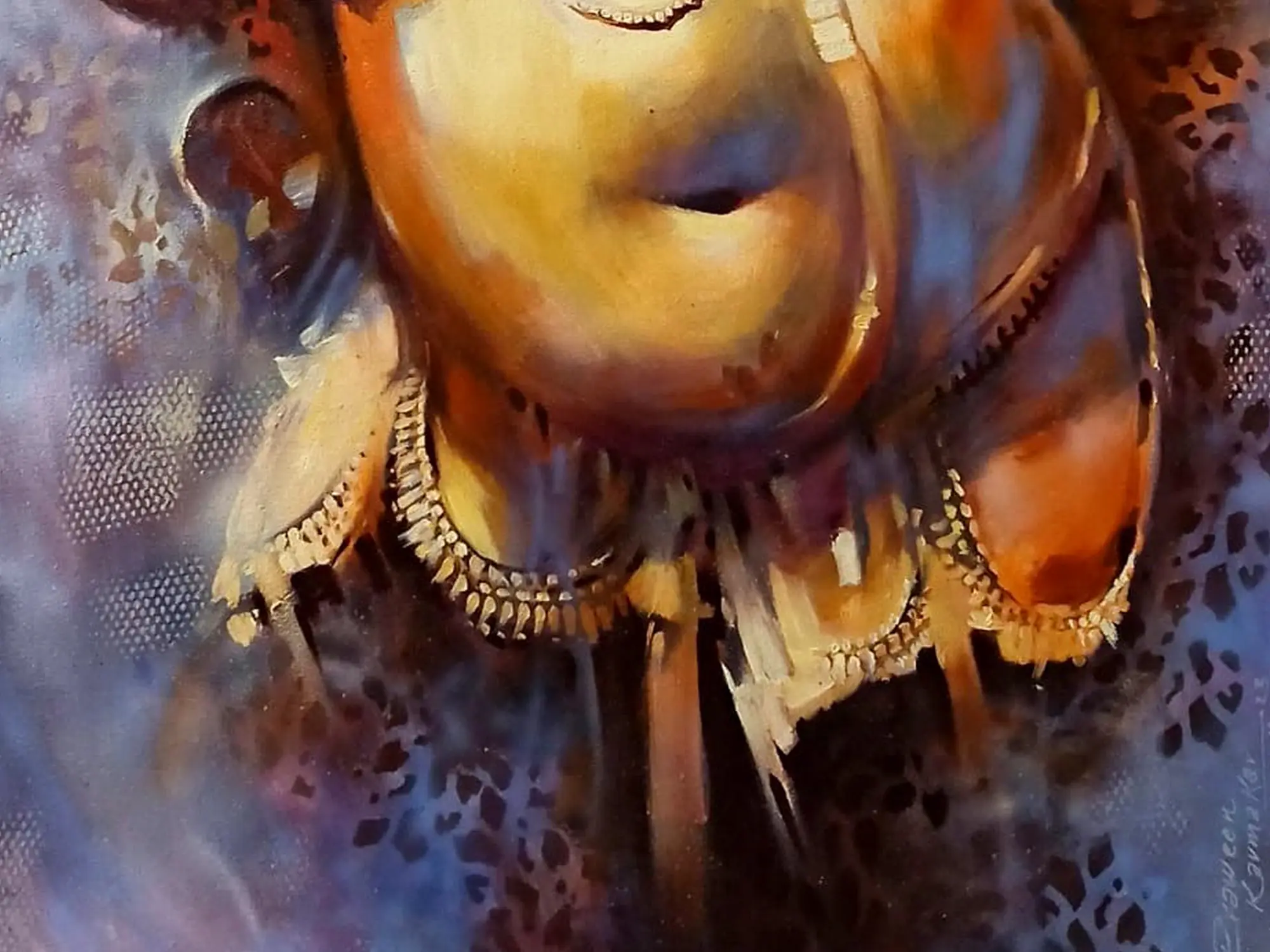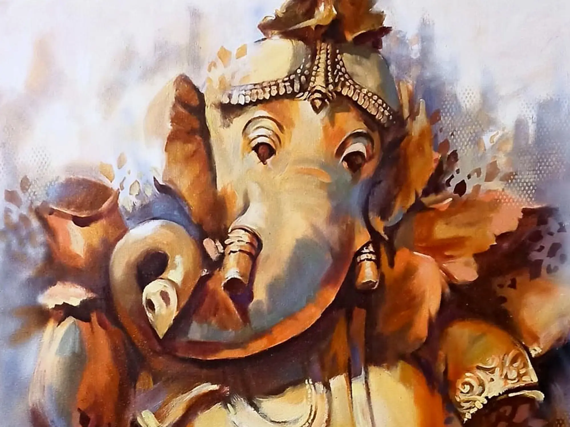 Encounter the divine presence of Ganesha in a mesmerising symphony of form and colour with this traditional representation to evoke the essence of cosmic energy and spiritual grace. Through dynamic compositions and fluid shapes, the artist captures the playful spirit and profound wisdom of the beloved elephant-headed deity, inviting you to explore the mysteries of creation and transformation. Let its enigmatic beauty awaken your senses and ignite your imagination, as you journey into the heart of divine inspiration and eternal renewal.