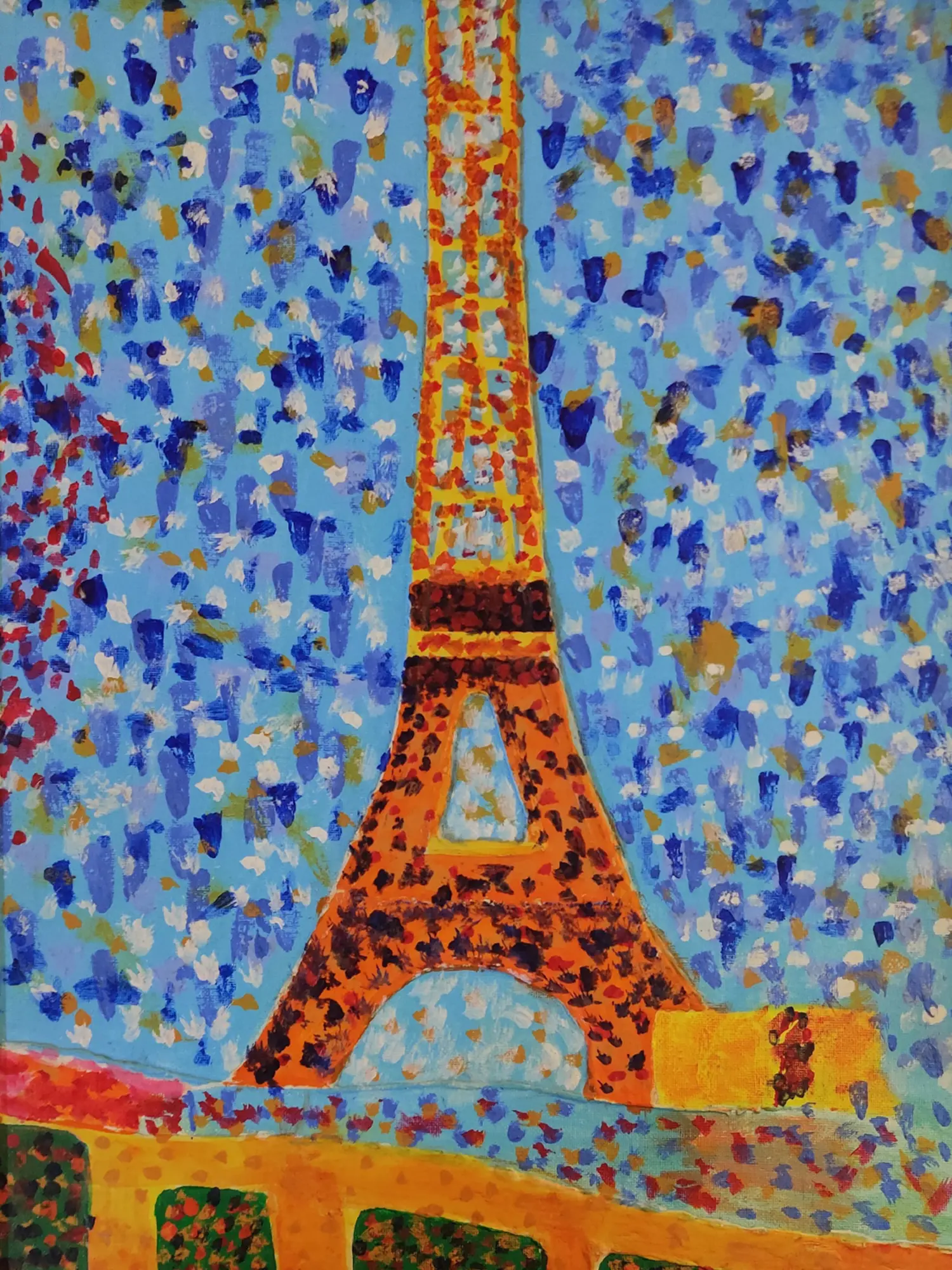 Each dot in Gupta's rendition contributes to the overall composition, capturing the essence of Seurat's technique while adding a modern vibrancy. This artwork not only evokes the charm of the Eiffel Tower but also serves as a dynamic and uplifting addition to home decor, infusing any space with a sense of energy and artistic flair.