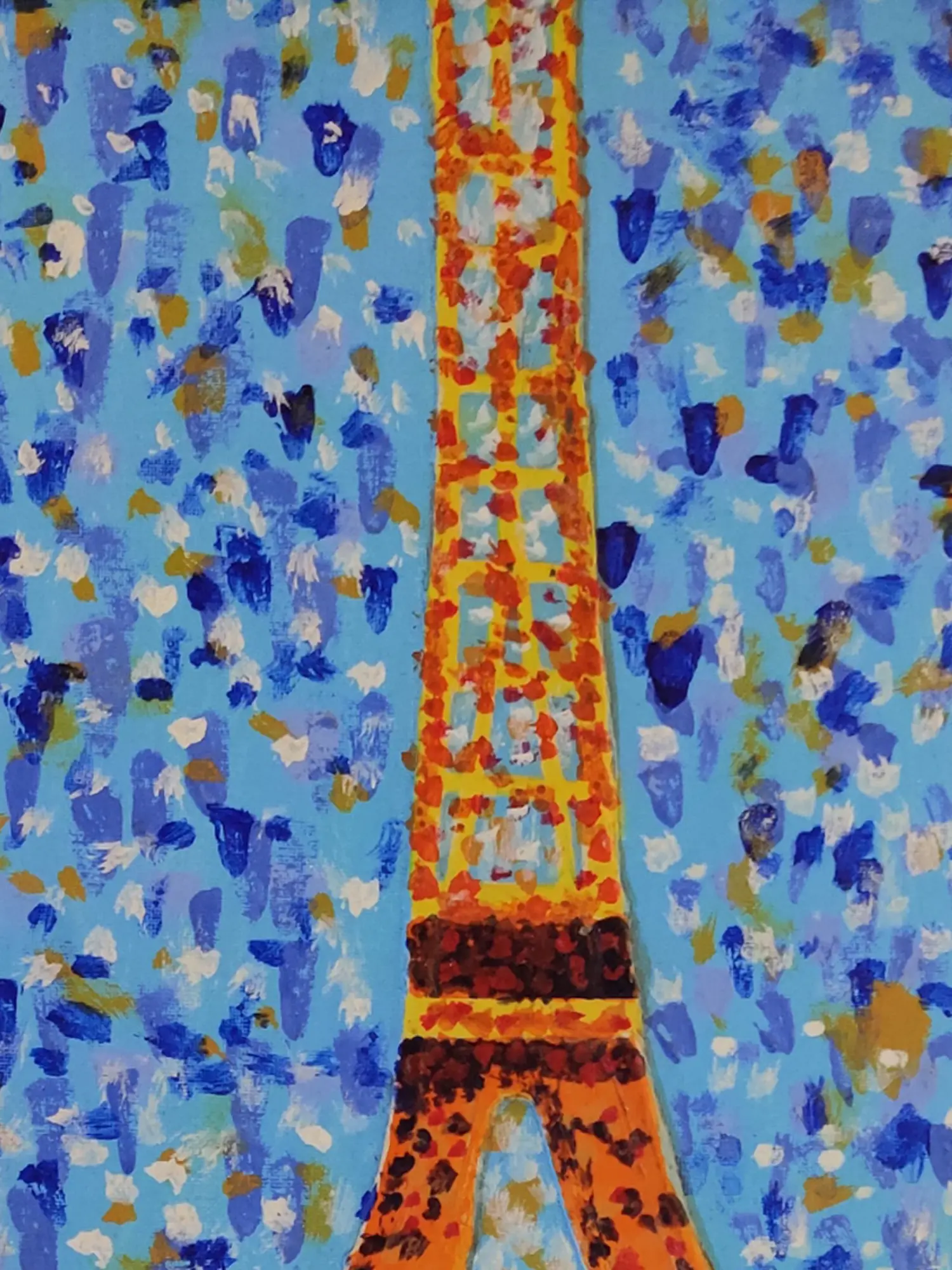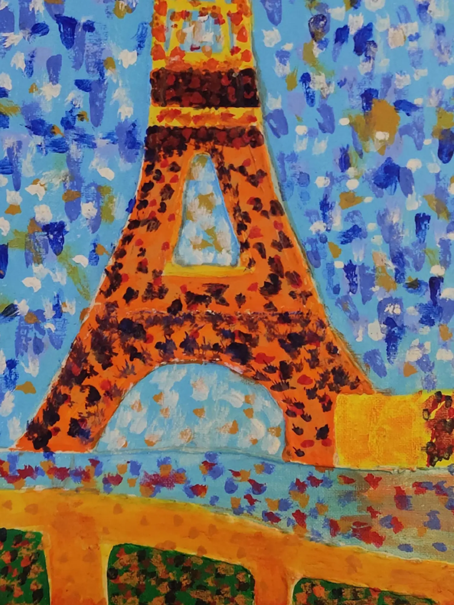 This vibrant mixed-media and acrylic painting captures the essence of the Eiffel Tower, not in realistic detail, but through an explosion of color and texture that evokes the feeling of Paris itself. The iconic tower stands tall, rendered in bold oranges and browns, against a backdrop of a dazzling, abstract sky filled with tiny strokes of blue, purple, and white – a visual symphony that mirrors the bustling energy of the city below. The artist's unique approach transforms the familiar landmark into a captivating, modern masterpiece. The painting’s abstract style allows viewers to interpret the scene in their way, offering a unique and personal experience.