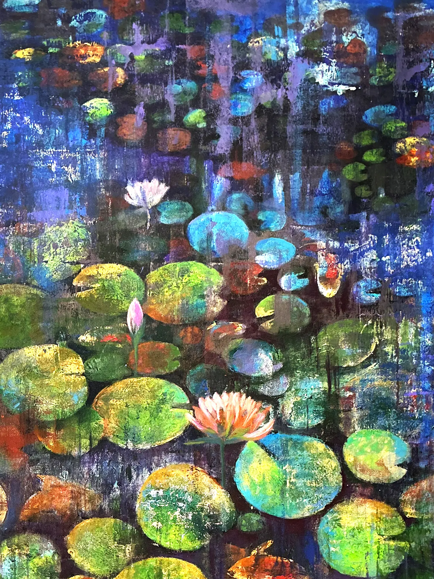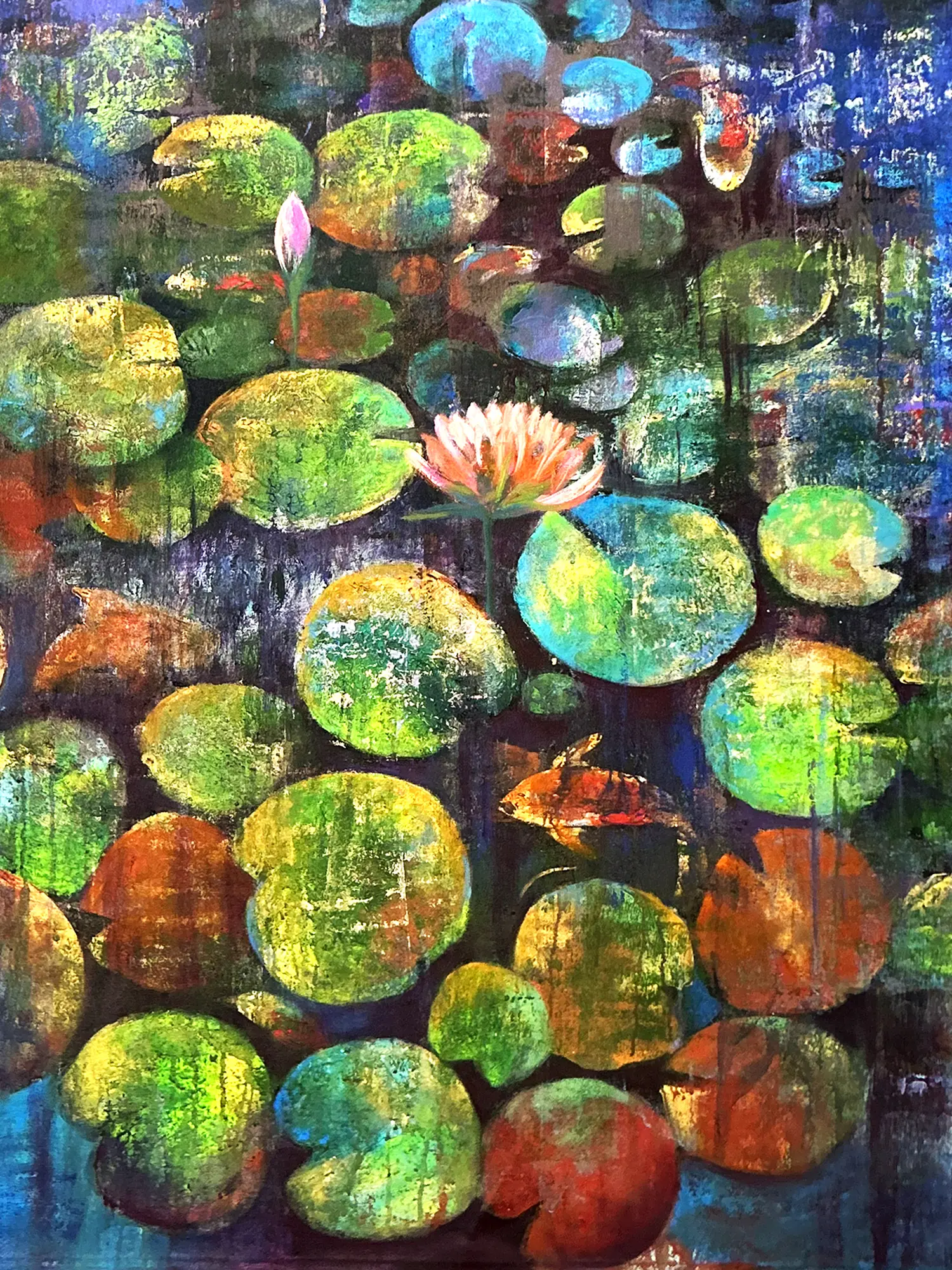 The interplay of light and shadow across the canvas is mesmerizing, with broad, expansive lily pads rendered in varying shades of emerald, ochre, and cerulean. Delicate blossoms emerge from the verdant foliage, their petals kissed with soft pinks and whites. The subtle presence of koi gliding through the water adds a dynamic yet peaceful element, enhancing the overall visual narrative.