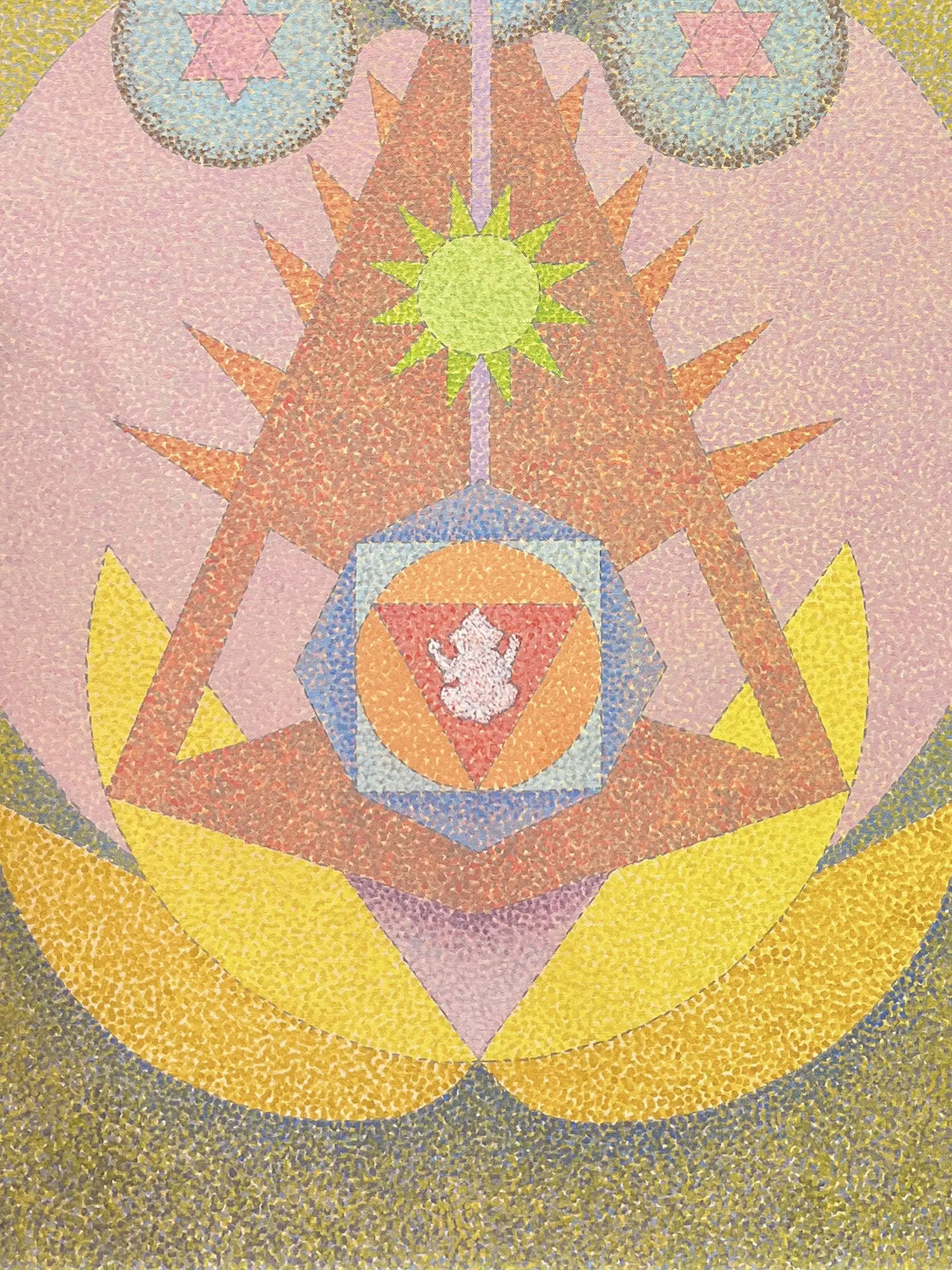 The composition unfolds with a remarkable balance, guiding your eye through its complex yet serene arrangement. At its heart, a central motif is encircled by a gentle, expansive form, reminiscent of a blooming lotus or cosmic wheel. Above, a cluster of celestial bodies, each containing a stylized star, suggests a divine celestial dance. The interplay of geometric shapes and organic curves creates a dynamic visual rhythm that is both grounding and uplifting.