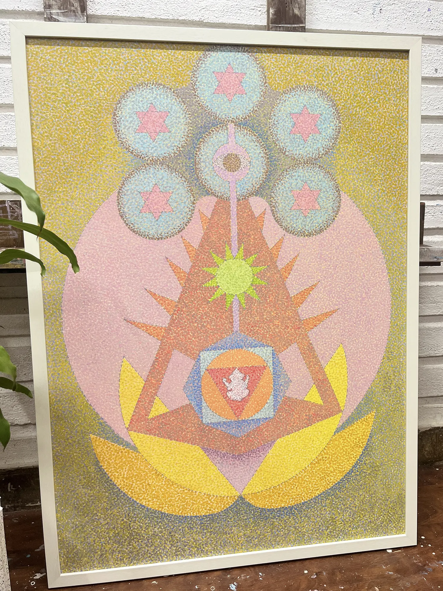Meticulously crafted using the pointillist technique with acrylic paints on canvas.