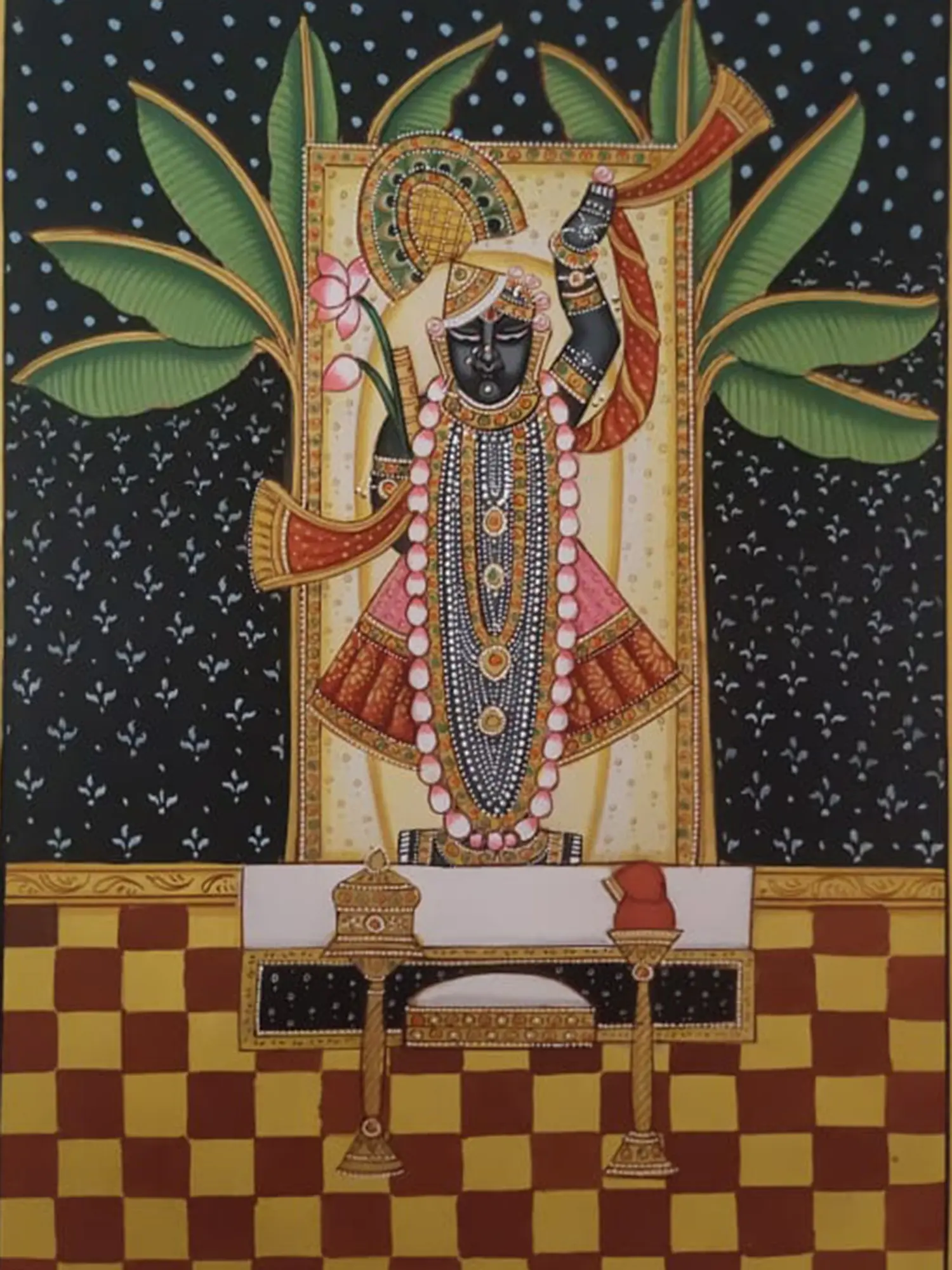 Pichwai paintings, originating from Nathdwara, hold immense cultural and religious importance. Traditionally, they served as backdrops for the Shrinathji deity in the temples, enriching the devotional atmosphere. These paintings were created to enhance the beauty of the deity and narrate scenes from his life, primarily based on the Bhagavata Purana – a sacred Hindu text dedicated to Krishna's life and teachings. The vibrant colors and intricate detailing were meant to enthrall and evoke feelings of devotion. The imagery of the painting, with Krishna standing gracefully against a backdrop of banana leaves (symbolic of fertility and abundance), adds a layer of complexity and meaning, drawing from the rich tapestry of Hindu mythology and symbolism. The checkered floor symbolizes the divine cosmic order.