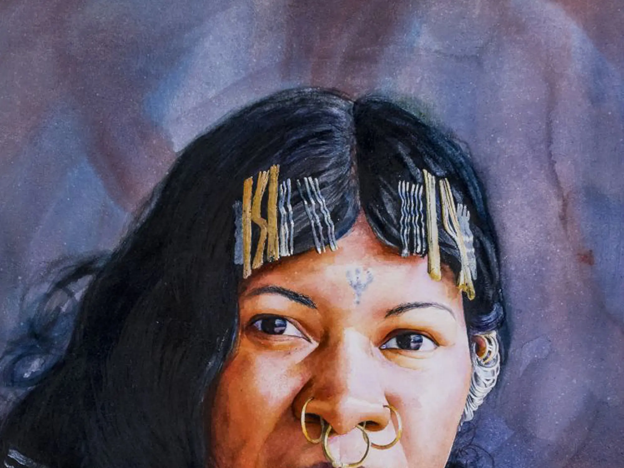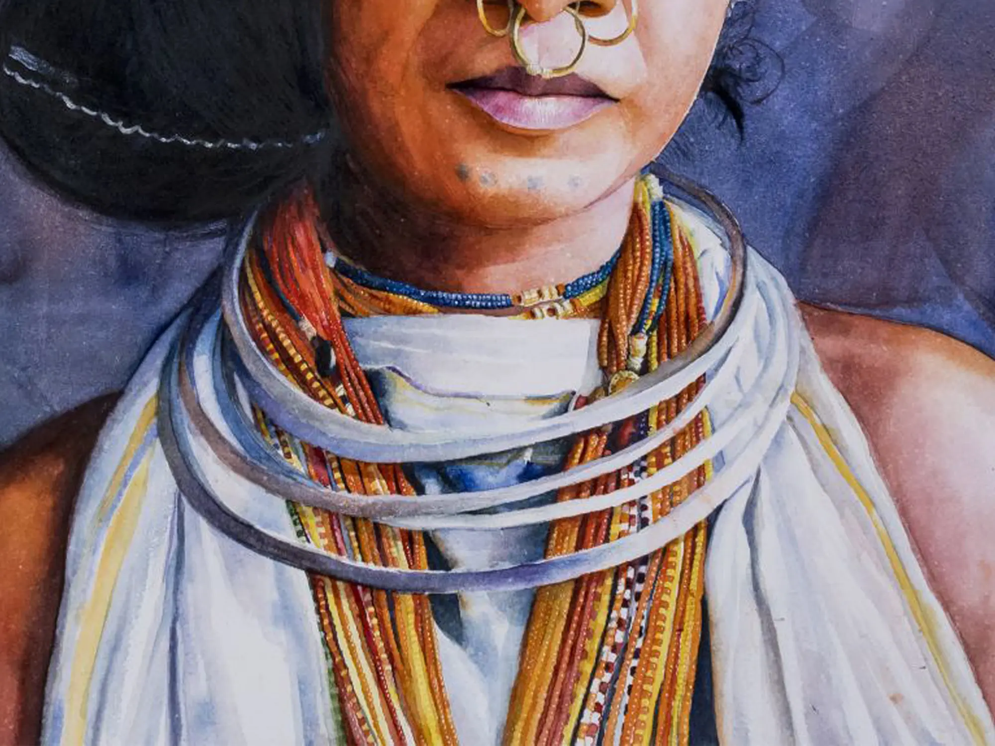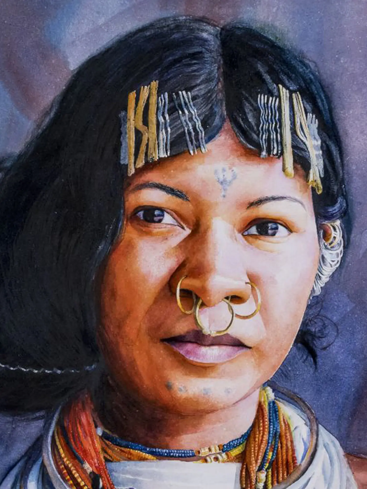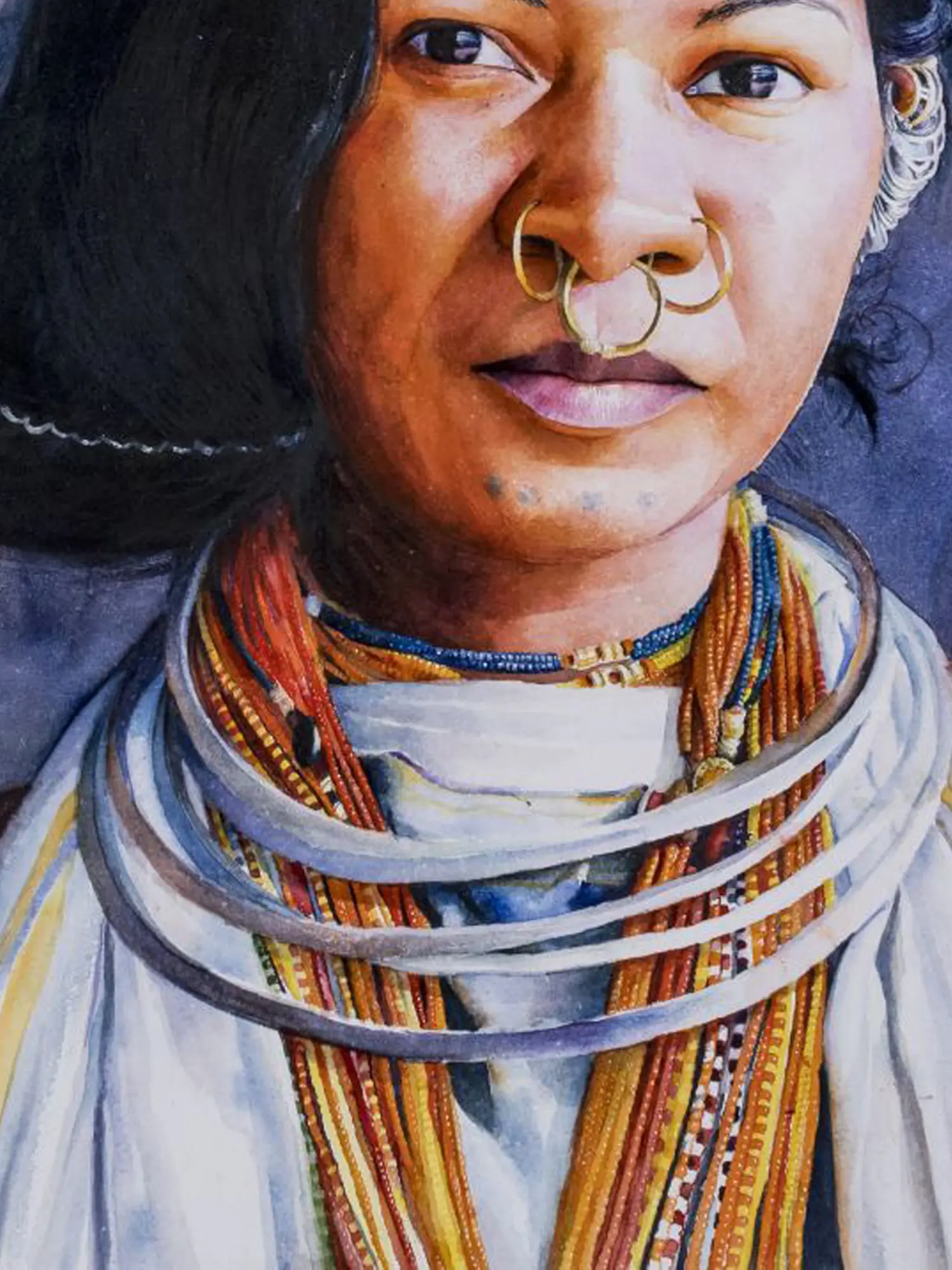 The striking composition draws you immediately to the subject's direct gaze, full of quiet resilience and introspection. Observe the exquisite detail in the traditional adornments – the gleaming gold nose rings and earrings, the layered bead necklaces, and the finely braided hair adorned with delicate clips. The interplay of light and shadow across the face is rendered with expert precision, highlighting the contours and adding a tangible sense of presence to the portrait. The generous dimensions of 36 by 21 inches ensure that every nuance is appreciated, making this a commanding piece for any discerning collection.