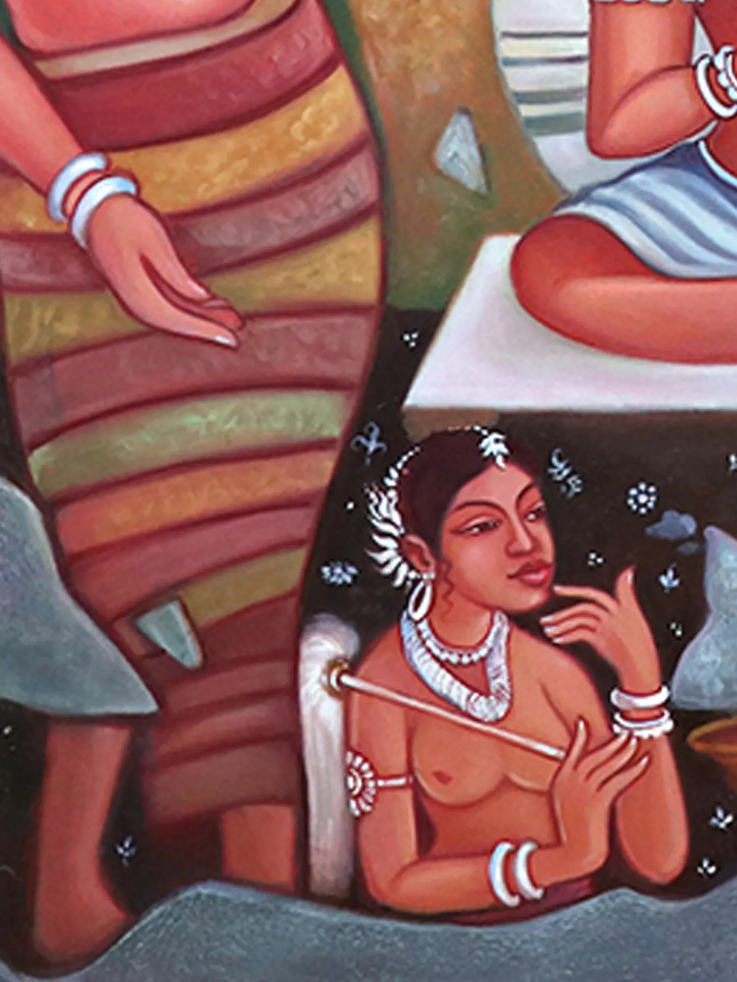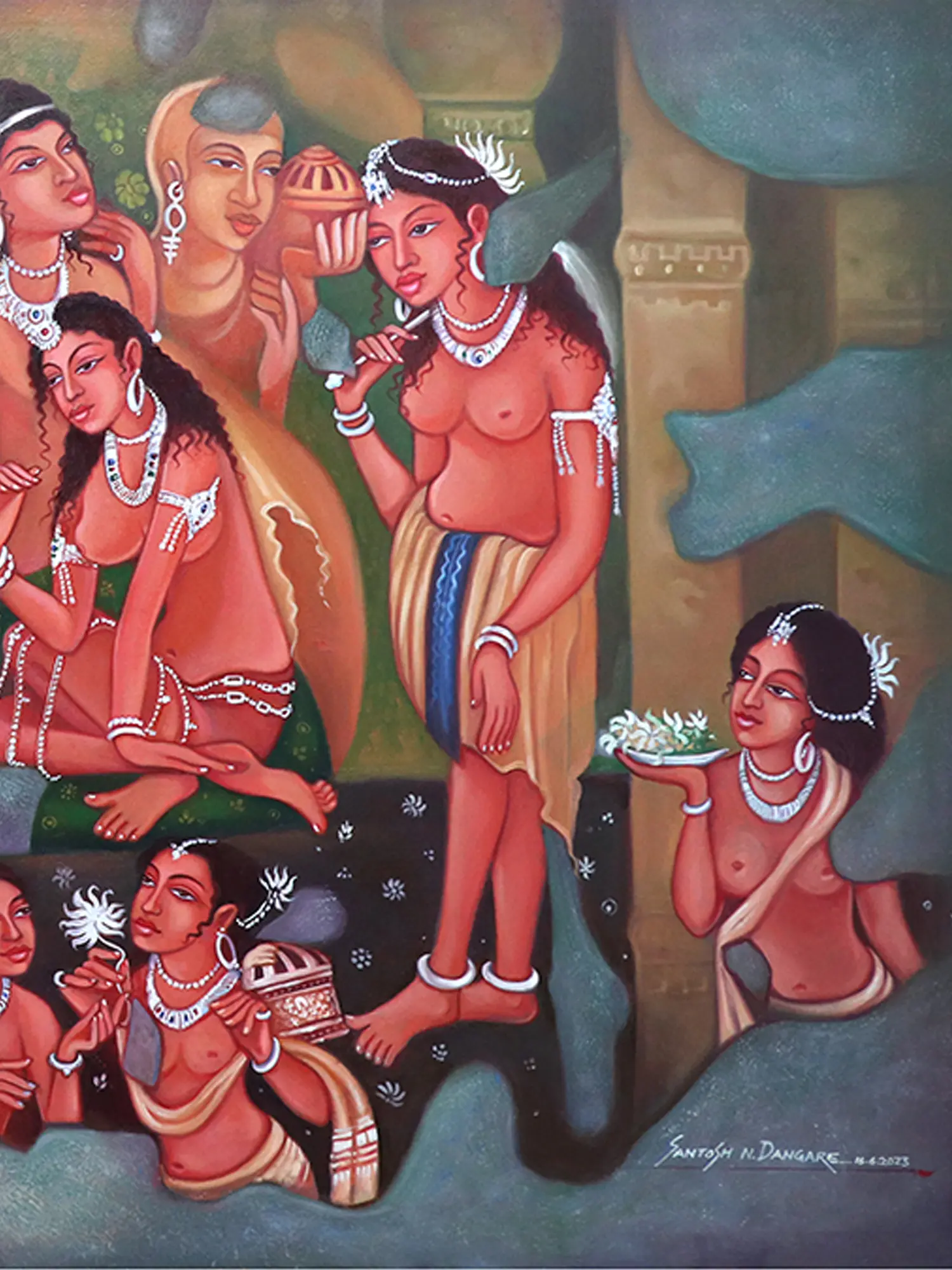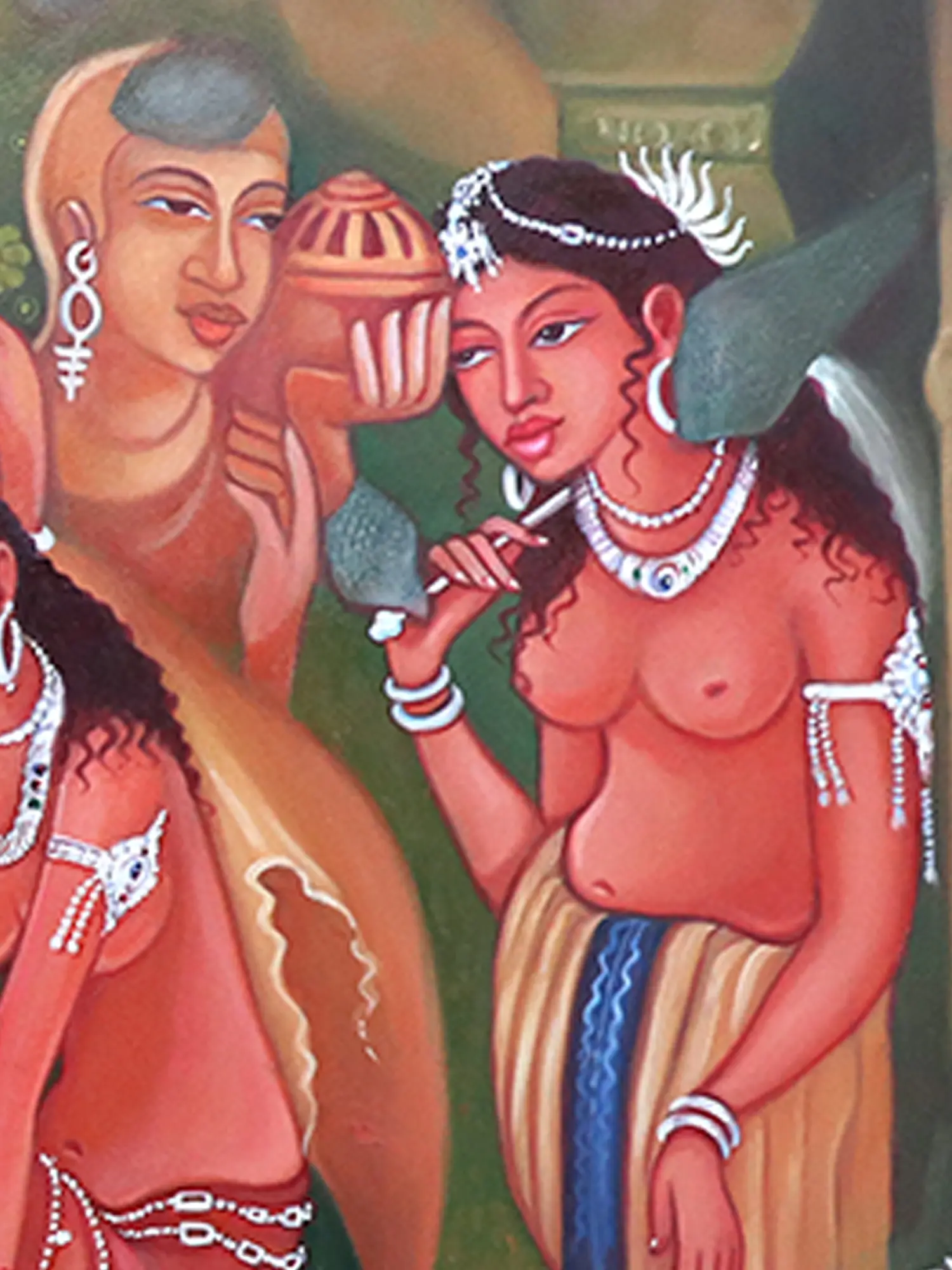 Drawing inspiration from the spirit of the Ajantha Caves, renowned for their exquisite Buddhist murals and sculptures, this painting captures a similar sense of timeless elegance and storytelling. It embodies a revival of classical Indian artistic traditions, infusing them with contemporary sensitivity and a unique personal expression that resonates across cultures. The figures evoke a sense of mythical narratives, inviting viewers to connect with a rich cultural heritage.