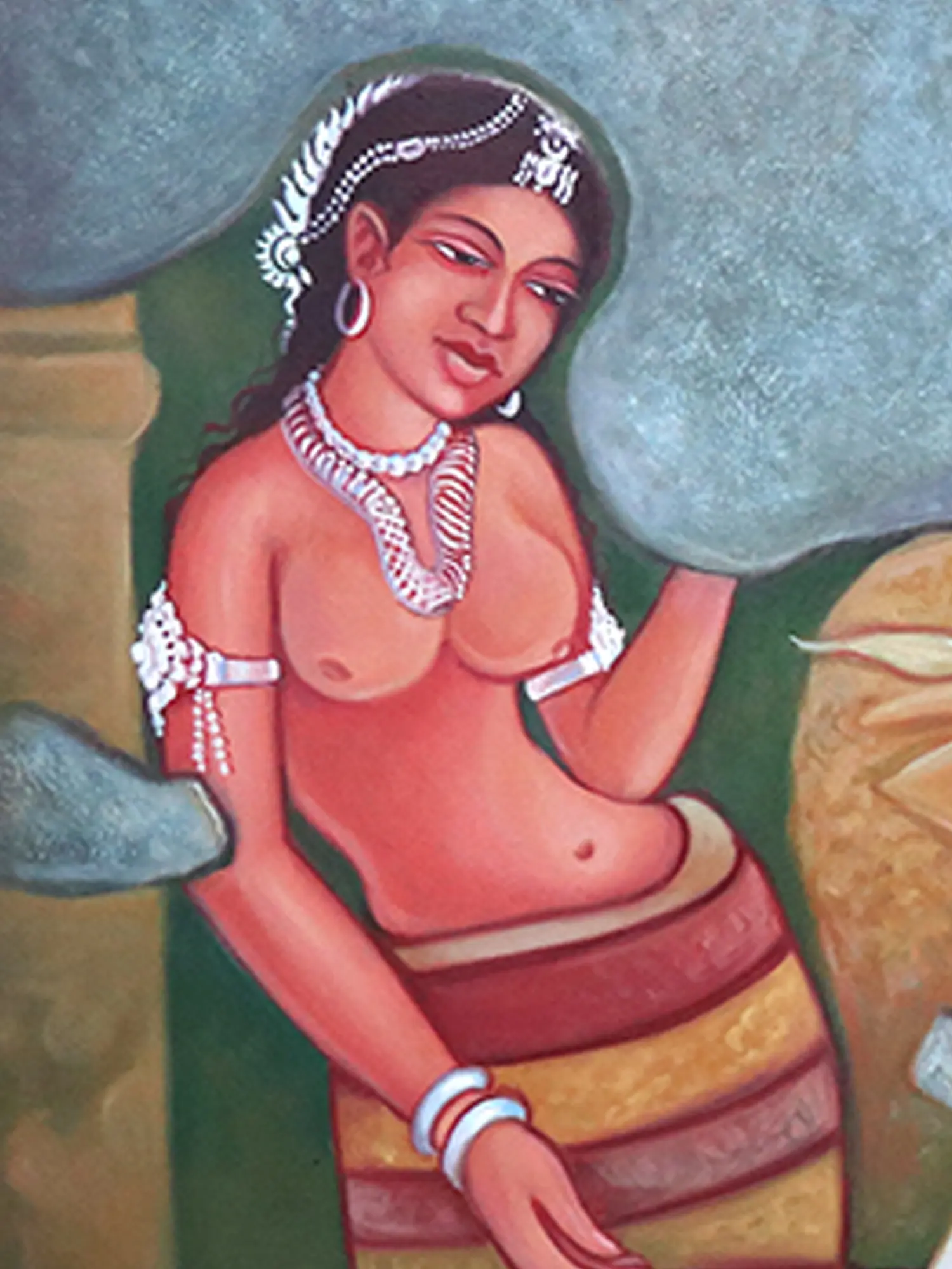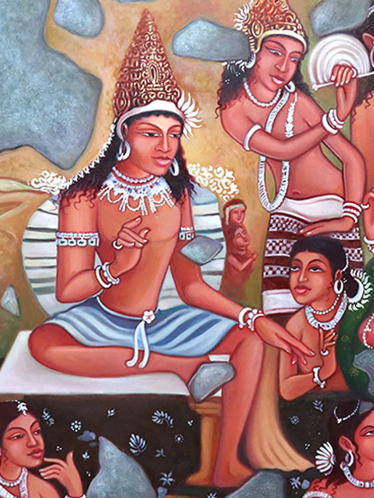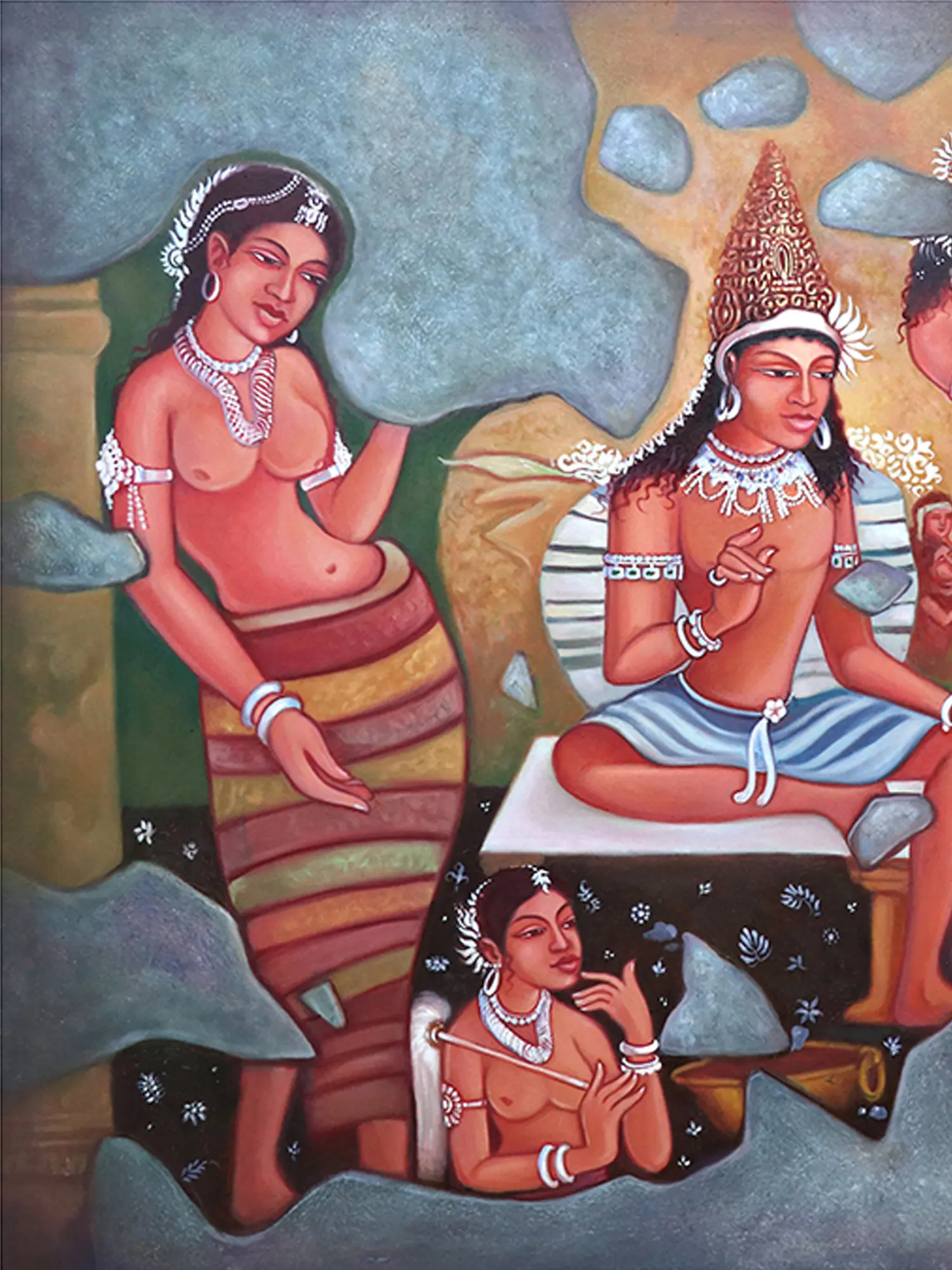 Drawing inspiration from the spirit of the Ajantha Caves, renowned for their exquisite Buddhist murals and sculptures, this painting captures a similar sense of timeless elegance and storytelling. It embodies a revival of classical Indian artistic traditions, infusing them with contemporary sensitivity and a unique personal expression that resonates across cultures. The figures evoke a sense of mythical narratives, inviting viewers to connect with a rich cultural heritage.