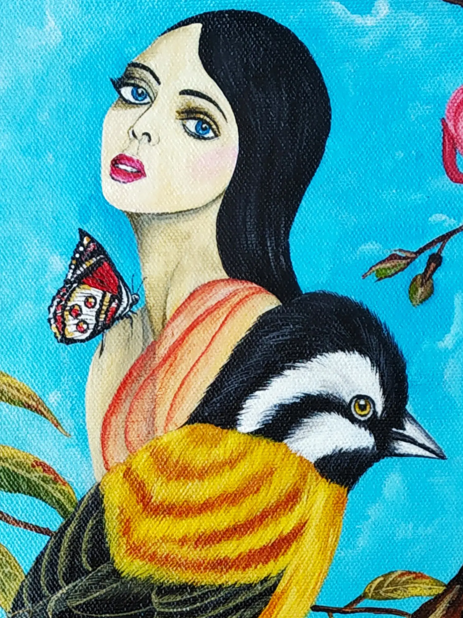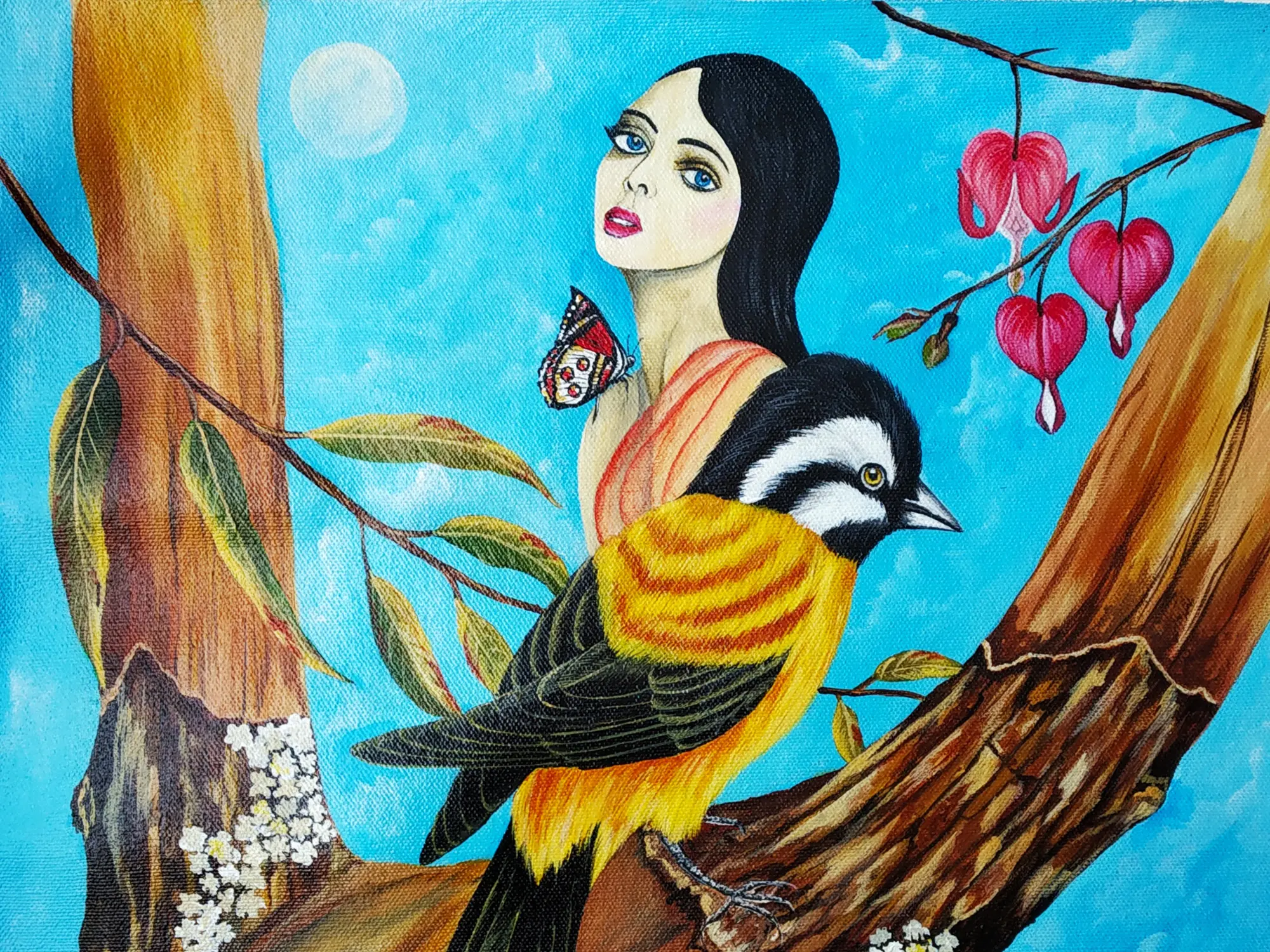 The composition unfolds with a striking visual narrative, where a solitary figure gazes outward amidst the natural world. Delicate butterflies flutter nearby, and a striking bird perches contemplatively on a weathered branch adorned with bleeding heart flowers. The vivid blue sky, punctuated by a soft moon, provides a celestial backdrop. You'll notice the intricate rendering of textures, from the rough bark of the tree to the soft plumage of the bird, all brought to life with an 18-inch square canvas that allows for intimate appreciation.