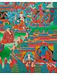 A Thangka is a traditional Tibetan Buddhist painting that usually depicts a Buddhist Deity (Buddha or Bodhisattva), a scene, or a mandala. These paintings are considered important paraphernalia in Buddhist rituals. They are used to teach the life of the Buddha, various lamas, and Bodhisattvas to the monastic students, and are also useful in visualizing the deity while meditating. One of the most important subjects of thangkas is the Bhavacakra (the wheel of life) which depicts the Art of Enlightenment. It is believed that Thangka paintings were developed over the centuries from the murals, of which only a few can be seen in the Ajanta caves in India and the Mogao caves in Gansu Province, Tibet.