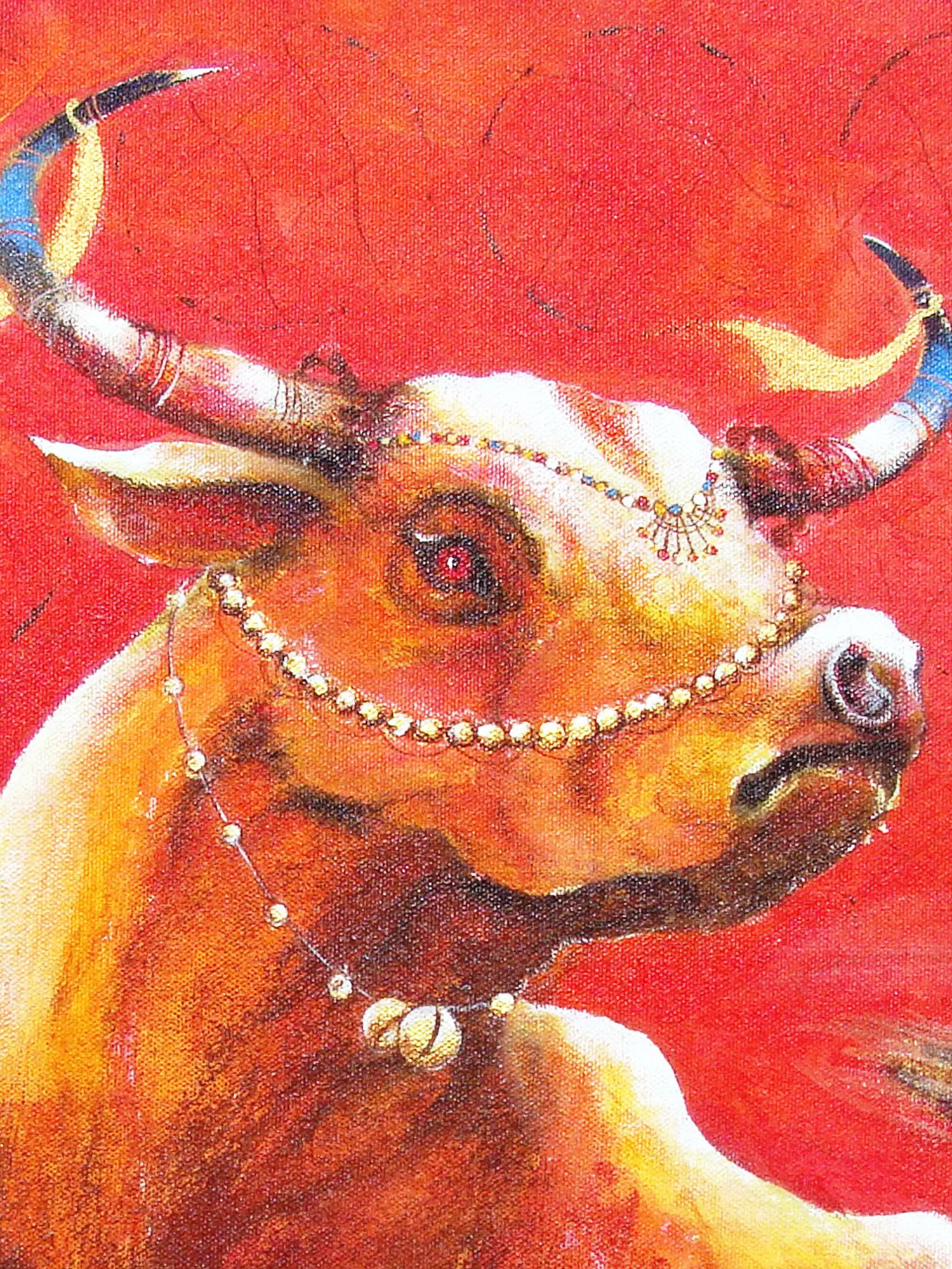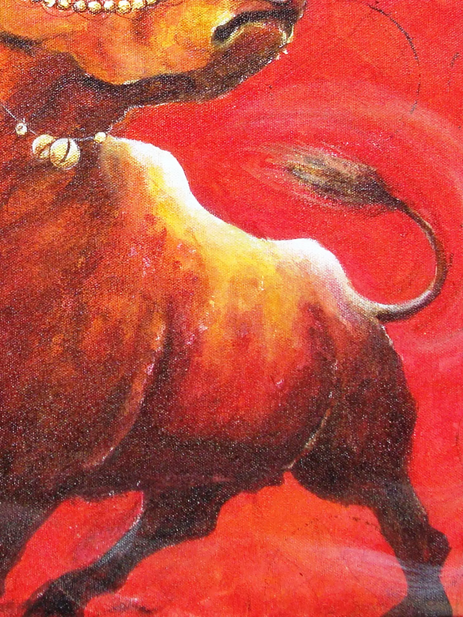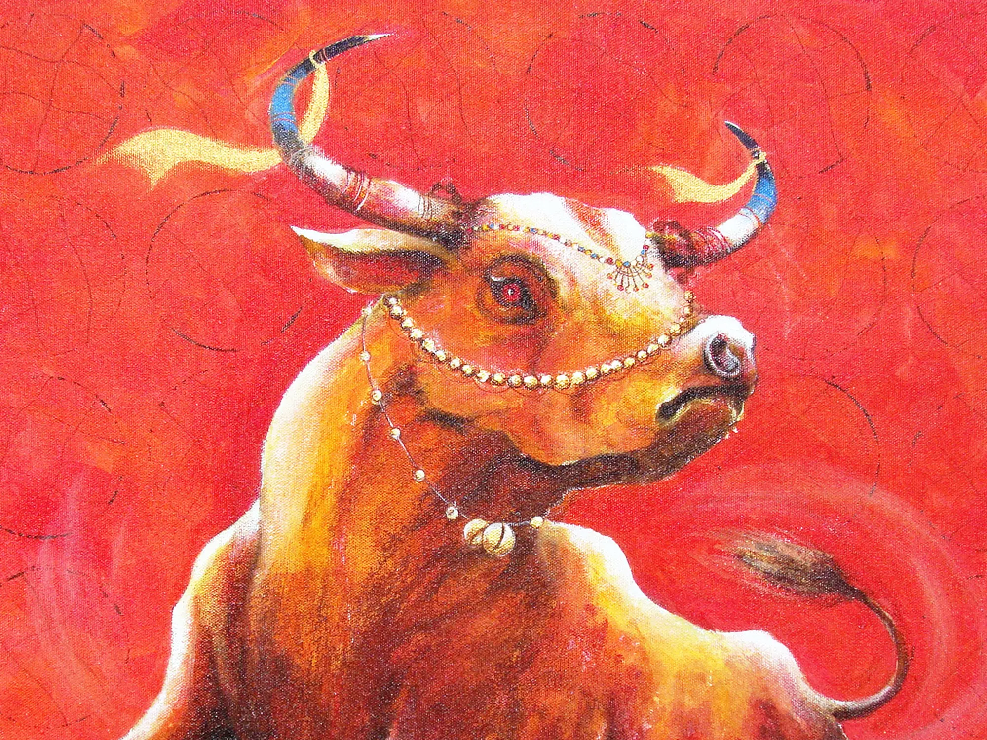 The rich, fiery reds and ochres of the background create an atmosphere of intense energy, perfectly complementing the luminous, golden-brown musculature of the bull. You'll appreciate the subtle yet effective use of contrasting blues and golds adorning its horns, hinting at its majestic presence. The intricate beadwork and decorative elements adorning its forehead and neck add a touch of regal adornment, creating a fascinating juxtaposition with its fierce demeanor. The textural richness of the canvas is palpable, inviting a closer look at the artist's dynamic application of paint.