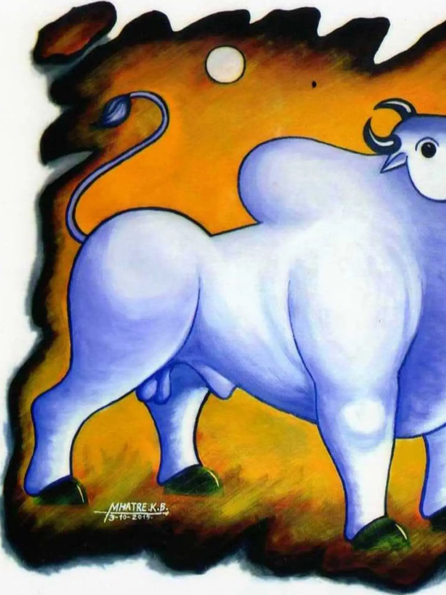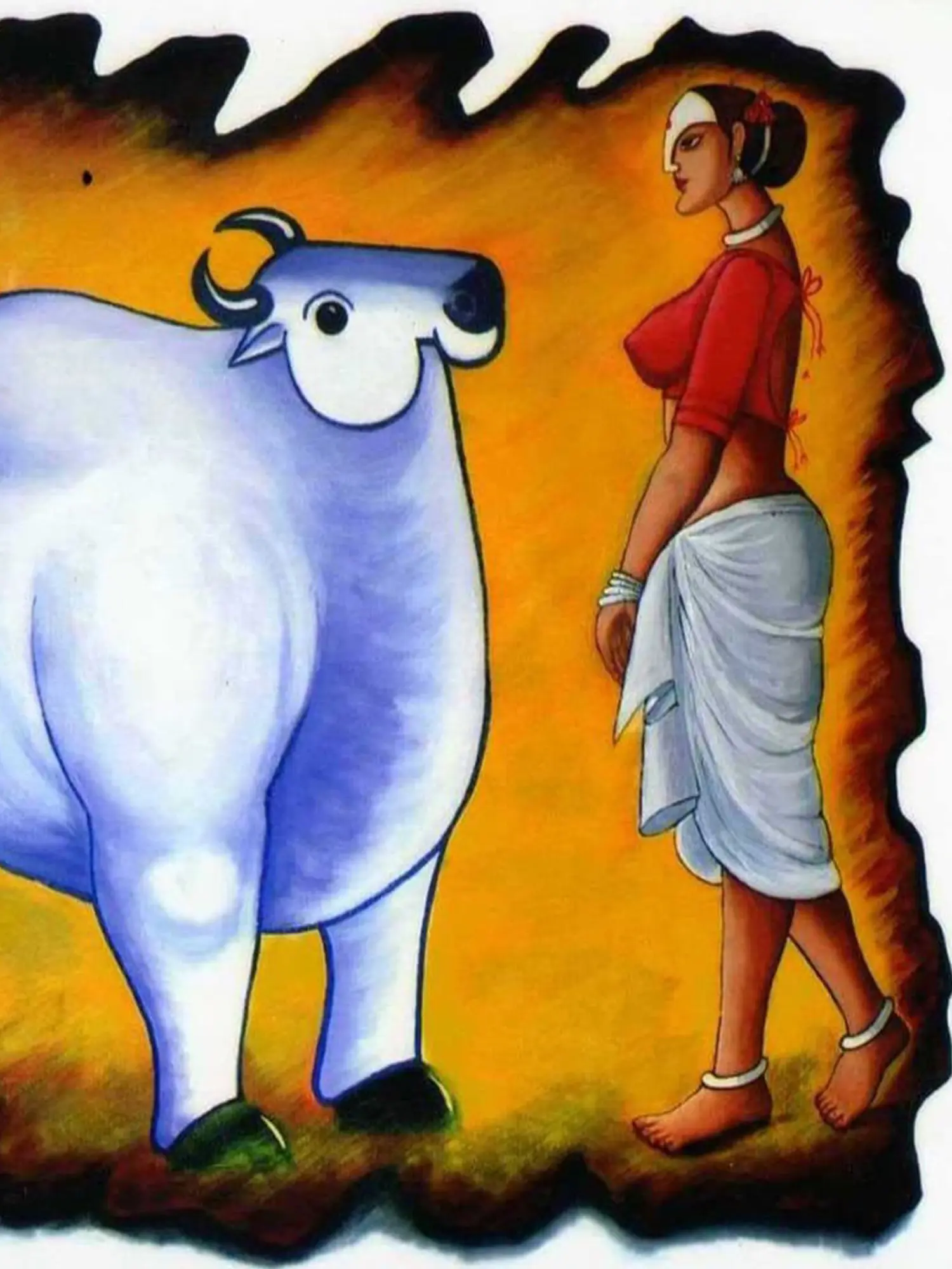 This piece resonates with the spiritual significance of the Nandi bull in Indian culture, often depicted as the divine vehicle of Lord Shiva and a symbol of devotion and loyalty. The portrayal of the woman beside this sacred creature suggests a profound connection, perhaps evoking ancient myths or everyday reverence. You'll find a depth of cultural storytelling within its vibrant composition, offering a glimpse into enduring traditions.