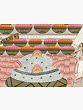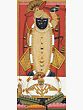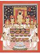 In the iconography of the main deity image, as also the main priest except some variations in his ornaments, forms of three tiny icons painted just under the main image, piling of the baskets of laddus, symbolic of food-grains, and in the style of sanctum and some of the background motifs the painting pursues the style of an early painting from Nathadwara datable to 1770-1780. Besides the main deity icon rendered pursuing exact Nathadwara art idiom, the painting also portrays three repeat smaller icons, all in varying sizes, representing Bala-Gopala, the child Krishna, whose image enshrines a subordinate seat at Nathadwara shrine. The early Nathadwara miniature, as also most others, includes symbolic icons of mother Yashoda, Balarama and Subhadra. Perhaps the image just below the main deity image is a representation of Balarama. The floral arch on its right enshrines flute-playing Krishna flanked by the icons of Yashoda and Subhadra, his sister. One on its left contains just the image of Krishna with mother Yashoda. A gold image of flute-playing Krishna wearing a two-tiered crown enshrines the vertical space on the extreme left to the main deity image; and on the extreme right, there is another gold-icon of the flute-playing Krishna with tiny icons of mother Yashoda and Subhadra. Besides the main priest, the painting incorporates five subordinate priests, one with a fan and other four with ‘chowris’, one of them being a woman.