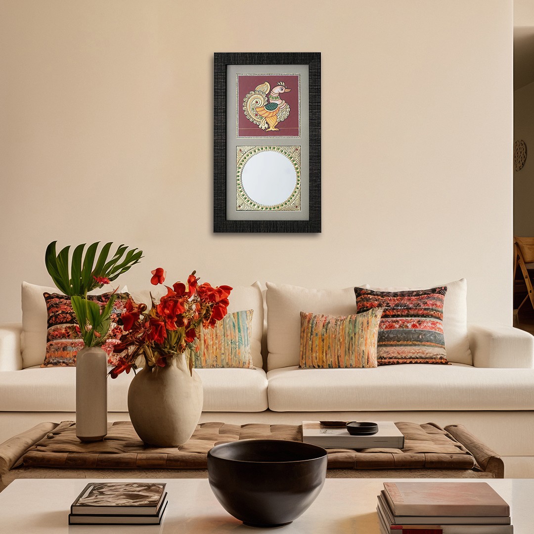 The Annam, adorned in vibrant hues, spreads its wings in this Tanjore painting, breathing life into tradition. Traditional colours, embellished with stones and the opulence of 24 karat gold, weave a tapestry of vibrant beauty. The Annam, a symbol of purity and grace, gazes into the mirror, and in its reflection, we see a fusion of colours and light that ignites the soul. As you contemplate this piece of art, let it remind you of the kaleidoscope of life's colours and the beauty that comes from embracing every shade of experience.