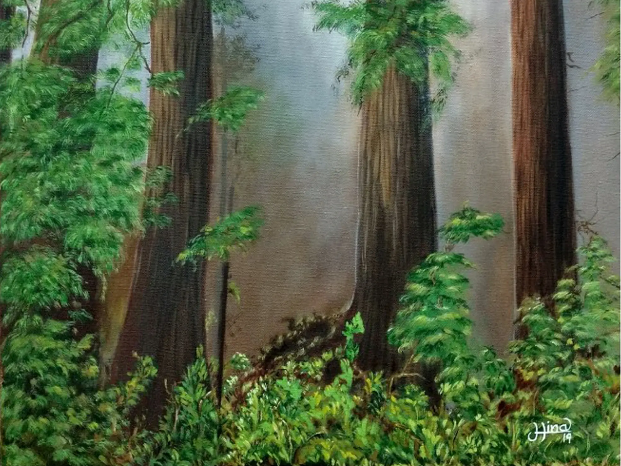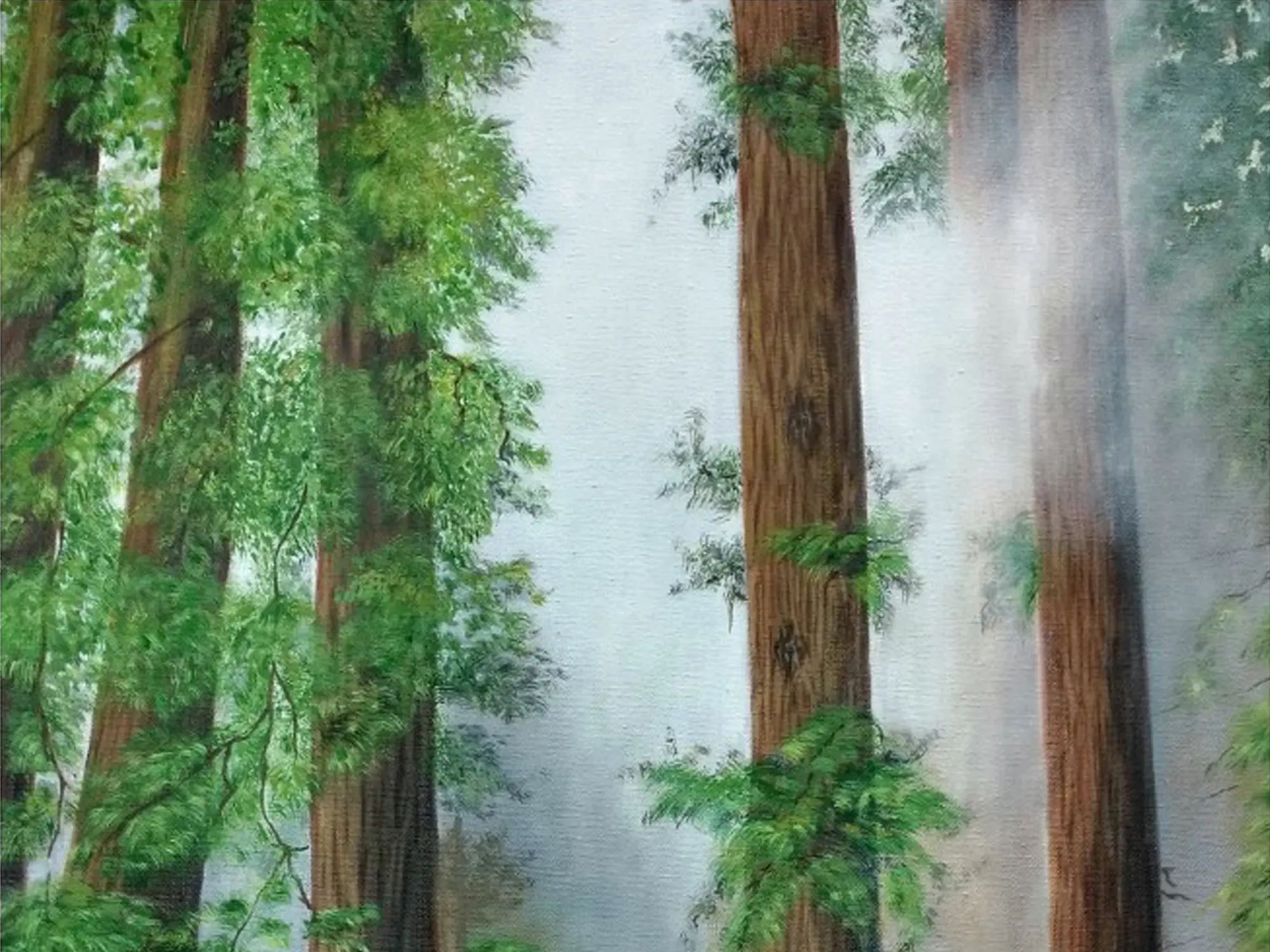 Rendered with exquisite skill using acrylics on canvas, this piece showcases the artist's profound connection to the natural world. Each brushstroke meticulously builds layers of texture and depth, from the sturdy bark of towering trees to the delicate fronds of ferns. The artist’s technique ensures a vibrant yet ethereal portrayal, where light and shadow play in perfect harmony, breathing life into the scene.