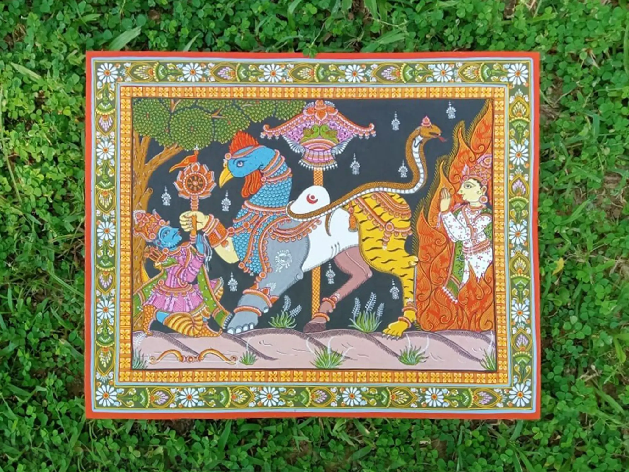 This piece is brought to life using the traditional technique of stone color painting on an original 'Pati' surface. Each stroke of mineral-based pigment is applied with deliberate care, drawing from generations of artisanal knowledge. The unique texture of the Pati provides a subtle depth, enhancing the richness of the colors and the intricate details of the composition. You'll appreciate the authentic feel and the enduring quality that comes from such dedicated handcrafting.