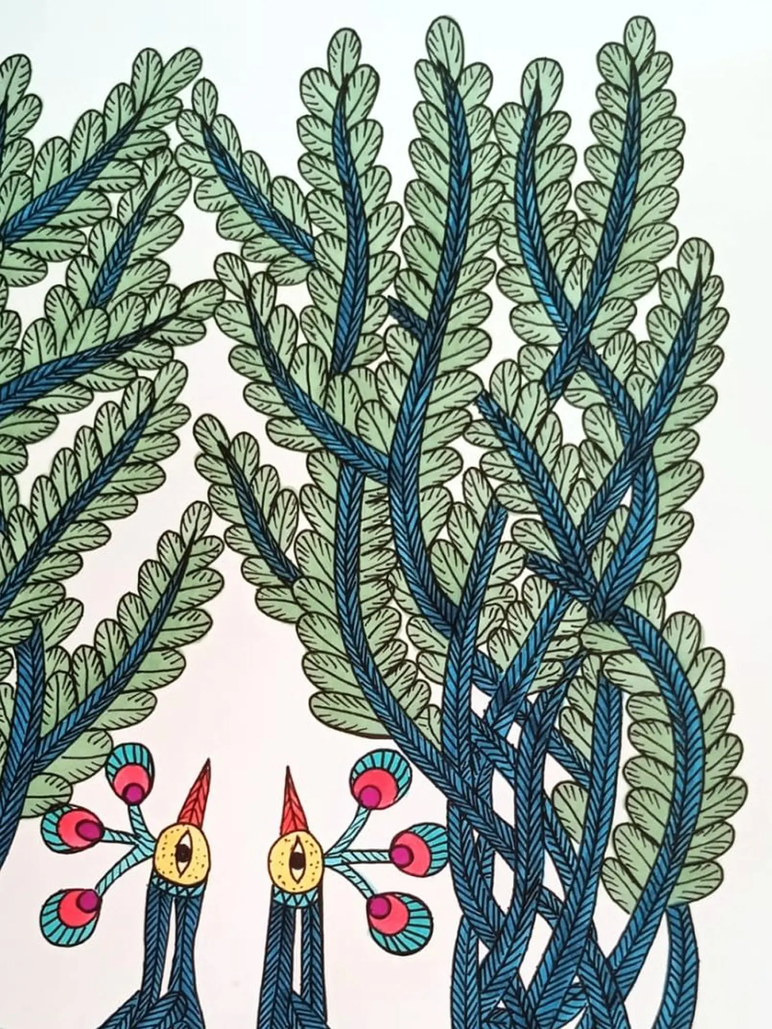 Ruchi employs alcohol markers and fineliners on paper to bring this vision to life. The alcohol markers provide vibrant, rich colors that capture the eye, while the fineliners allow for meticulous detailing essential in Gond Art. The use of these modern tools enhances the traditional style, adding depth and clarity to the intricate patterns. The flowing lines and vivid hues highlight the natural harmony and elegance of the scene, making the artwork both visually captivating and symbolically profound.