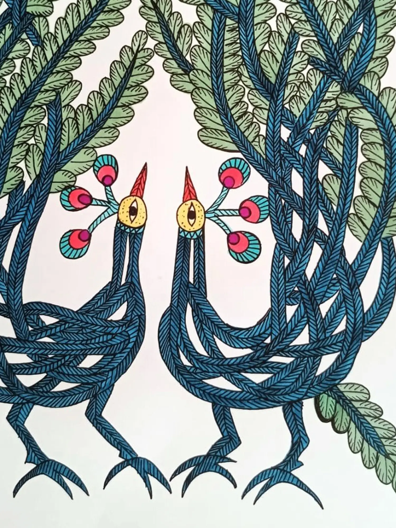 Ruchi’s Gond Art, featuring a pair of peacocks with tails that seamlessly grow into trees, is a striking depiction of nature's unity and continuity. This artwork symbolizes the interconnectedness of life, where animals and plants are inextricably linked, reflecting the fundamental principle that all living beings are part of a greater whole. The peacocks, often symbols of beauty and renewal, merging with trees, represent the cyclical nature of life and the interdependence essential for ecological balance.