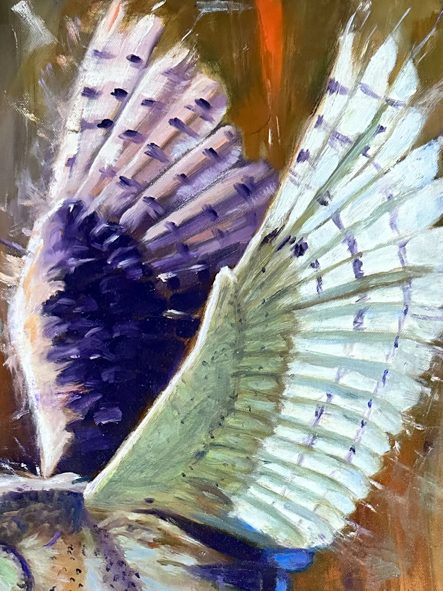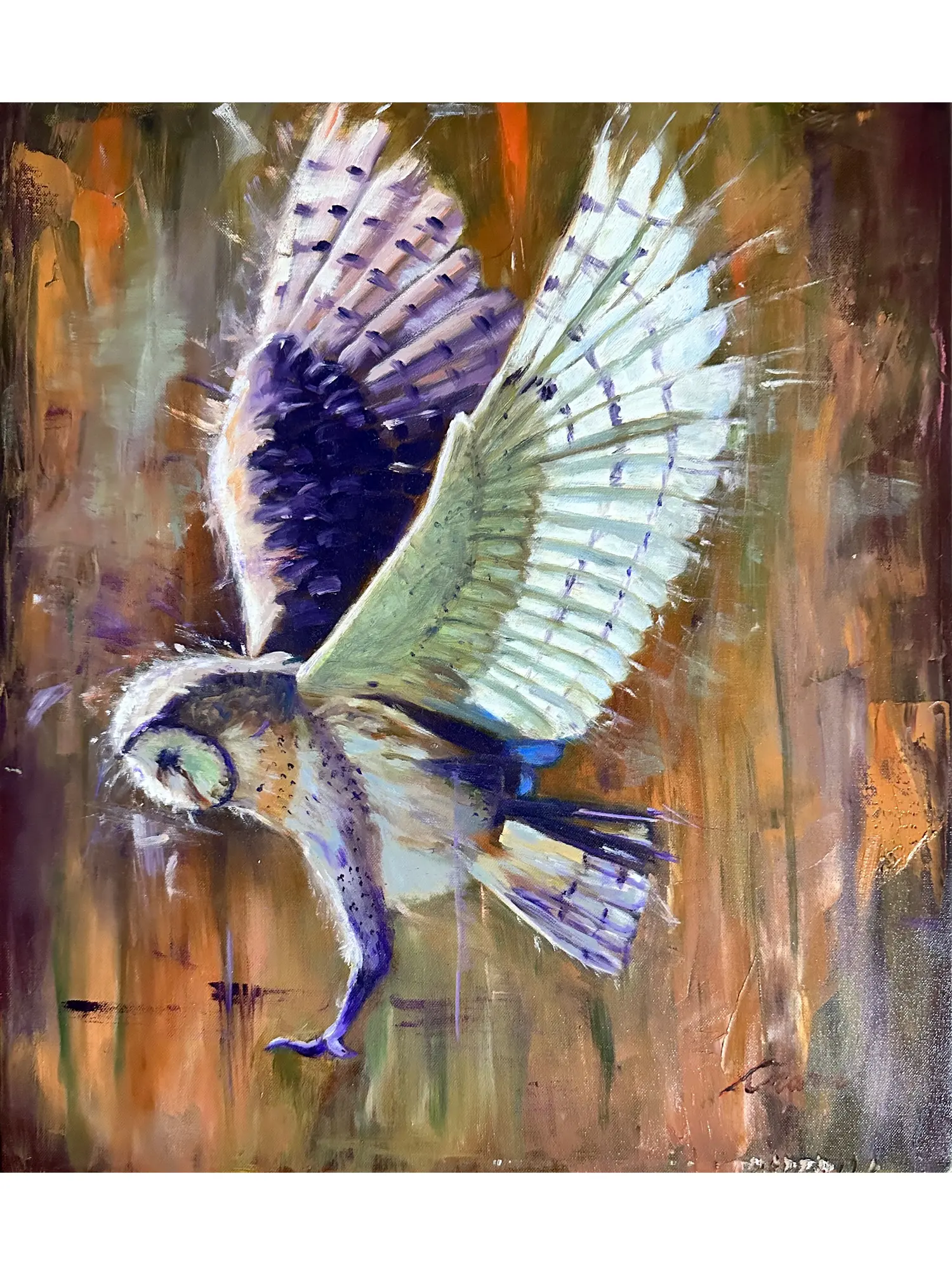 This breathtaking oil on canvas painting, "Ascent - The Flying Bird," captures the raw power and ethereal beauty of a barn owl in mid-flight. Charulata Sridhar’s masterful brushstrokes bring the owl to life, its wings a whirlwind of delicate whites and purples, set against a rich, textured background evoking the mystery of the twilight hour. The owl, depicted in dynamic motion, seems to effortlessly defy gravity, its presence both fierce and graceful. The size of the painting, 18 inches in height and 16 inches in width, makes it a stunning focal point for any room, bringing the vibrant energy of the natural world indoors.