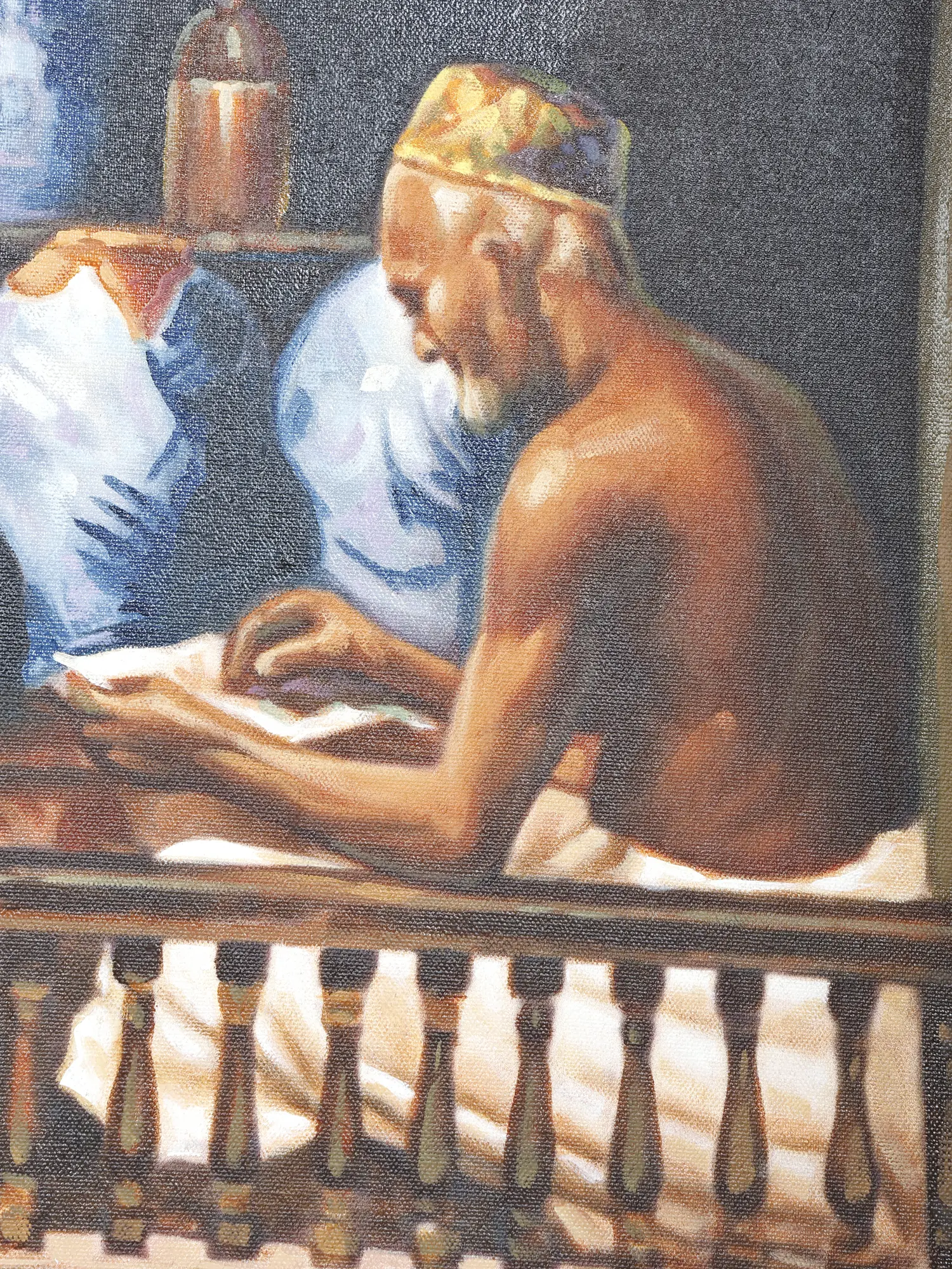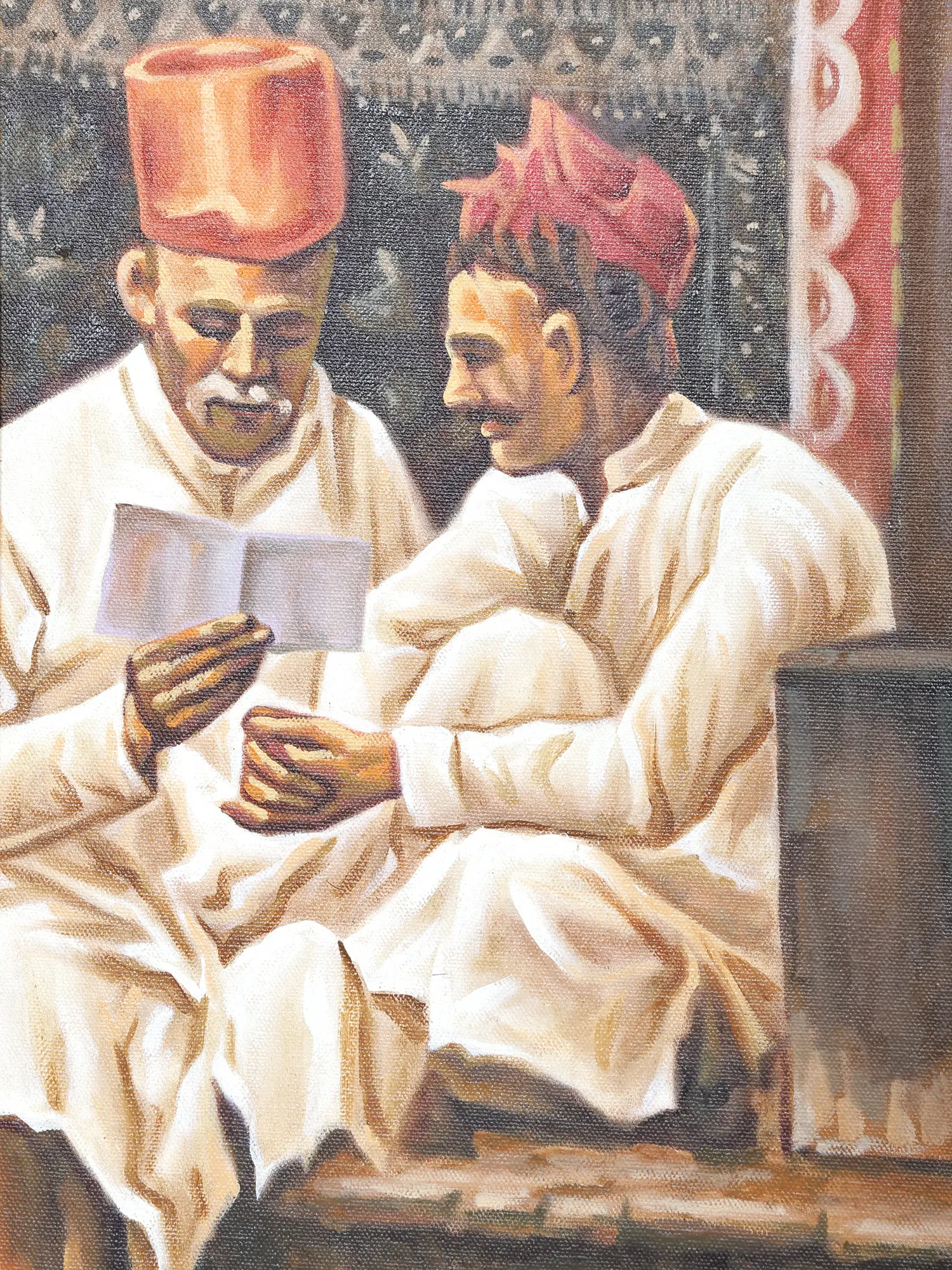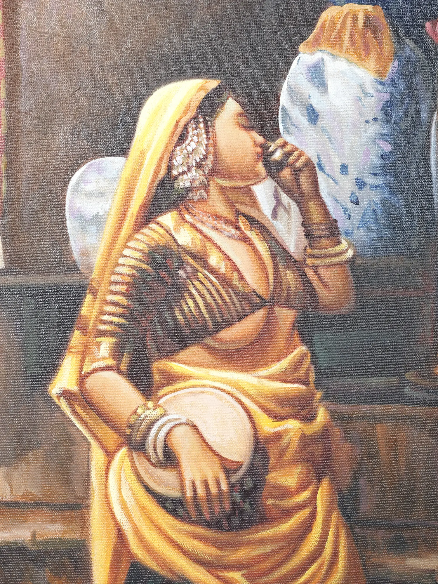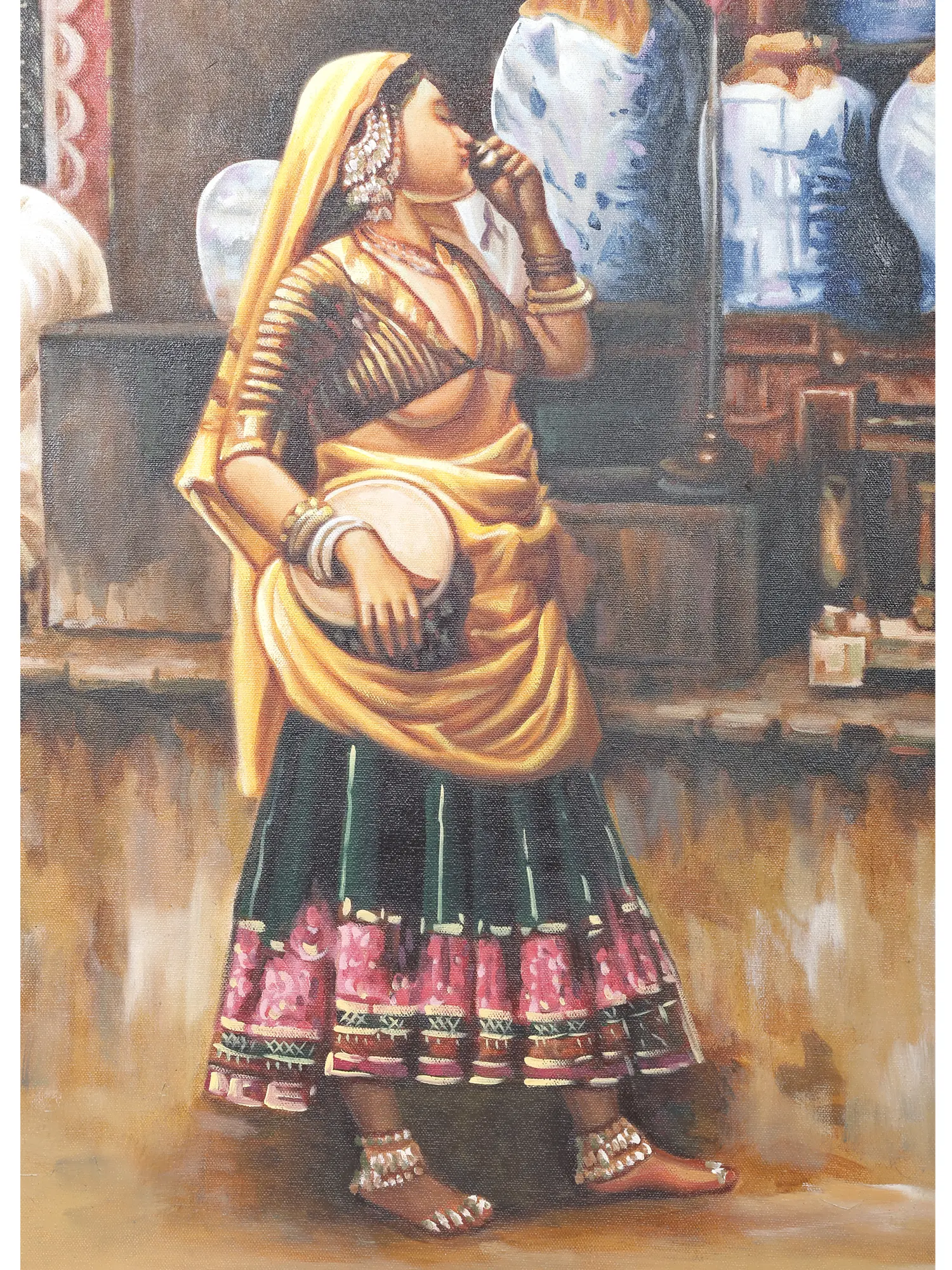 Her feet are naked but for the copious proportions of silver round her ankles and toes, a hint of which peers out from underneath her lasciviously draped odhni (note how it reveals rather than conceals her matronly bosom). She's dressed in the locally produced ghagra of the Northwestern desert region, and carries in her hand a tambourine that she thumps on to earn her bread. The rest of the men in the frame pay no attention to her - they are used to her presence, having probably seen as much of her as there is to be seen. The surreal appeal of the painting is complemented by the realistically portrayed earth that dominates a major part of the foreground.