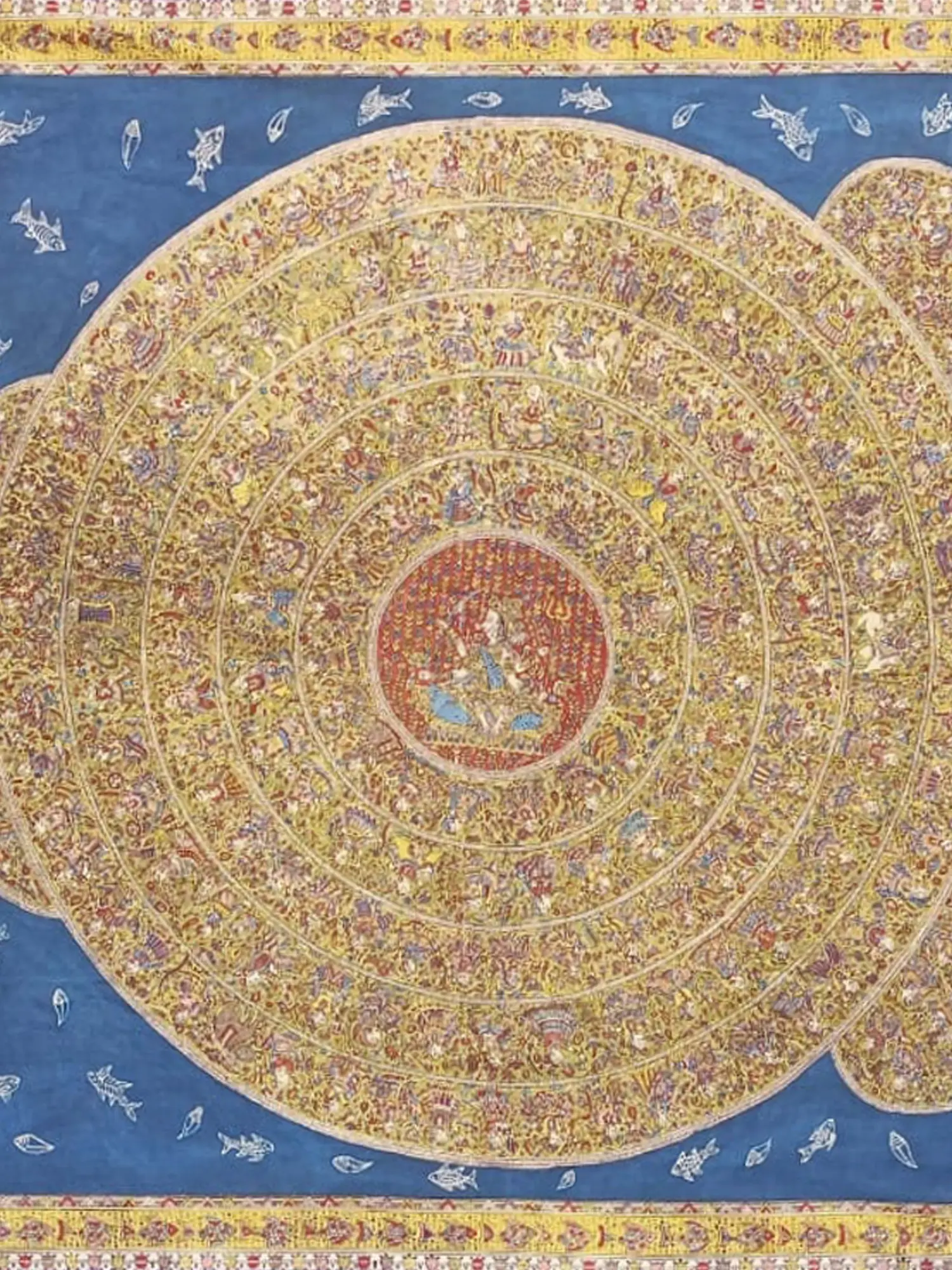 The expansive scale of this artwork, measuring a generous 44 inches in height and 60 inches in width, allows for an immersive viewing experience. You’ll be captivated by the immense central motif, a radiant cosmic turtle encircled by a dizzying array of miniature scenes and figures. The rich, deep blue background, dotted with delicate fish, provides a celestial backdrop, making the golden hues of the turtle and its intricate patterns truly luminous. The border, adorned with its own detailed motifs, frames the composition with exquisite precision, further enhancing its visual impact.