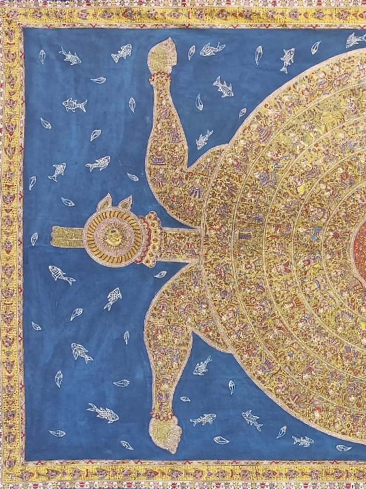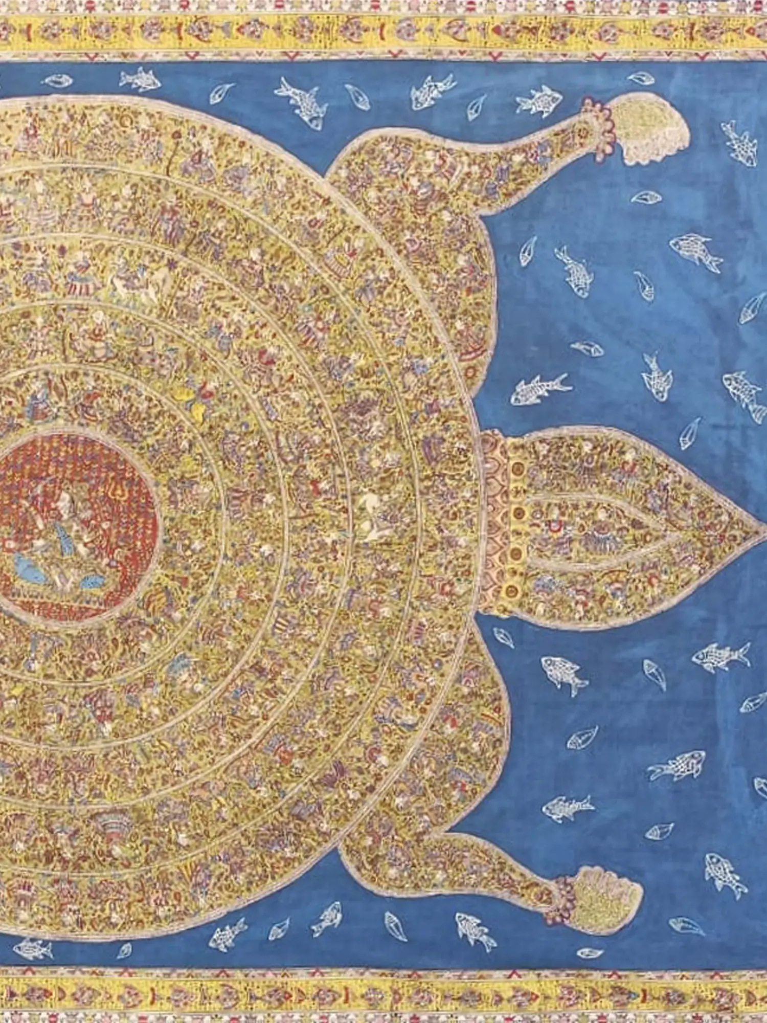 This creation is a profound example of Mata Ni Pachedi art, a sacred tradition of textile painting from Gujarat, India. Often depicting tales and deities from Hindu mythology, these works historically served as temple hangings. The cosmic turtle itself is a powerful symbol, deeply rooted in creation myths, representing the foundation upon which the universe rests. This particular rendition offers a unique perspective, potentially aligning with concepts of Avatars or the cyclical nature of existence.