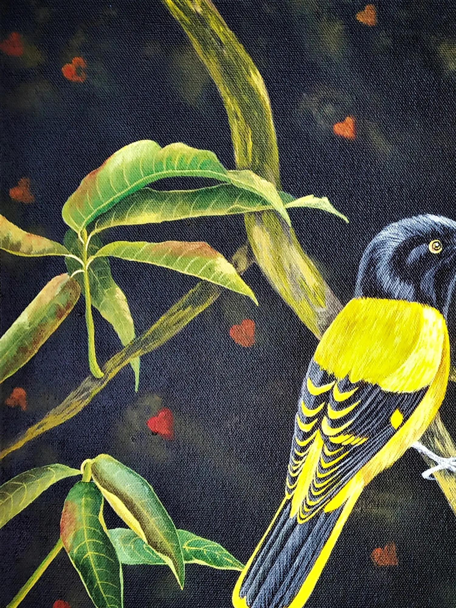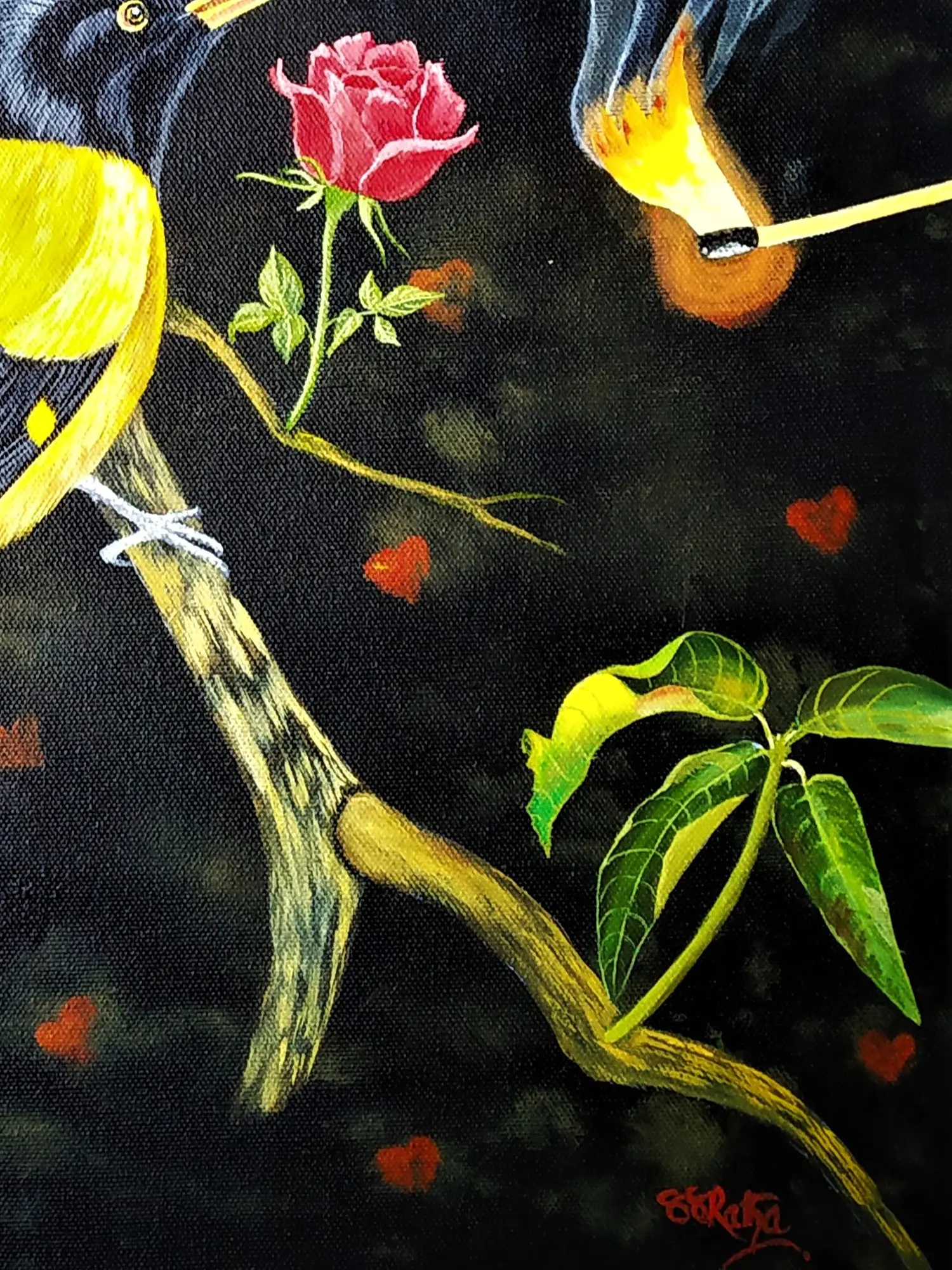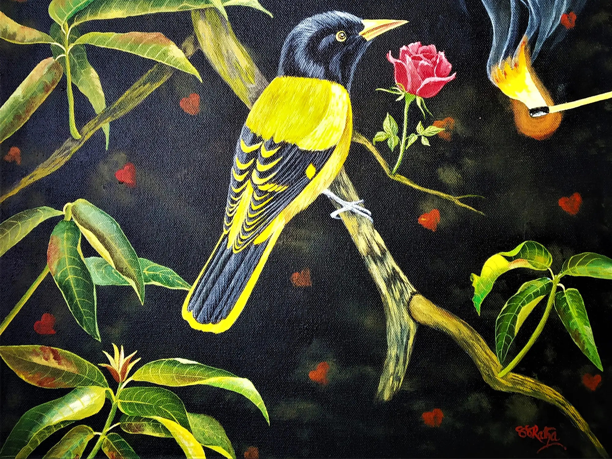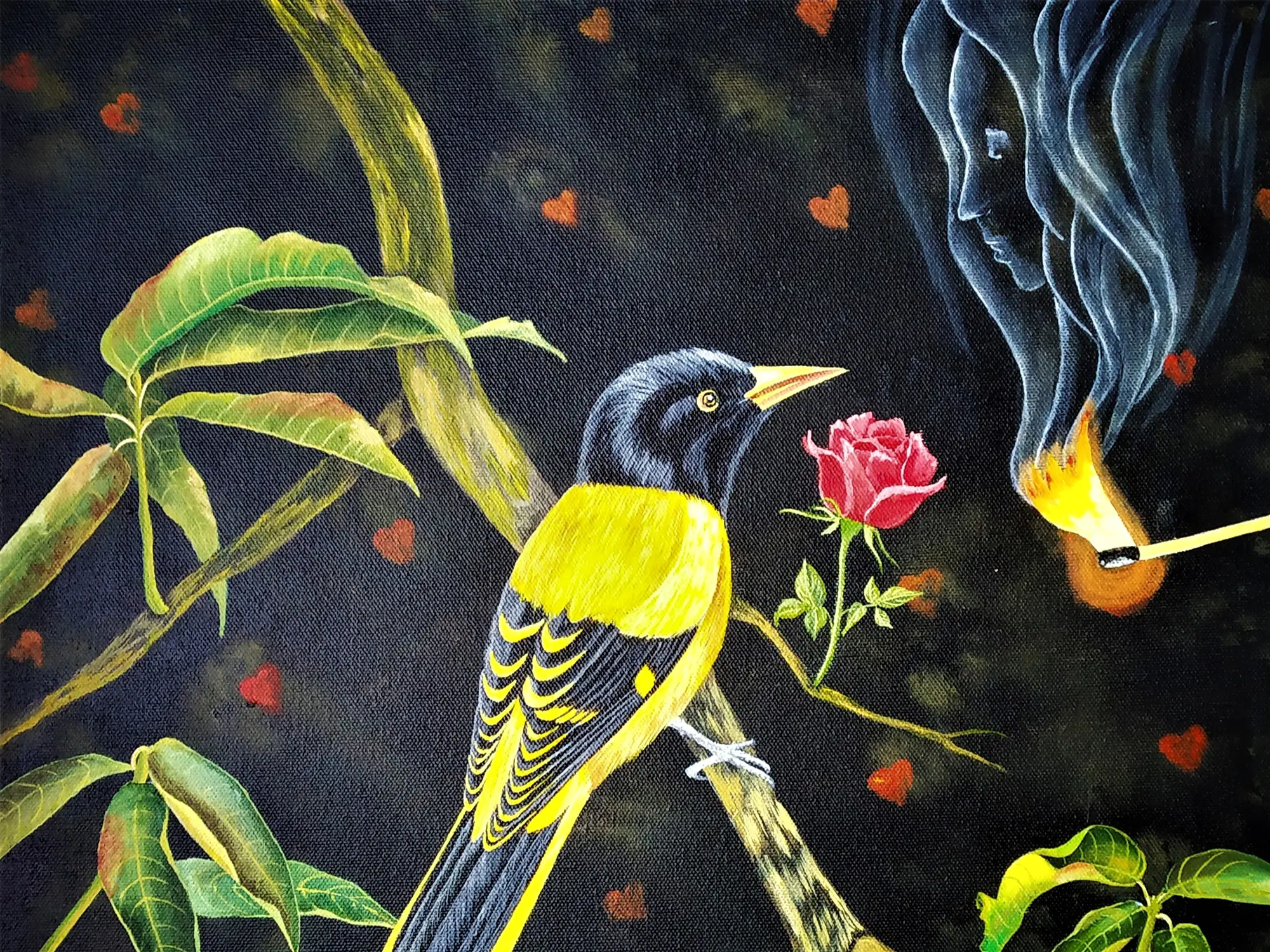Observe the exquisite detail in the vibrant plumage of the perched bird, its yellow and black feathers rendered with meticulous care. The subtle blush of the rose, poised on a slender stem, offers a counterpoint of delicate femininity against the dark, textured background. The composition draws your eye from the watchful gaze of the avian subject to the wisps of smoke forming ethereal, human-like profiles, hinting at untold stories and unspoken desires.