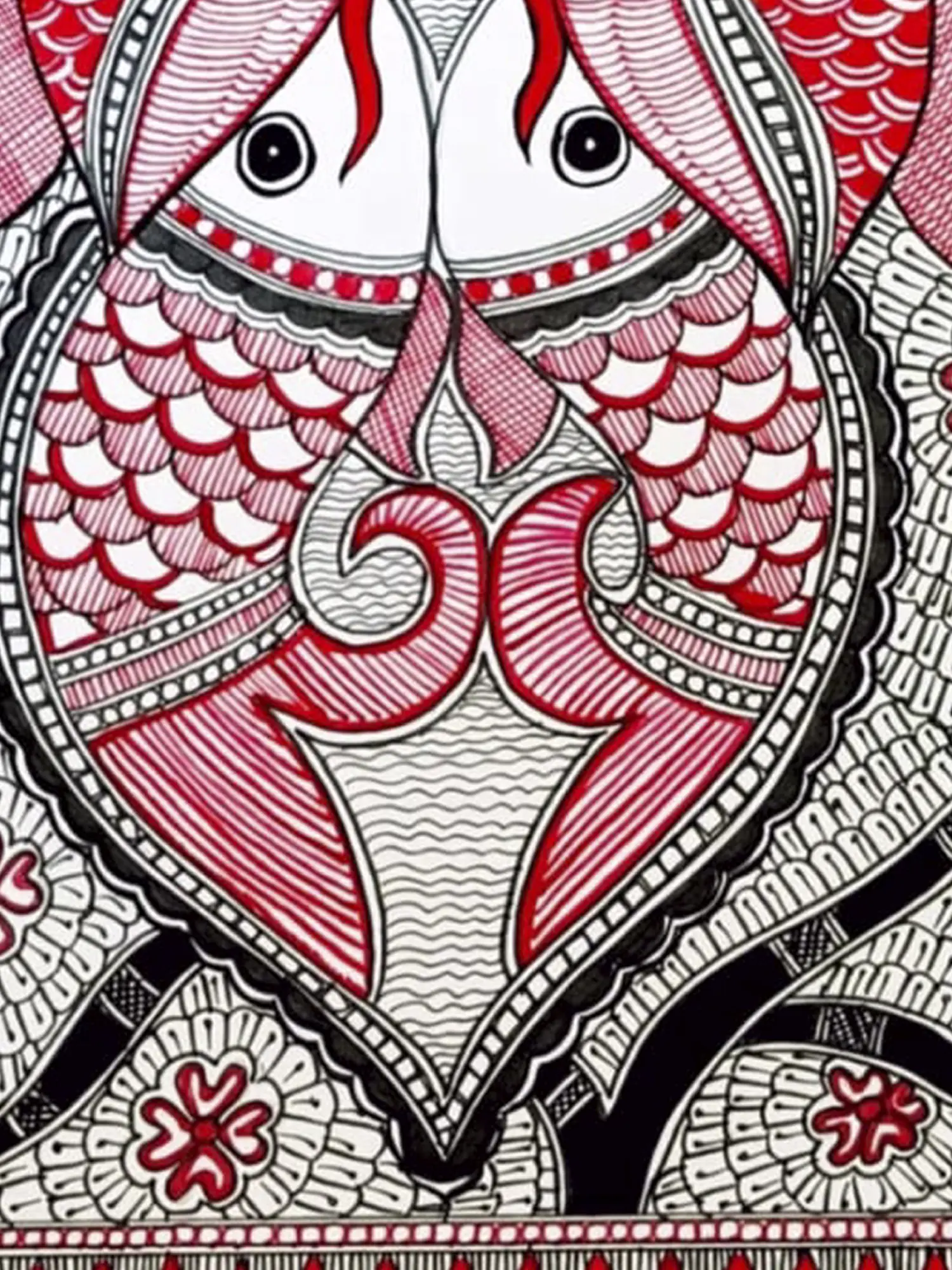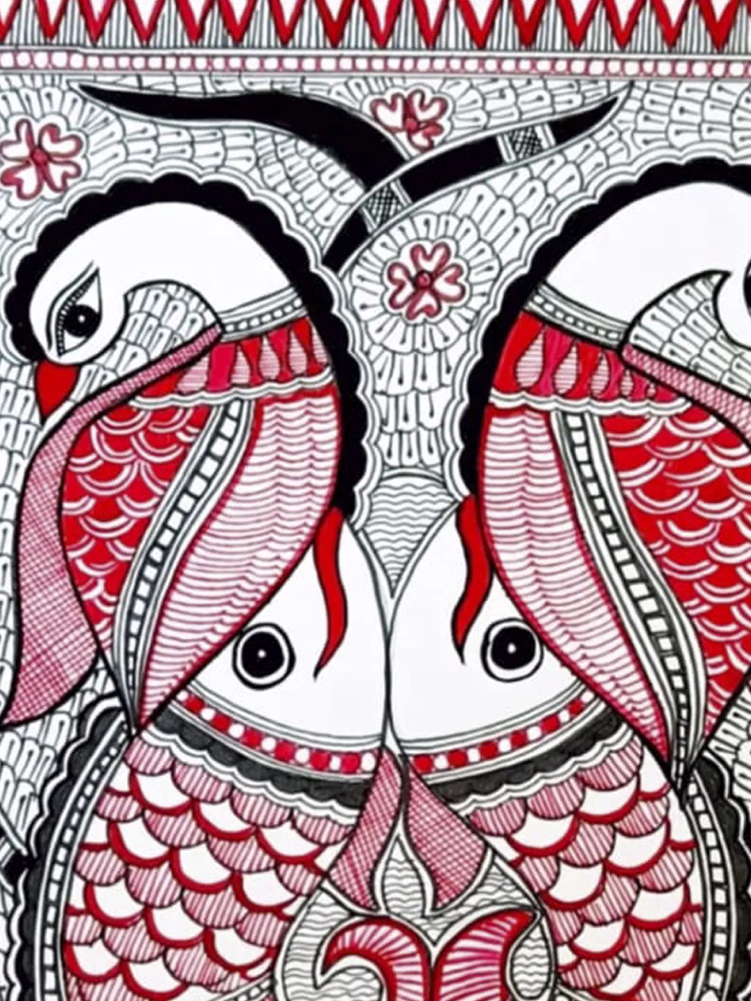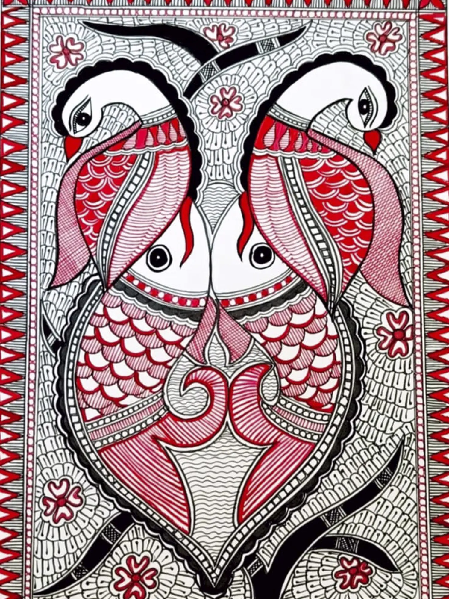 Muskan's captivating Madhubani painting on handmade paper unveils a mesmerizing underwater world where two enchanting fish gracefully face each other. The artist skillfully employs acrylic to evoke the vibrancy of aquatic life. Adorning the fish are regal peacocks, intricately depicted with stunning plumage. The composition, rich in symbolism, harmoniously blends the elements of nature. Muskan's deft use of red and black lines imparts a simplistic elegance, enhancing the traditional Madhubani style. This masterpiece invites viewers into a realm where the convergence of aquatic beauty and avian grace unfolds on a canvas of cultural heritage and artistic finesse.