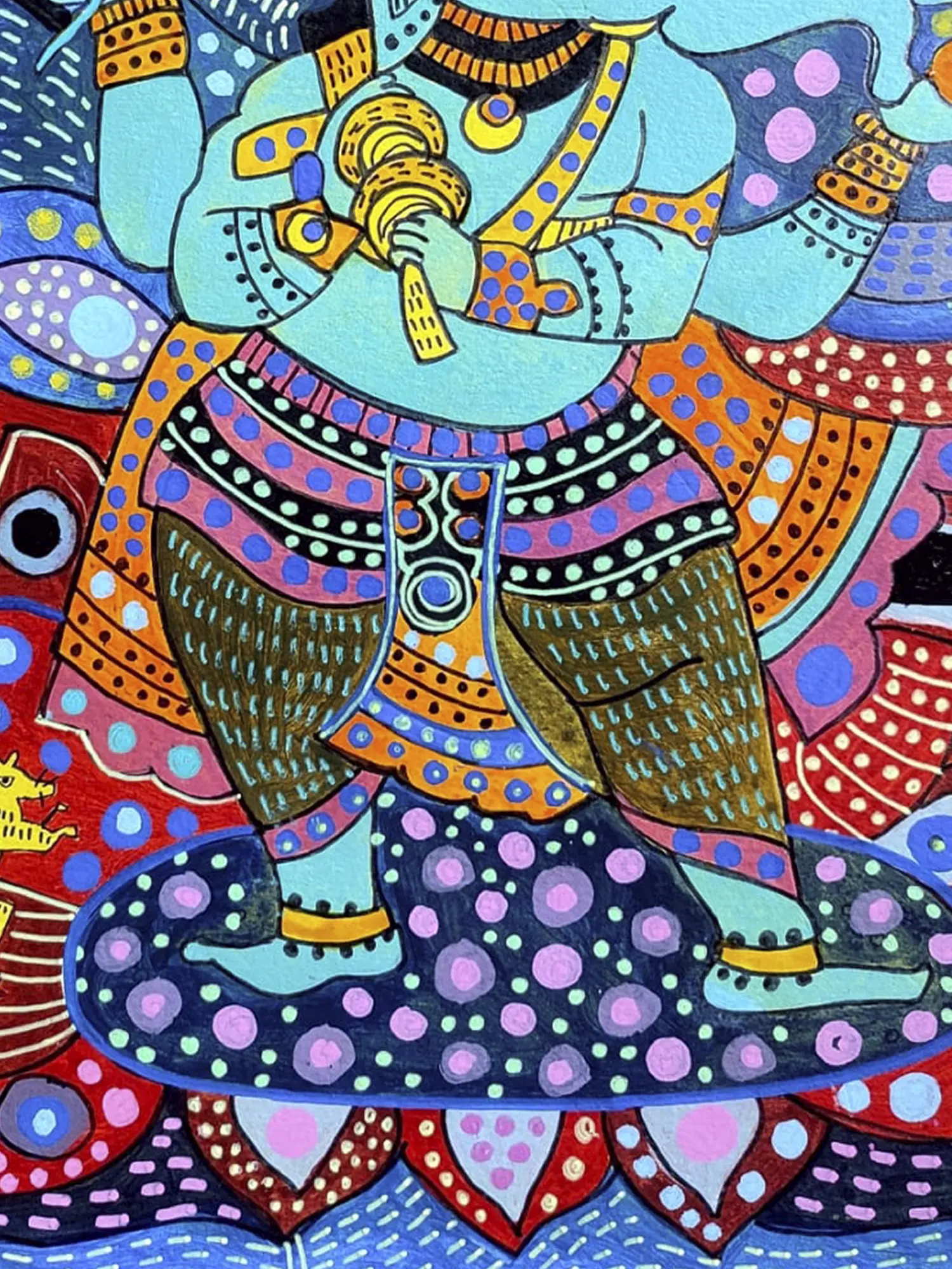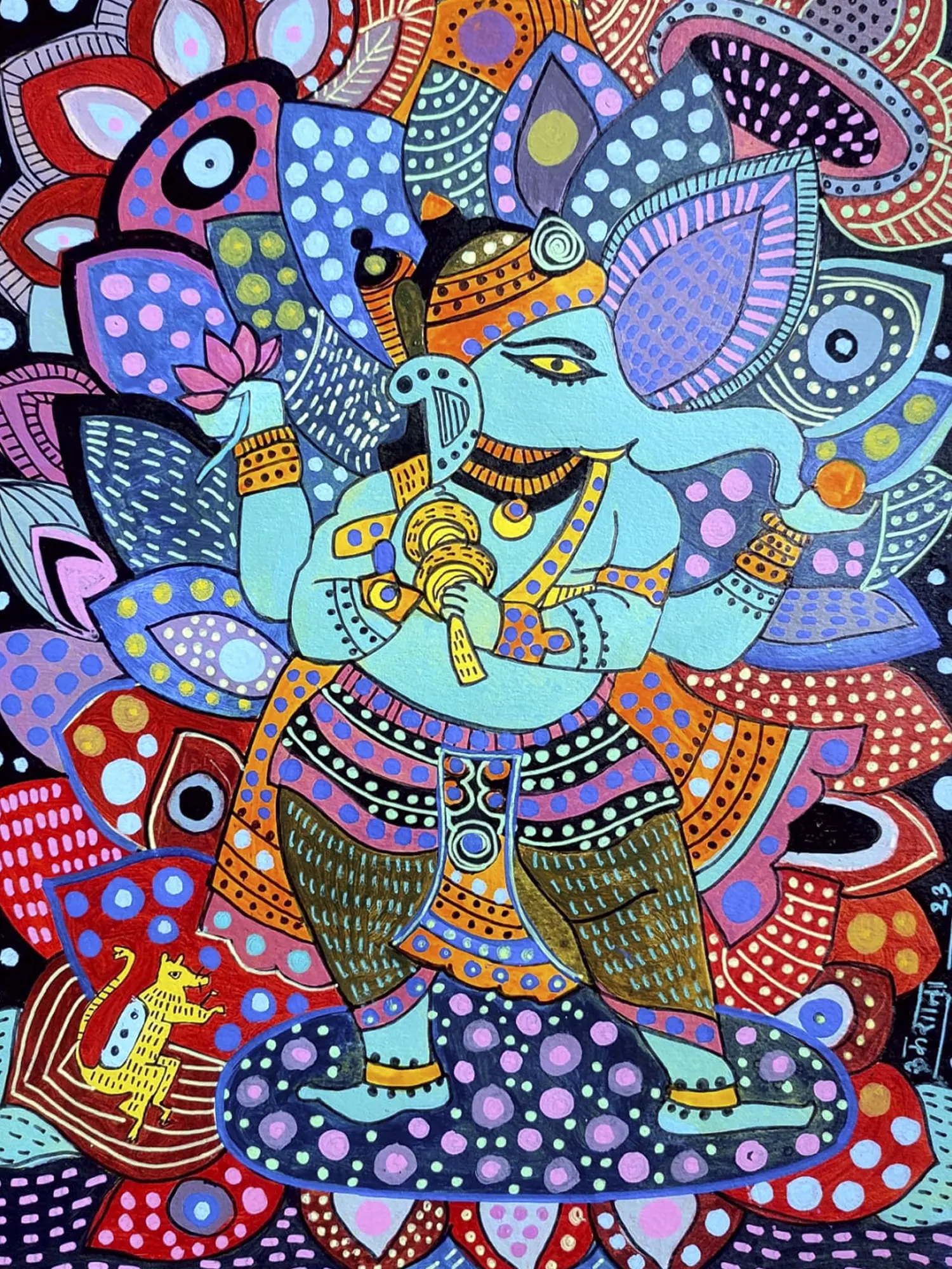 This artwork draws inspiration from the revered Hindu deity Ganesha, the remover of obstacles and the god of beginnings. The artist's contemporary interpretation imbues this ancient symbolism with a fresh, spirited perspective. The surrounding patterns subtly echo mandalas and traditional Indian decorative arts, creating a layered narrative for those who appreciate cultural depth.