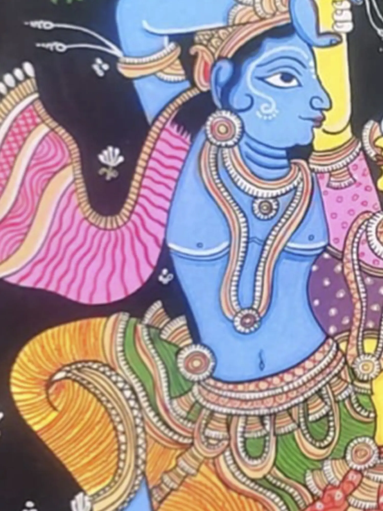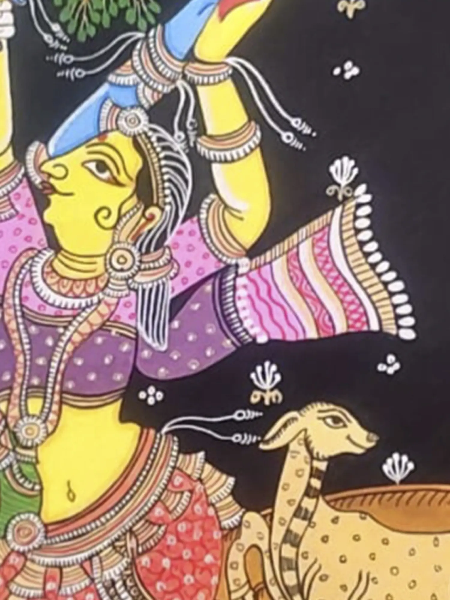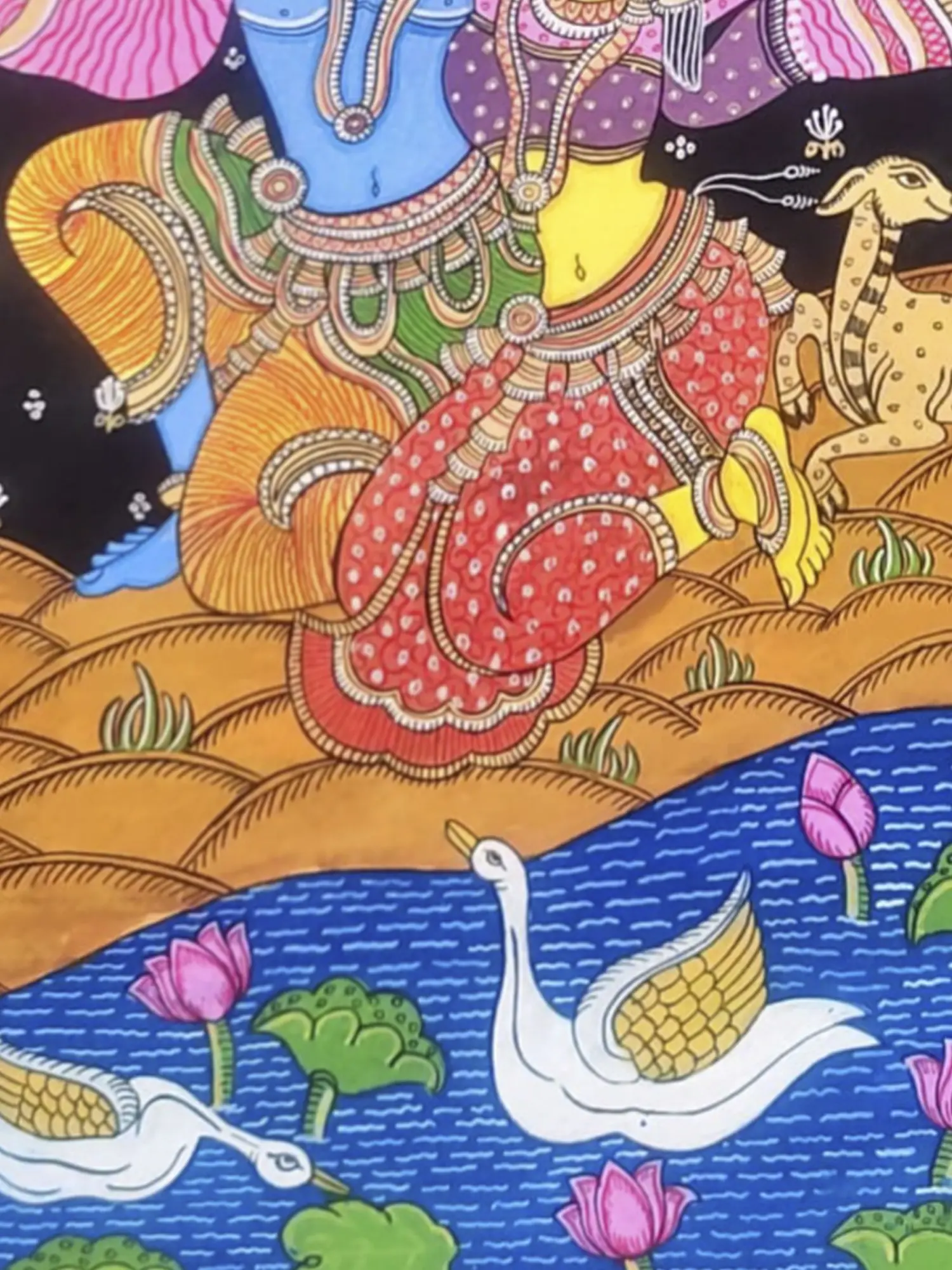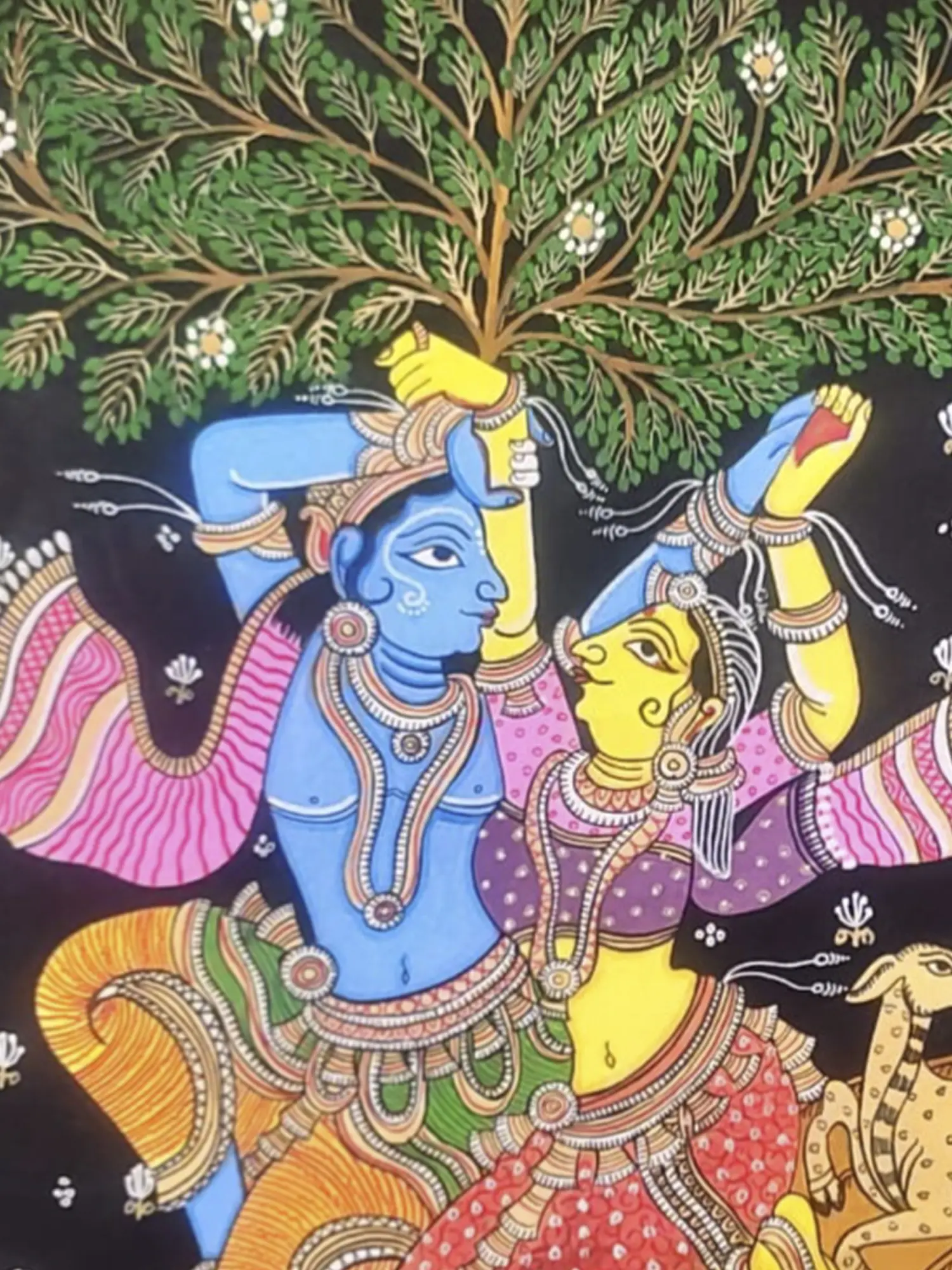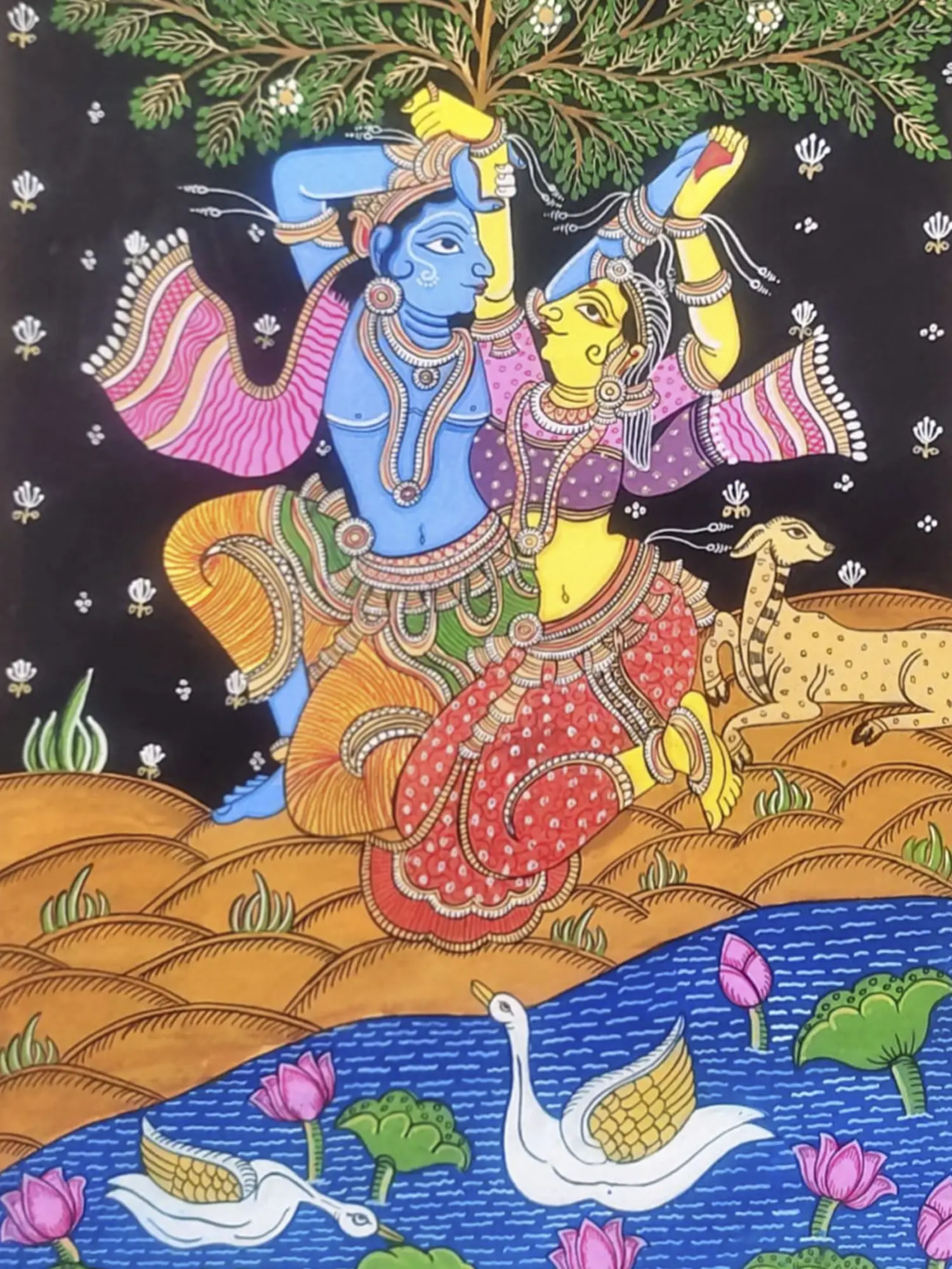 This enchanting Pattachitra painting depicts the timeless romance of Radha and Krishna amidst the serene beauty of a lakeside setting. Made with watercolours on paper, the artwork exudes a sense of ethereal beauty and divine love. Radha and Krishna's tender embrace and longing glances mirror the eternal tale of love and devotion. Each brushstroke captures the essence of their timeless bond, inviting viewers into a world of sublime bliss and spiritual ecstasy.