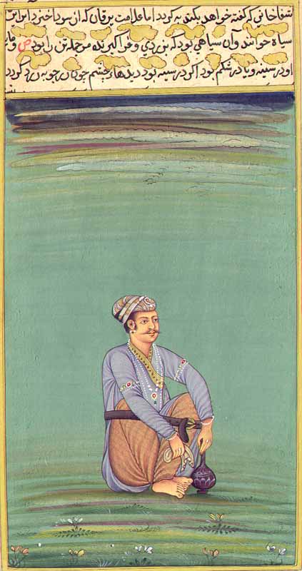 In this painting, the man observing austerity as per the custom is seen seated on bare land. Tying himself with a belt to provide steadiness to his posture, the man is sitting in a yogic disposition. He, who is supposed to have given up on luxuries of life is still dressed in rich clothes and strings of pearls. He wears a turban, though not ostentatious, yet color-coordinated with his clothes. Holding a wine casket in hand, he is finding it difficult to give up on the good things in life he is accustomed to. There is, however, a determined look on his face as he looks straight ahead.