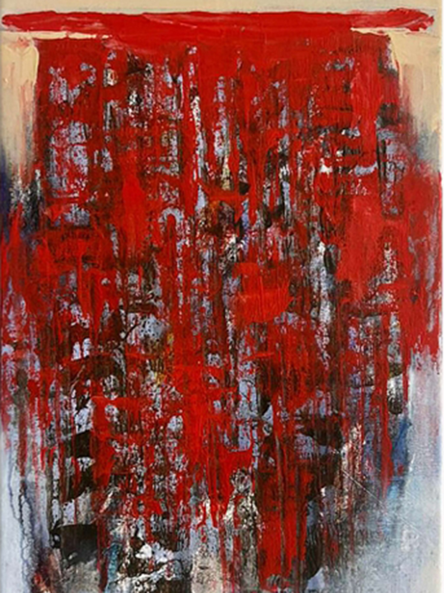 Rich texture created through dynamic brushstrokes and mixed media techniques.