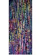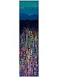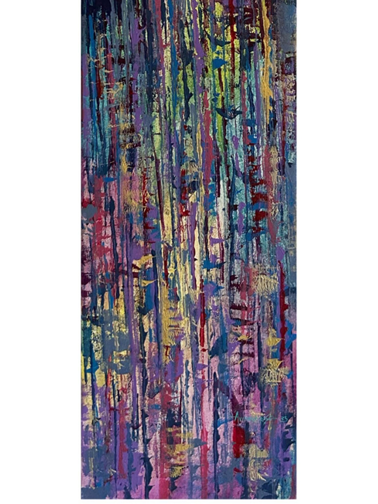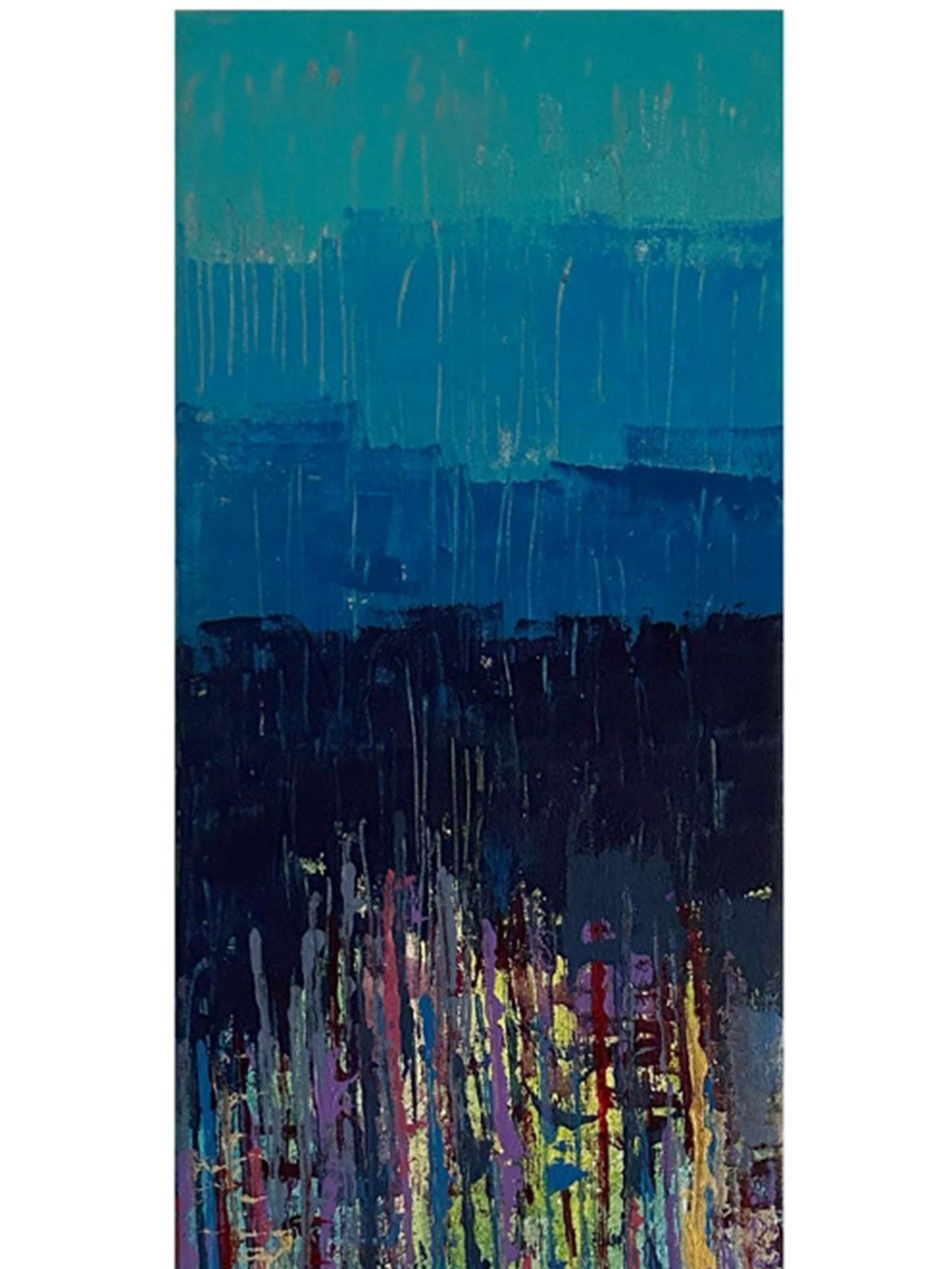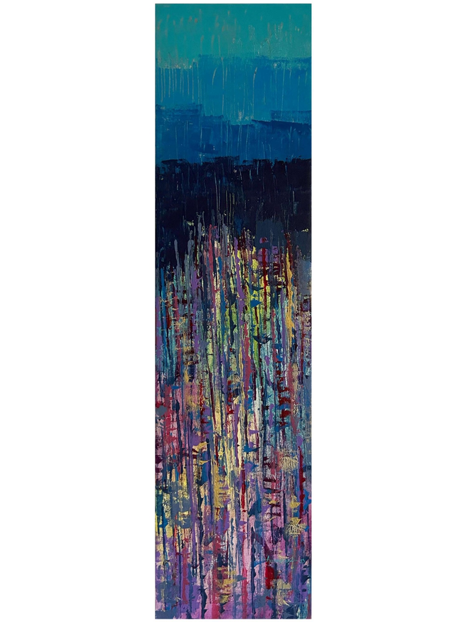 The composition unfolds in vertical bands, beginning with a serene expanse of teal and progressing through deepening shades of blue, evoking the vastness of the sky or the depths of the ocean. As your gaze descends, a vibrant eruption of abstract forms emerges, a dynamic collision of purples, pinks, yellows, and blues, interspersed with glints of gold. This visual dynamism, spanning 48 inches in height and 12 inches in width, creates a captivating narrative that is both energetic and harmonious.