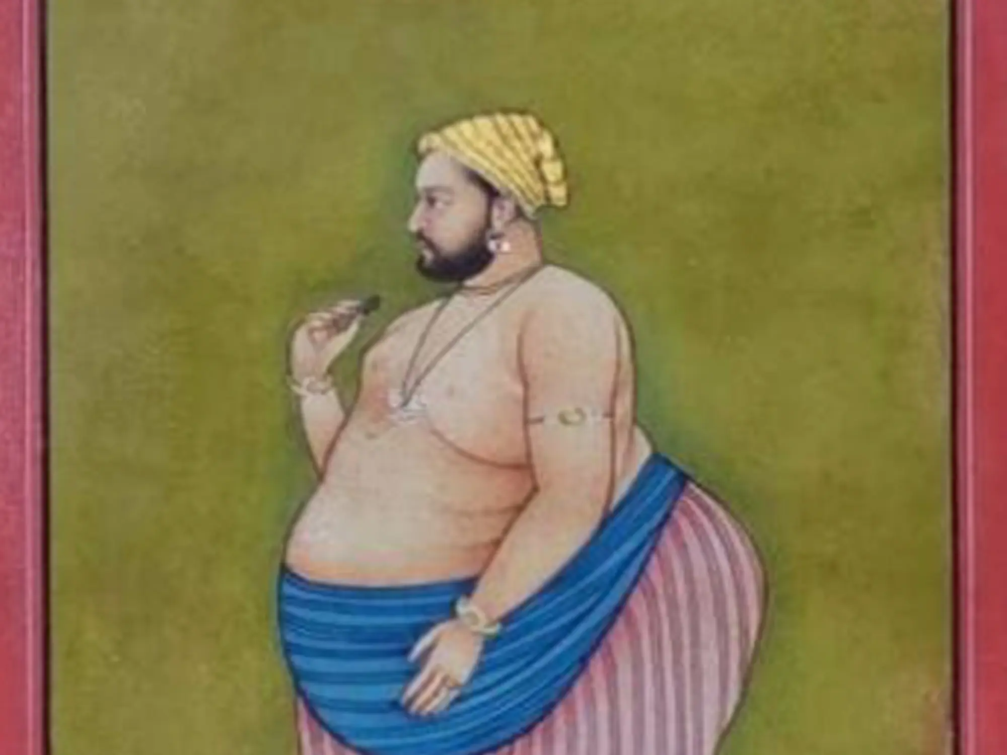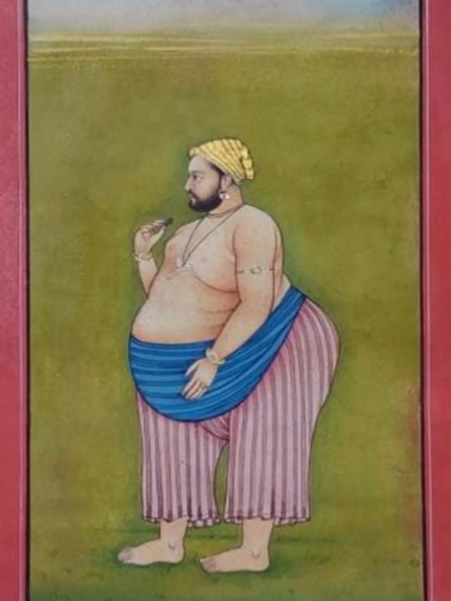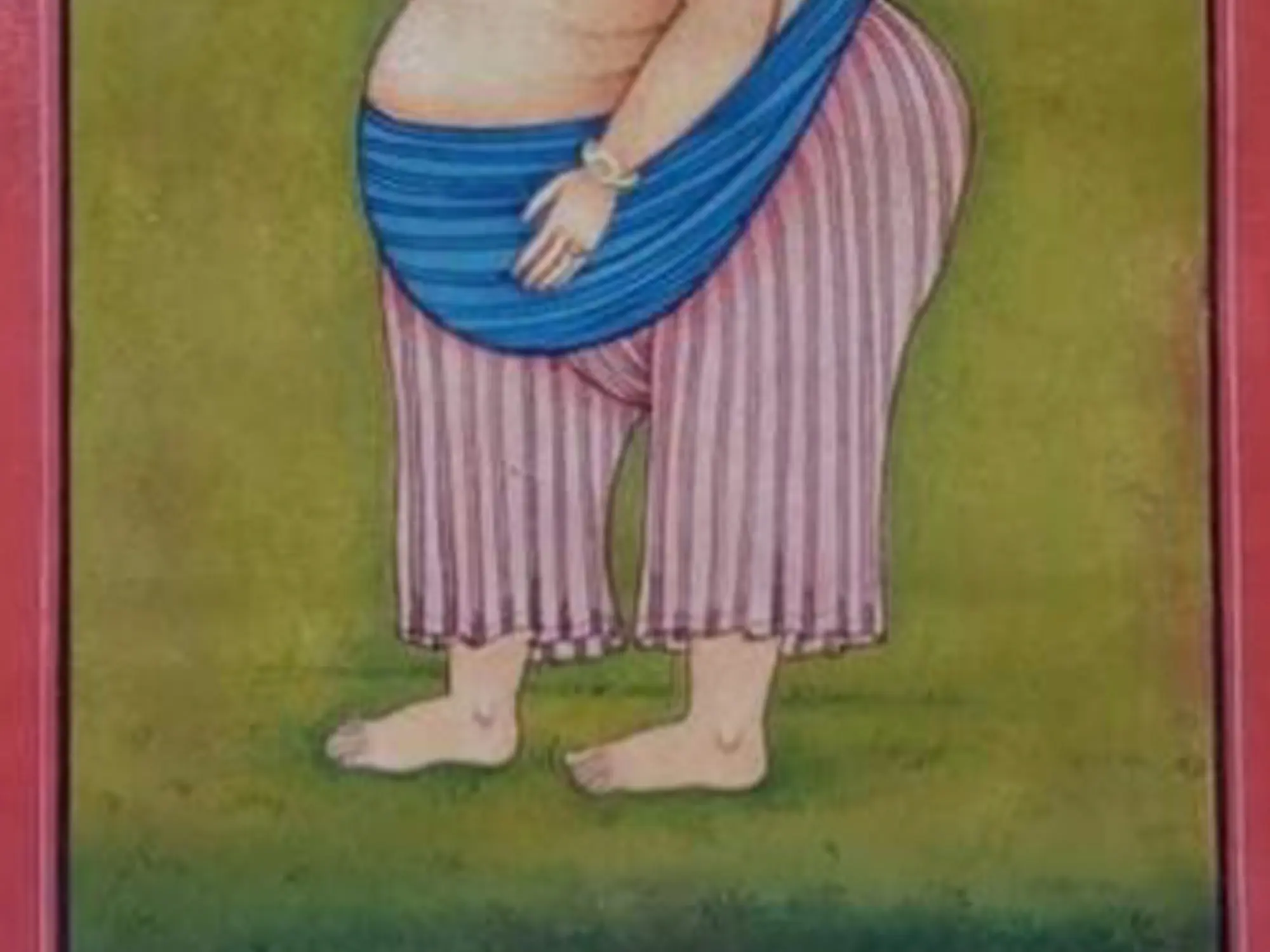 Historical context reveals that Baba Bharath Singh was implicated in a plot to overthrow Maharana Jagat Singh II and seize the throne in the late 1740s. The actual painting also comes with another one that shows him fully dressed. These paintings may have been commissioned to humiliate him for his treacherous actions, serving as a visual reminder of his downfall and loss of stature within the court.