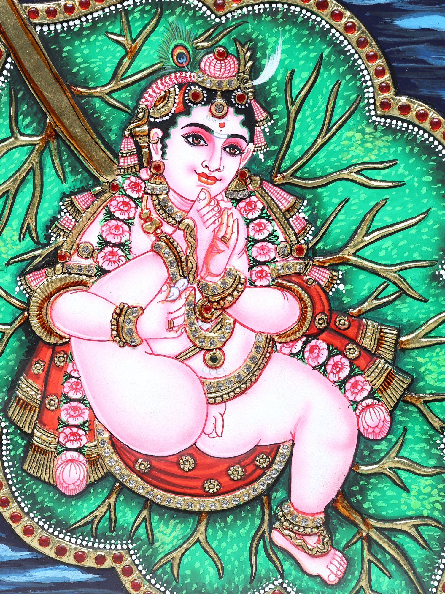 28" Little Krishna Eating Butter Tanjore Painting | Traditional Colors With 24K Gold
